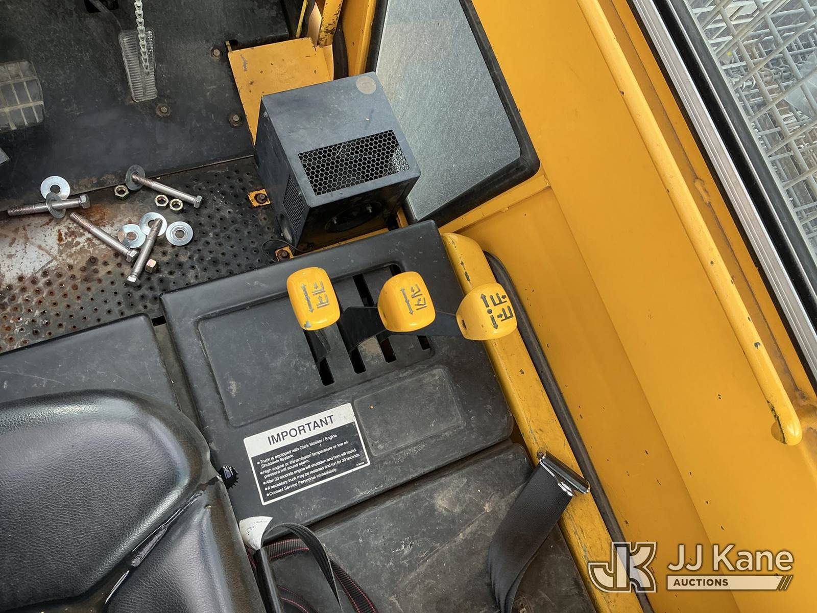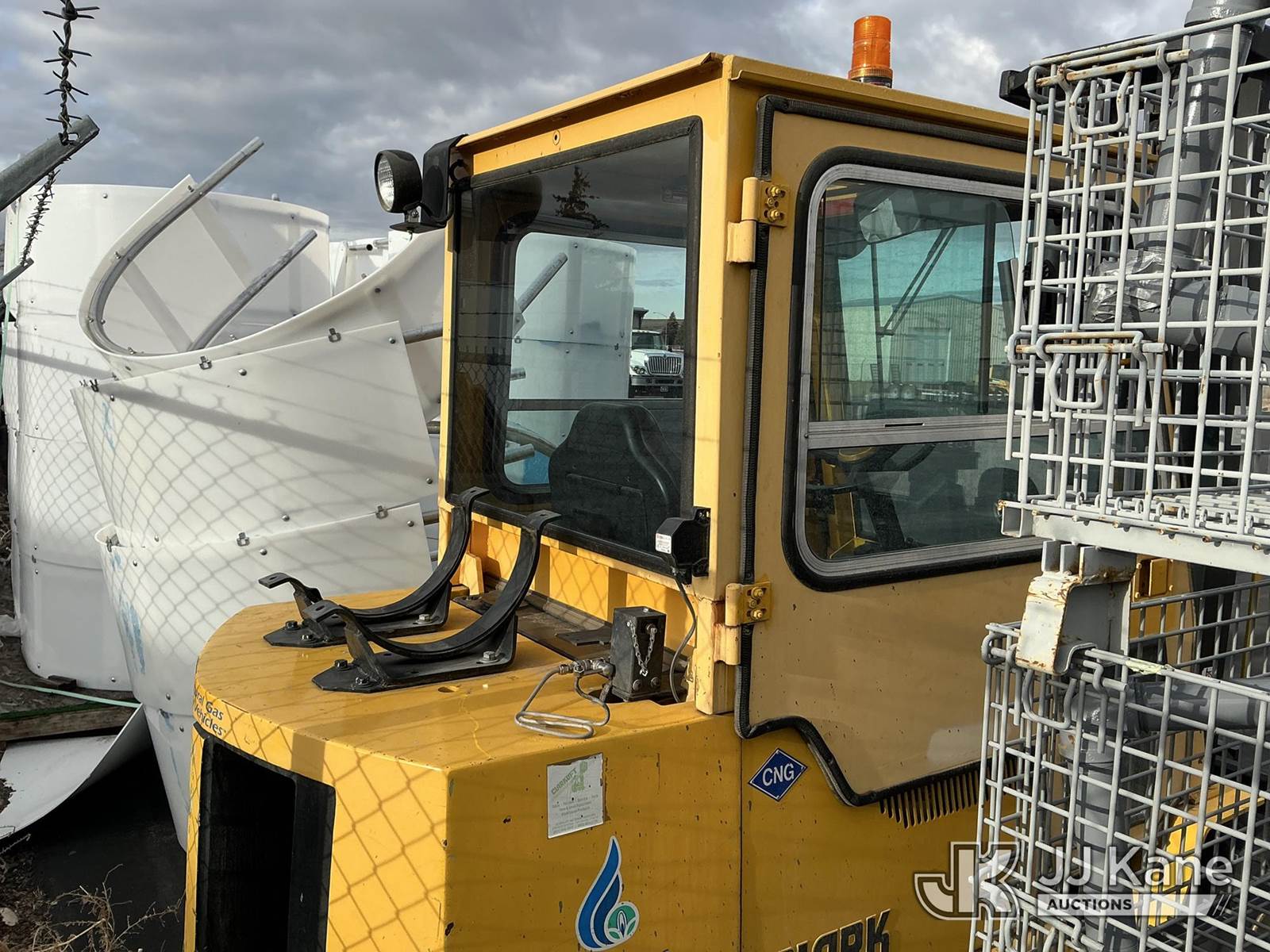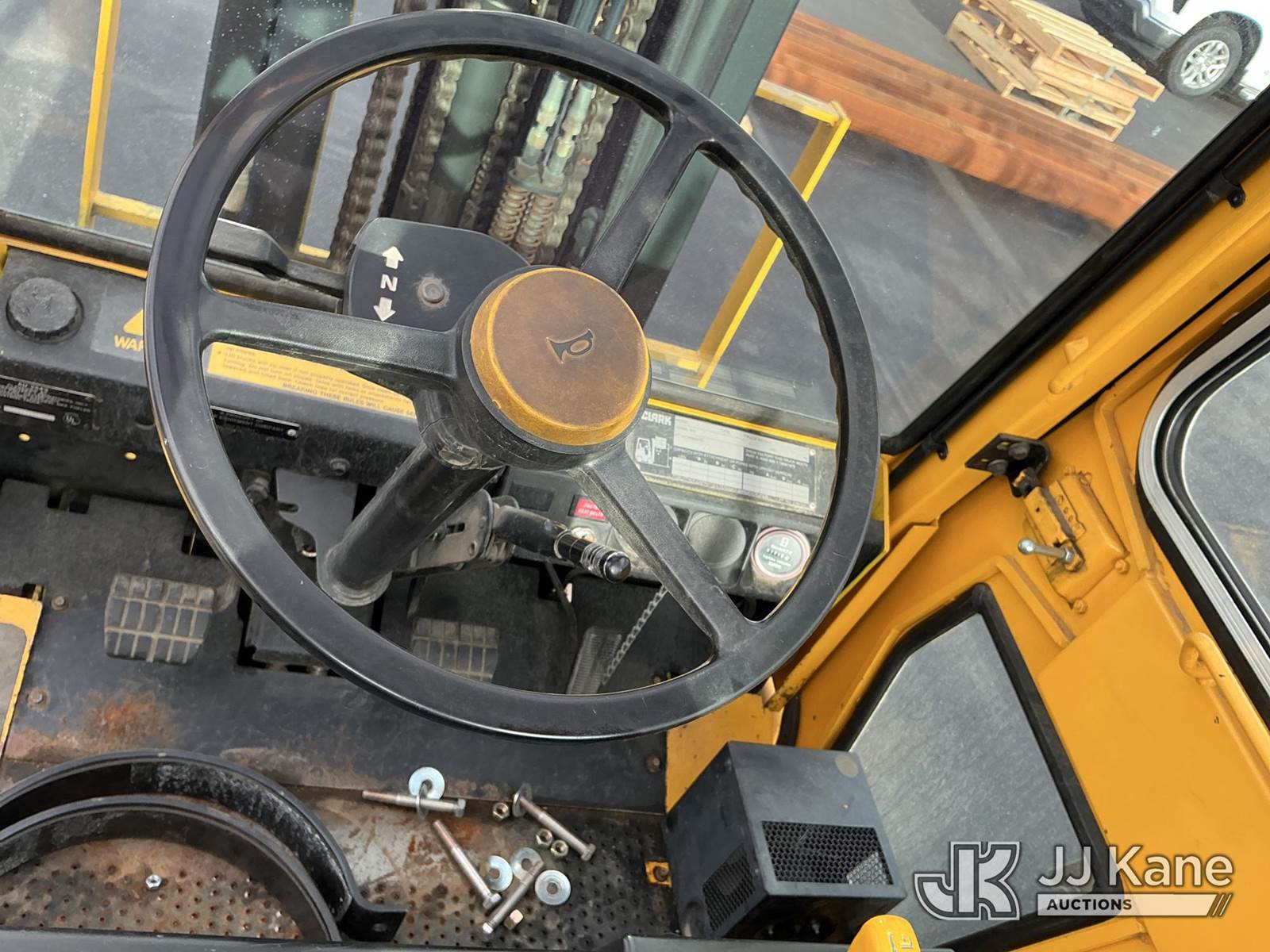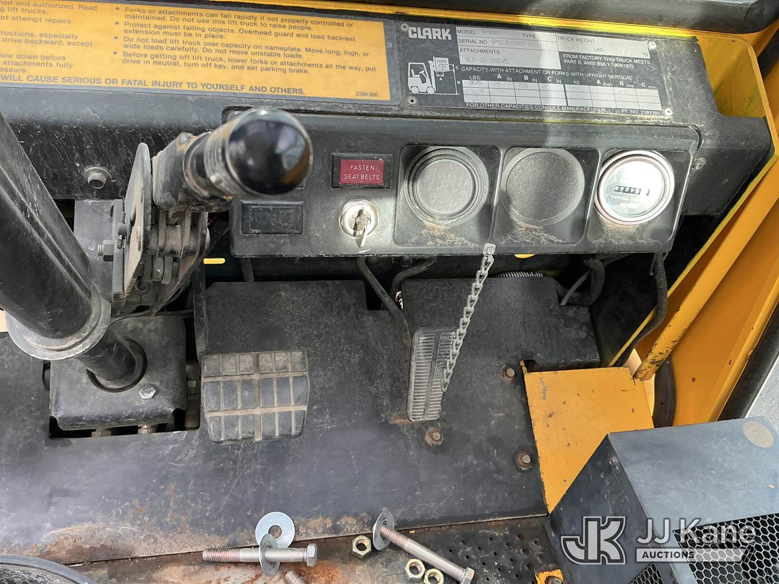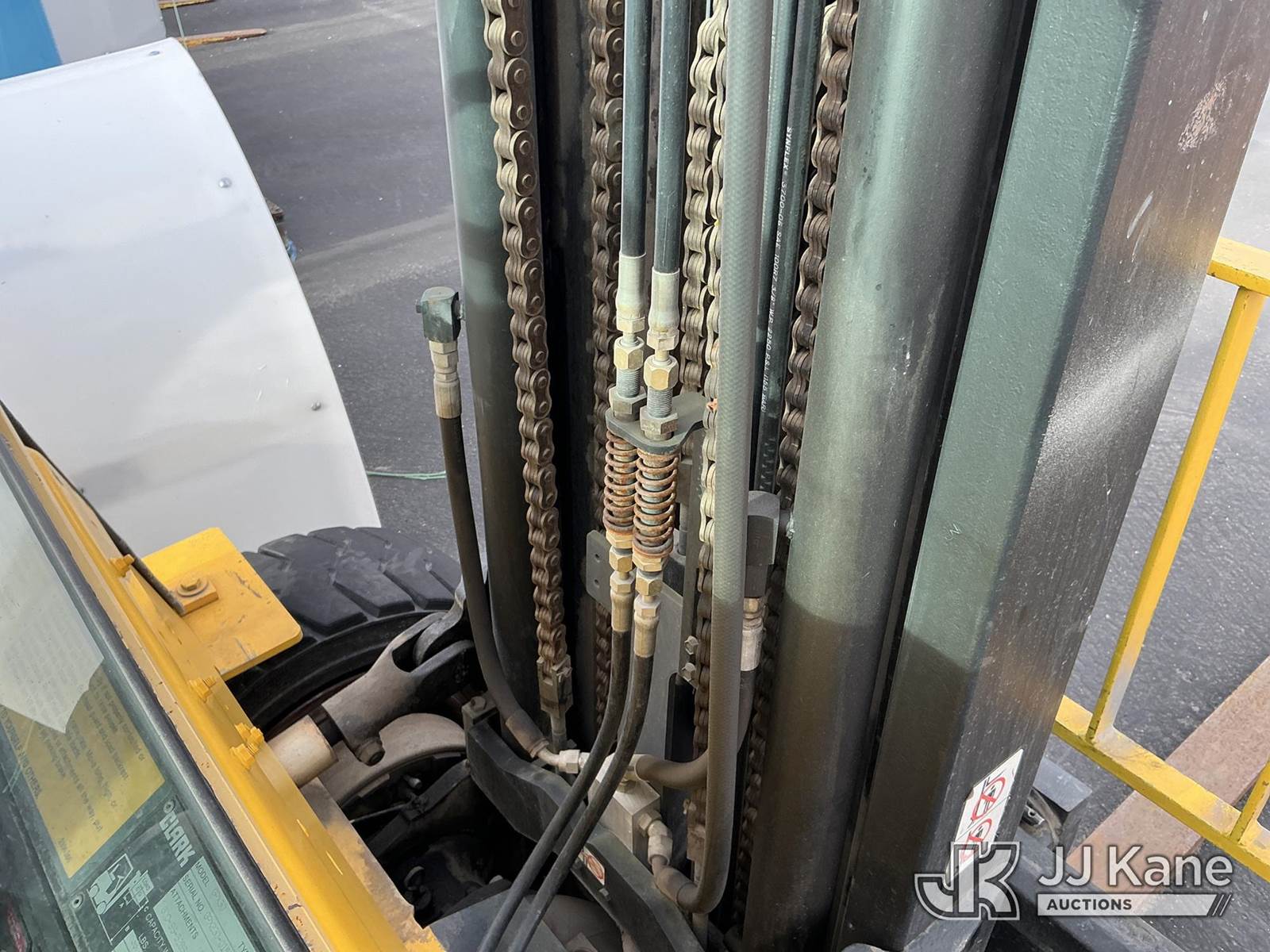 1992 Clark GPX30 Pneumatic Tired Forklift, s/n GPX23001558735KOF, Hydrostatic, CNG Only, with 3,675 lb. capacity, 226 in. 3 stage mast height, EROPS, (Not Running, Condition Unknown) (Does Not Start, No CNG Tank, Seller States: Runs with CNG Tank) (Reads 725 hours) NOTE: This unit is being sold AS IS/WHERE IS via Timed Auction and is located in Evanston, WY. (Buyer is responsible for removal. Assistance by consignor or JJ Kane Auctioneers is not assured.)