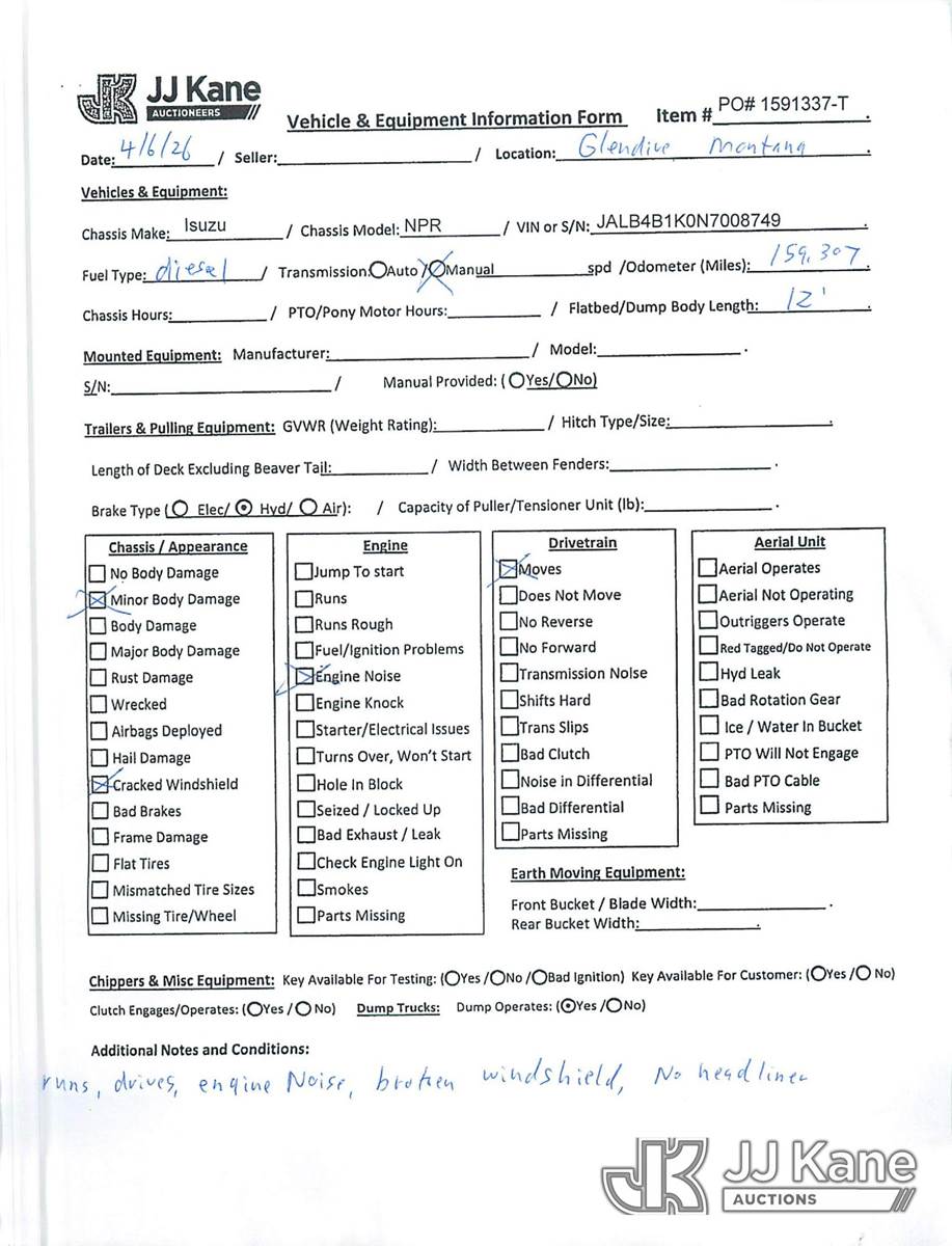 1992 Isuzu NPR Flatbed Truck, 3.9L diesel, Auto, (Exempt from Odometer Disclosure - Reads 159,307 miles) (Runs & Moves) (Engine Noise, Broken Windshield, No Headliner) This is a Titled Item NOTE: This unit is being sold AS IS/WHERE IS via Timed Auction and is located in Glendive, MT. Inspection & preview days for this unit are by appointment only; please contact us at contact@jjkane.com or 84-Go-JJKane for more details. (Buyer is responsible for removal. Assistance by consignor or JJ Kane Auctions is not assured.)