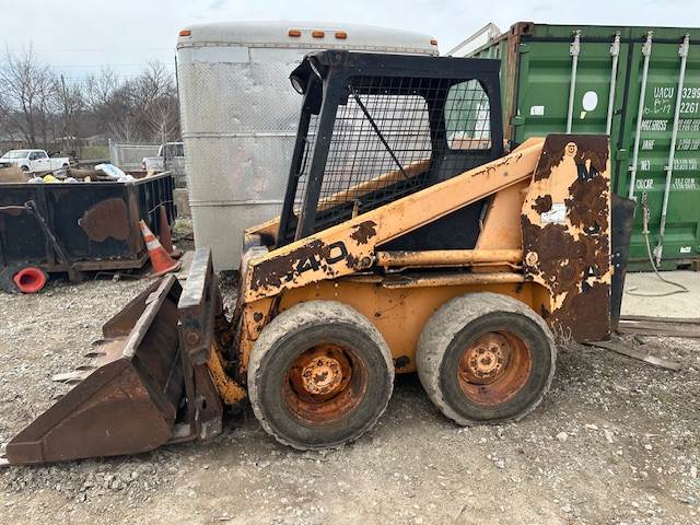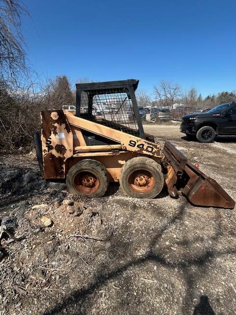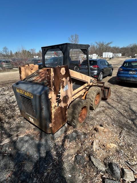 1992 Mustang 940 skid steer, 5400# operating weight, 38 HP, one owner, solid filled tires, includes tined bucket as well as a set of forks. Hour meter reads 2592. Recently rebuilt tilt and lift cylinders. Runs and operates as it should.