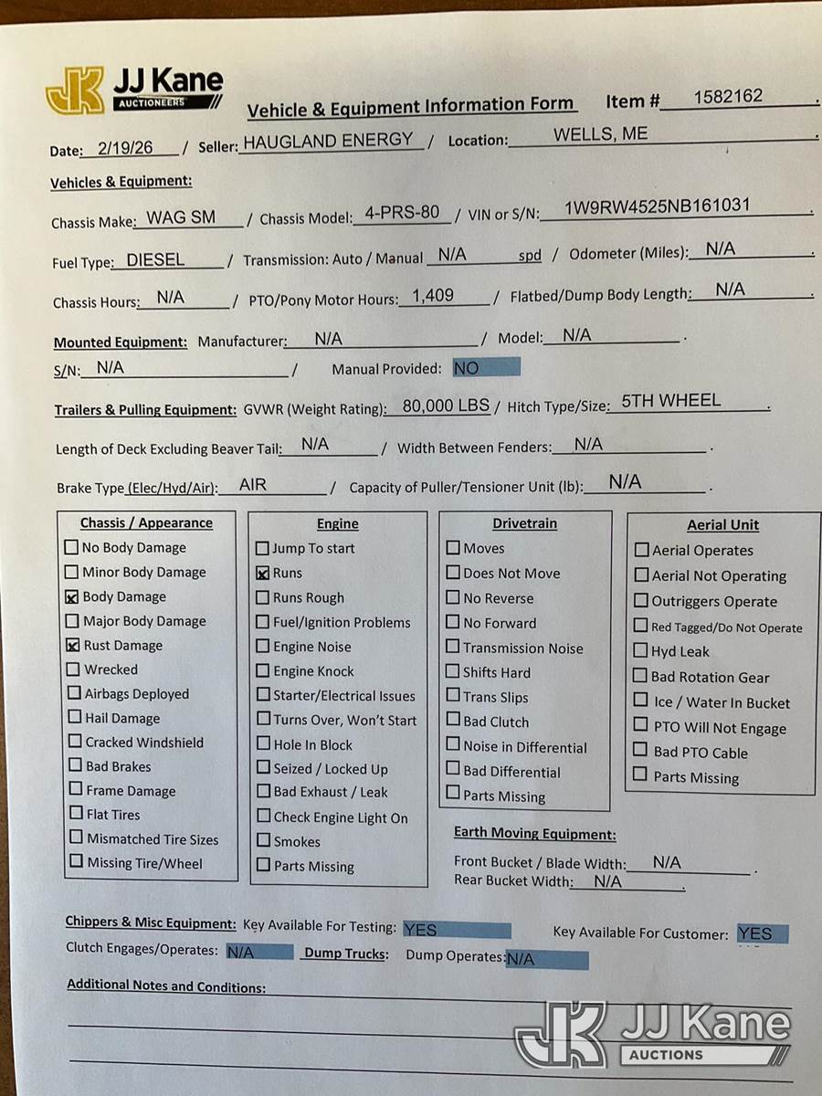 1992 Wagner Smith 4-PRS-80 4-Position T/A Reel Trailer, diesel, (Runs) (Reads 1,409 hours) This is a Titled Item NOTE: This unit is being sold AS IS/WHERE IS via Timed Auction and is located in Wells, ME. Inspection & preview days for this unit are by appointment only; please contact us at contact@jjkane.com or 84-Go-JJKane for more details. (Buyer is responsible for removal. Assistance by consignor or JJ Kane Auctions is not assured.)