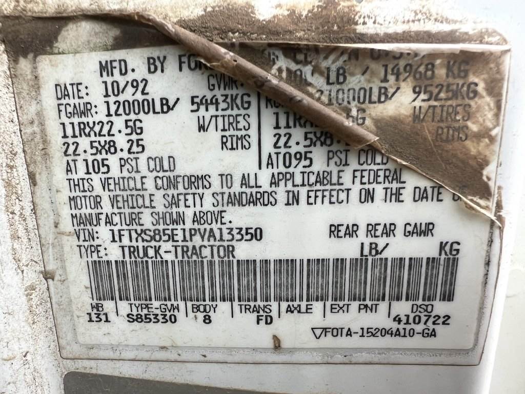 Location: Washougal WA ***End-User Consignment*** VIN: 1FTXS85E1PVA13350 Engine: 6cyl Diesel Transmission: Manual *Non-operational - engine runs but clutch is non-functional - stuck in gear.*, 2,400 Gallon tank, front/side/rear sprays, rear hose reel w/hose, trailer air supply, air brakes, PTO, spring suspension, 11R22.5 tires. Miles: 302,904 indicated