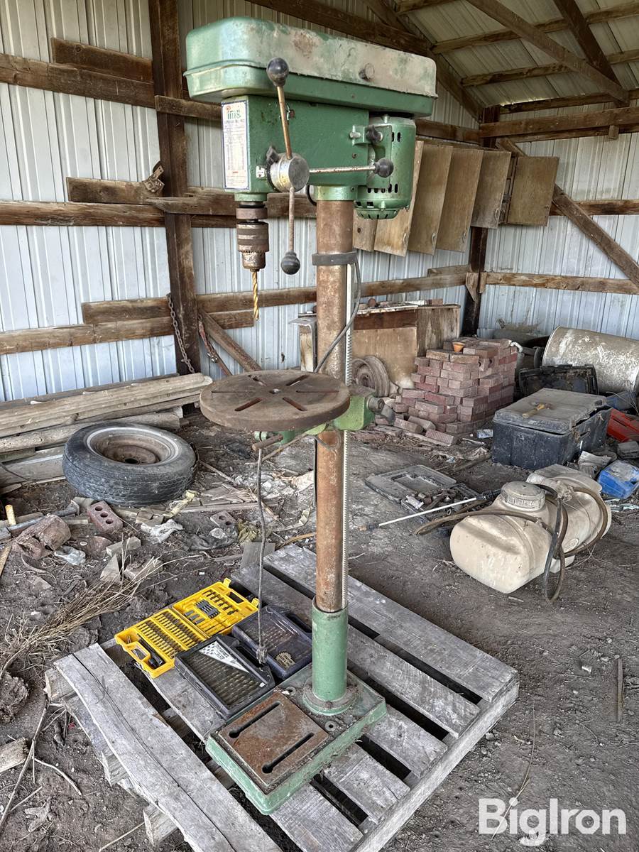 1993 Ims 16 Speed Floor Drill Press, 110 Plug In, Manual Adjustable Platform Height, Additional Drills Bits Included, SN: 634976