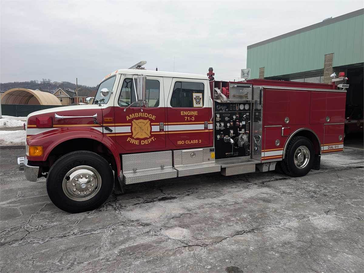 This Pierce International has a DTA-466 motor with 2087 hours, air ride driver seat, Federal Q2B, a 1250gpm Waterous single stage pump, 750 gallon steel water tank, Kubota generator that powers the two center telescoping scene lights and the cord reel, mostly all of the emergency lighting has been converted to LED, TFT extend-a-gun deck gun piping (deck gun not included), 3 SCBA seats, rear traffic advisor, tires have almost new tread all the way around, and the paint is in mint condition.