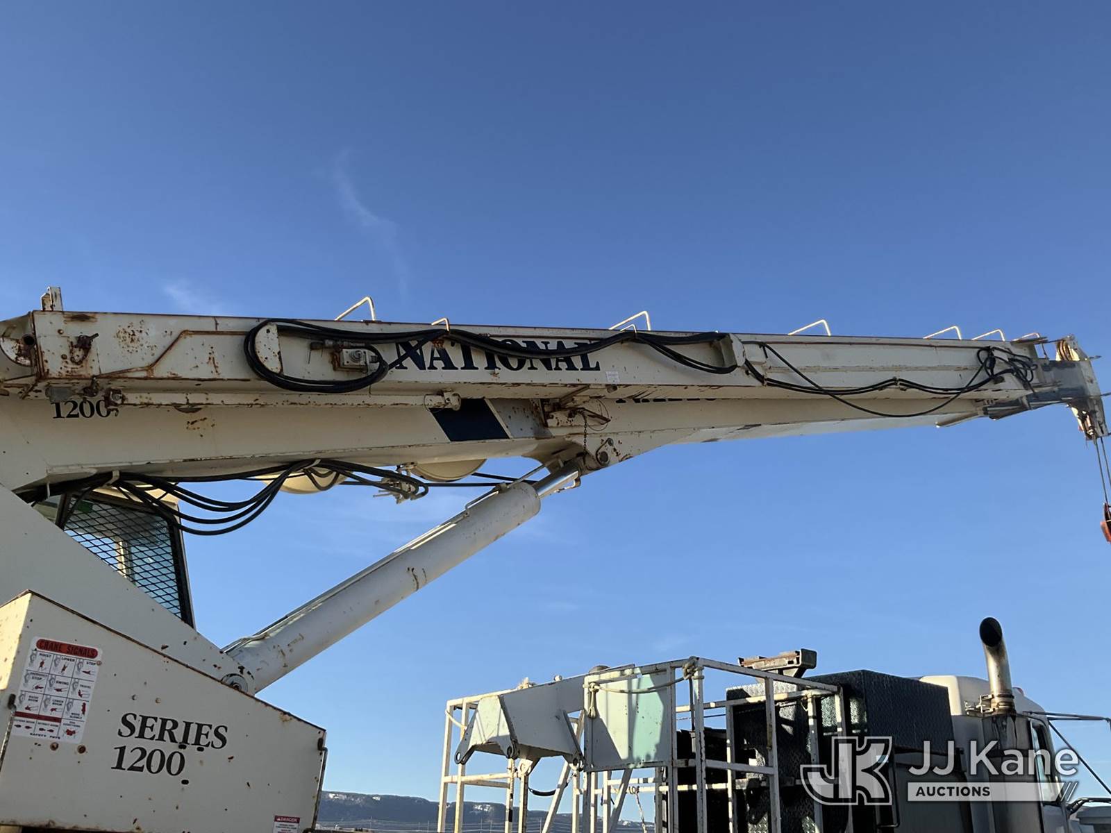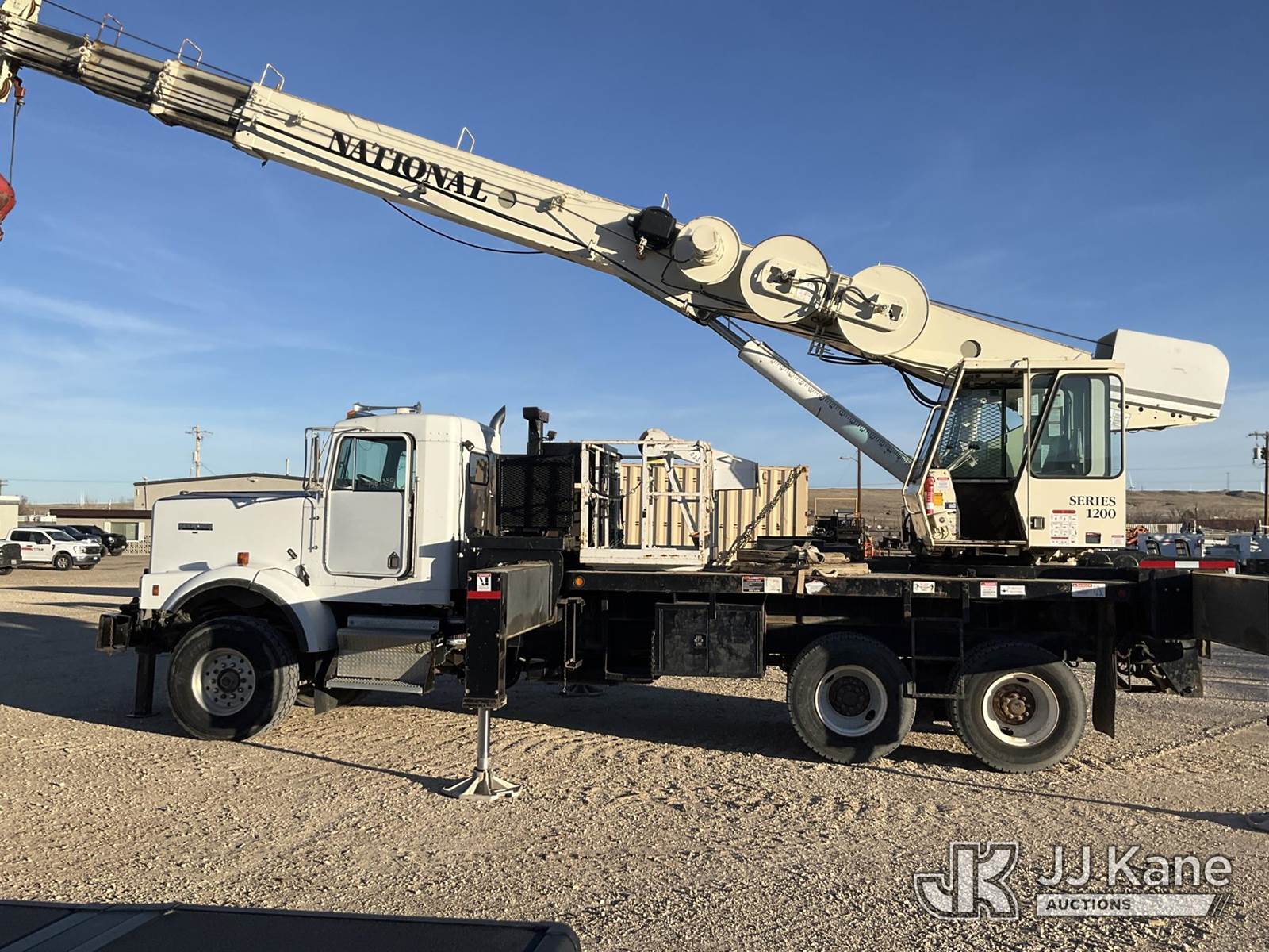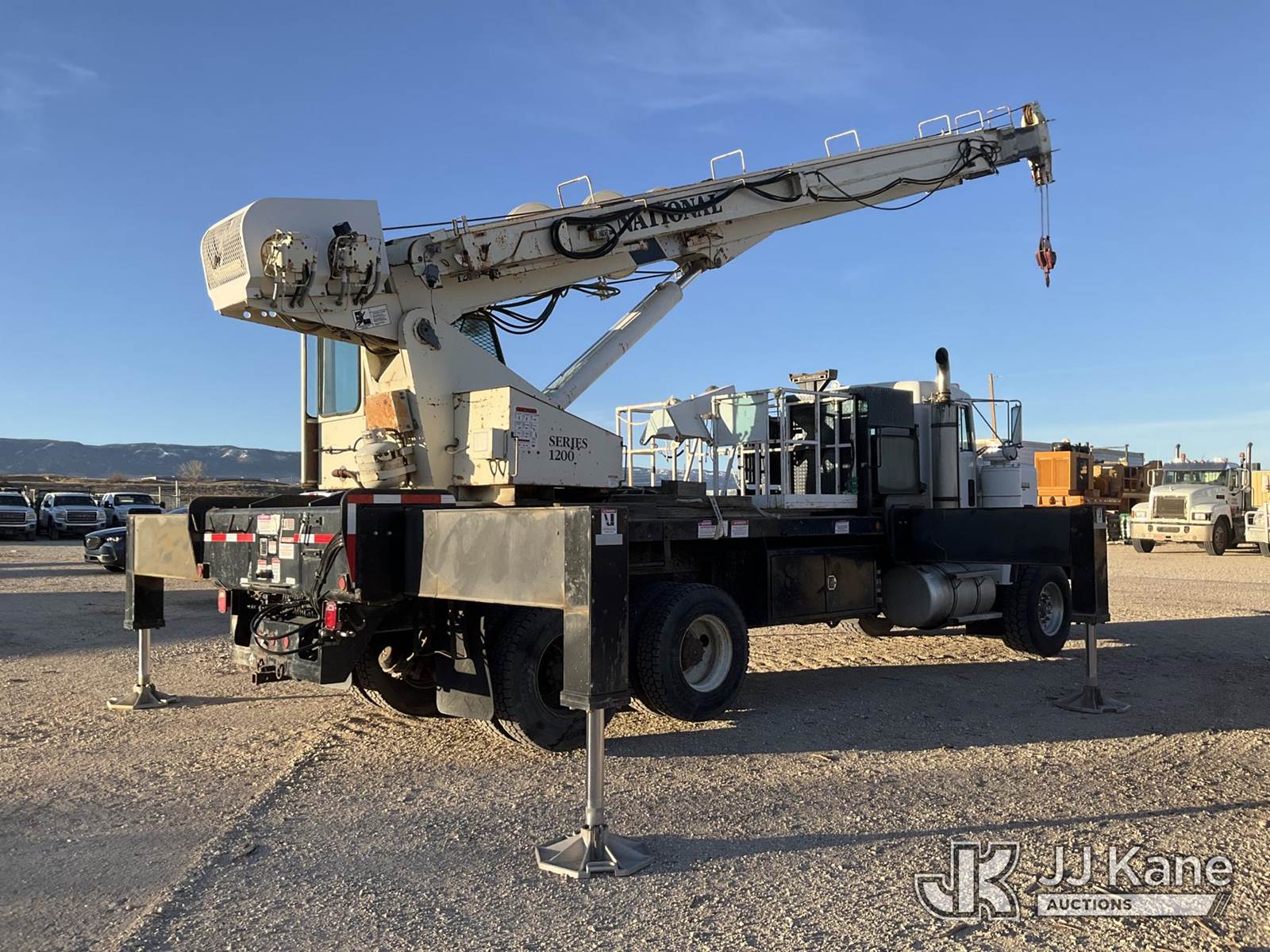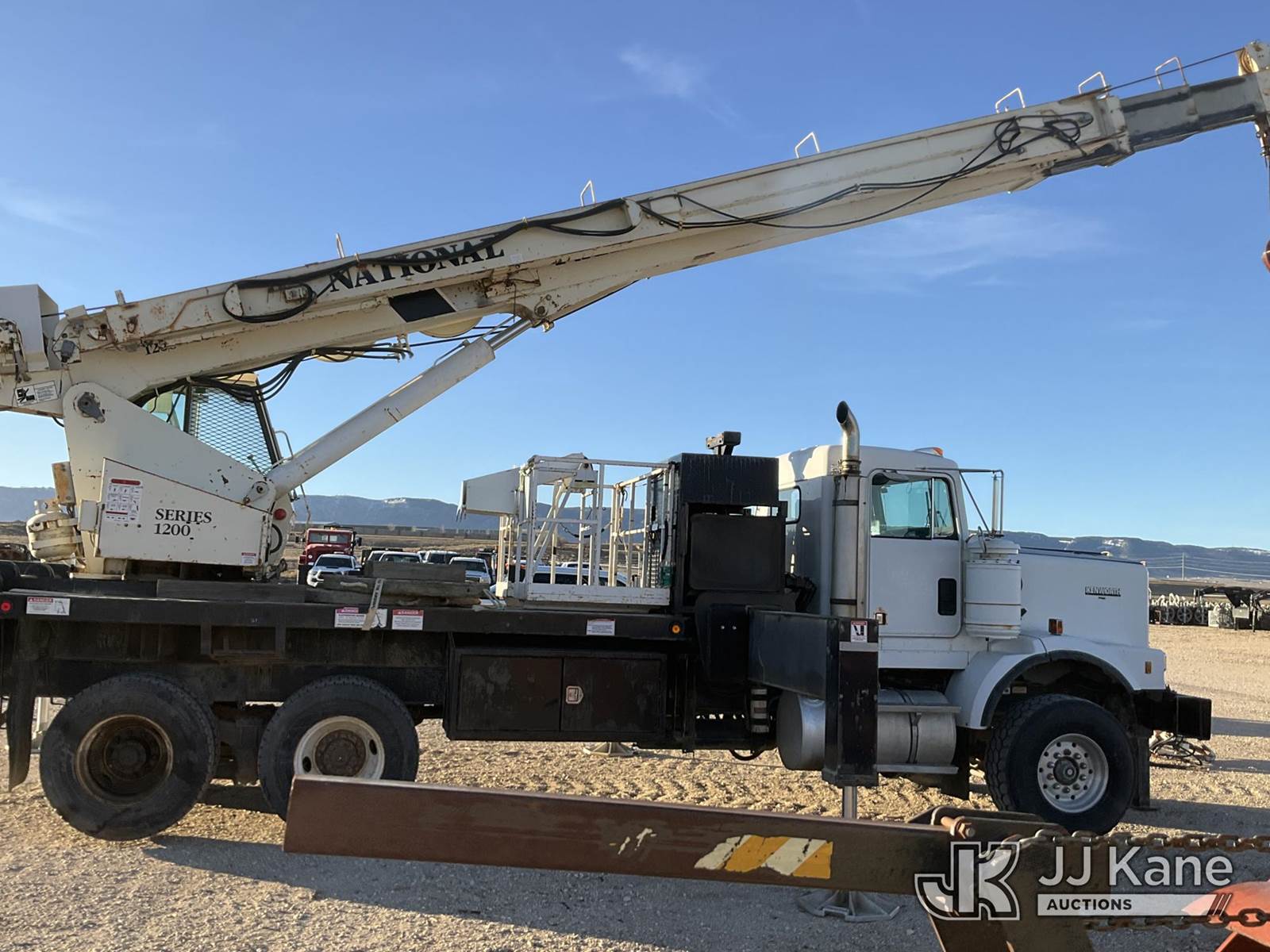 National 1200, 23-Ton Crane s/n 23478, with 105 ft sheave height, 29 ft.-95 ft 4 section hyd boom, 52 ft swing away stowable jib, heel winch, anti-two block, hook block, two-man basket, 2 -1 man baskets, pole grabs, pendant remote control, enclosed cab & 5 hyd outriggers, rear mounted on 1993 Kenworth C500 T/A Flatbed Truck, 14.0L L6 DIESEL 6X4, manual, A/C, (Exempt from Odometer Disclosure - Reads 106,293 miles) (Runs , Moves & Upper Operates)(Anti Two Block Disconnected) (Reads 9,186 hours) This is a Titled Item NOTE: This unit is being sold AS IS/WHERE IS via Timed Auction and is located in Evansville, WY. For more information & removal arrangements please contact John Larkin @ John.larkin@jjkane.com (Missing manuals, See Auction Company for Manufacturers Information to obtain manuals) (Buyer is responsible for removal. Assistance by consignor or JJ Kane Auctions is not assured.)