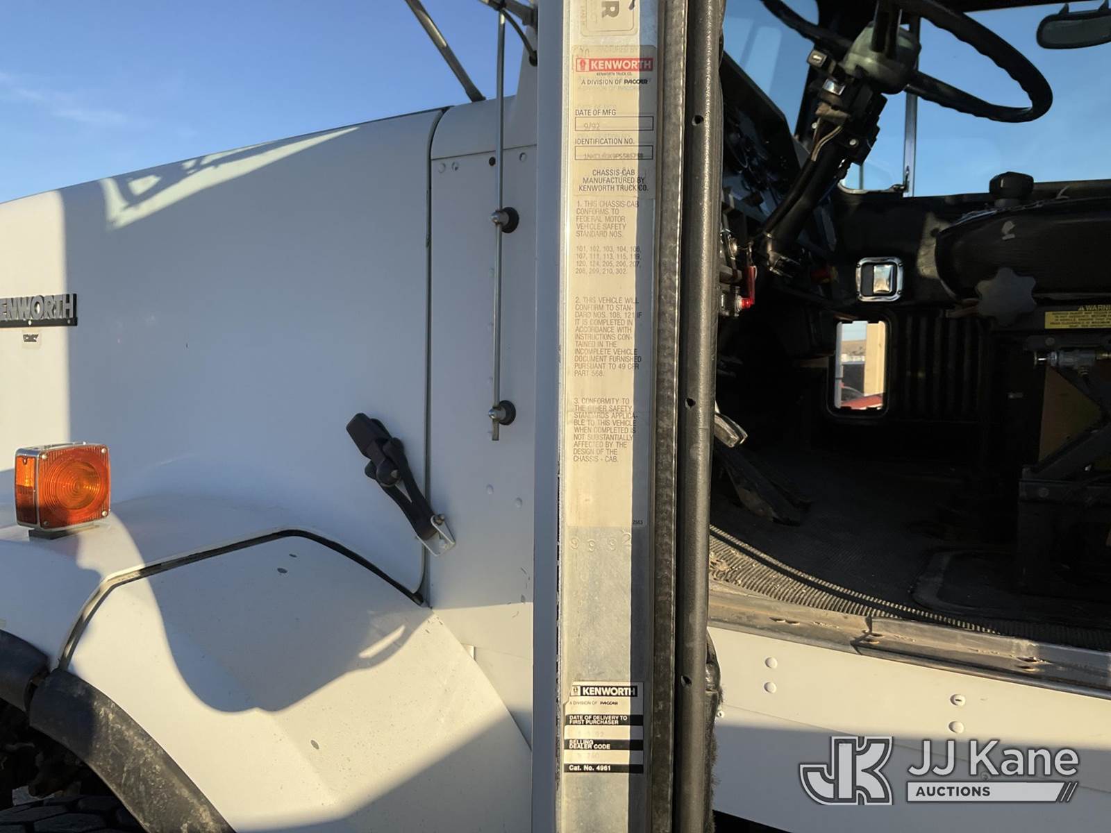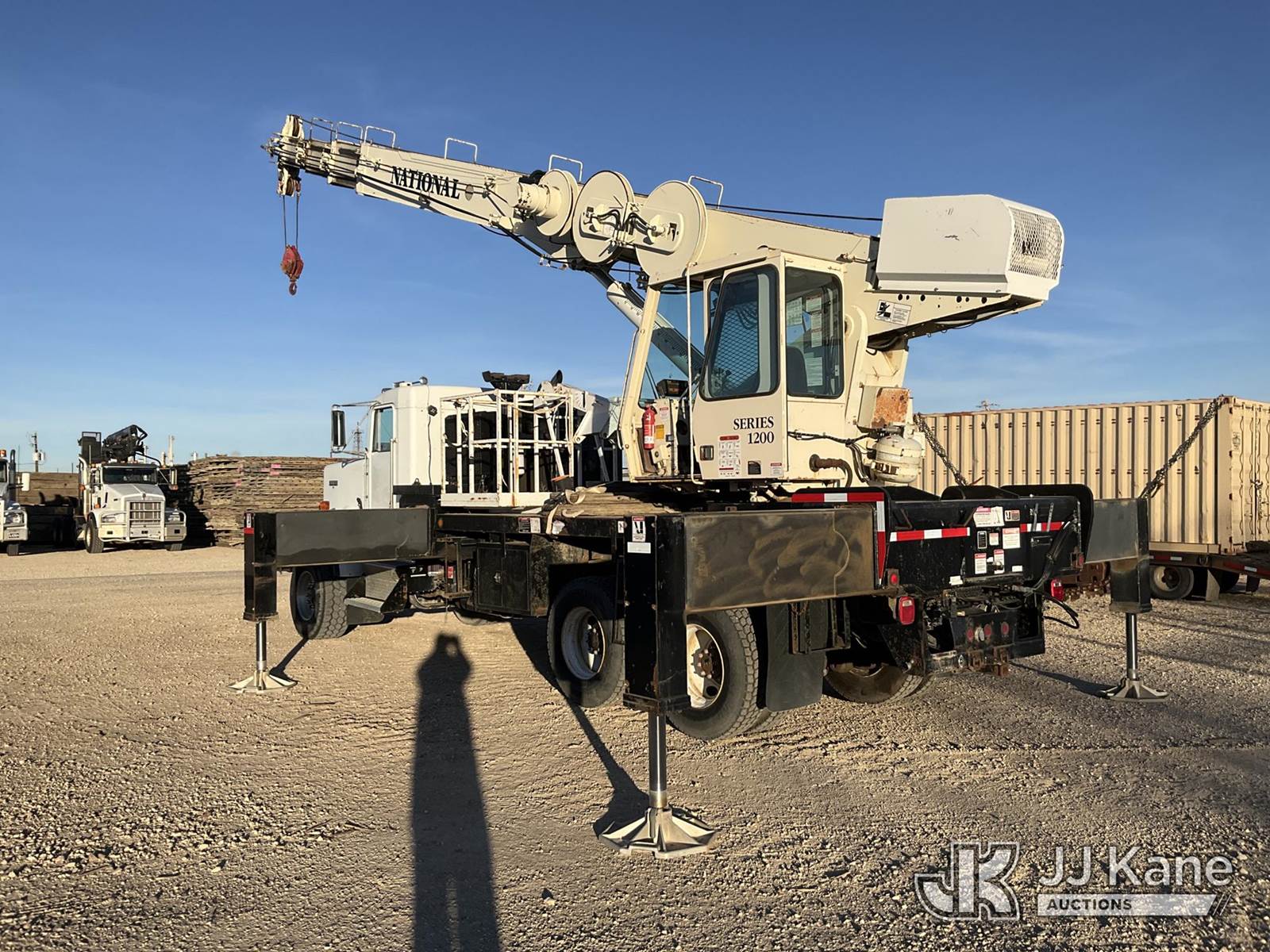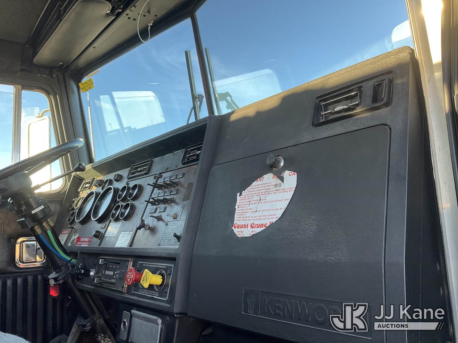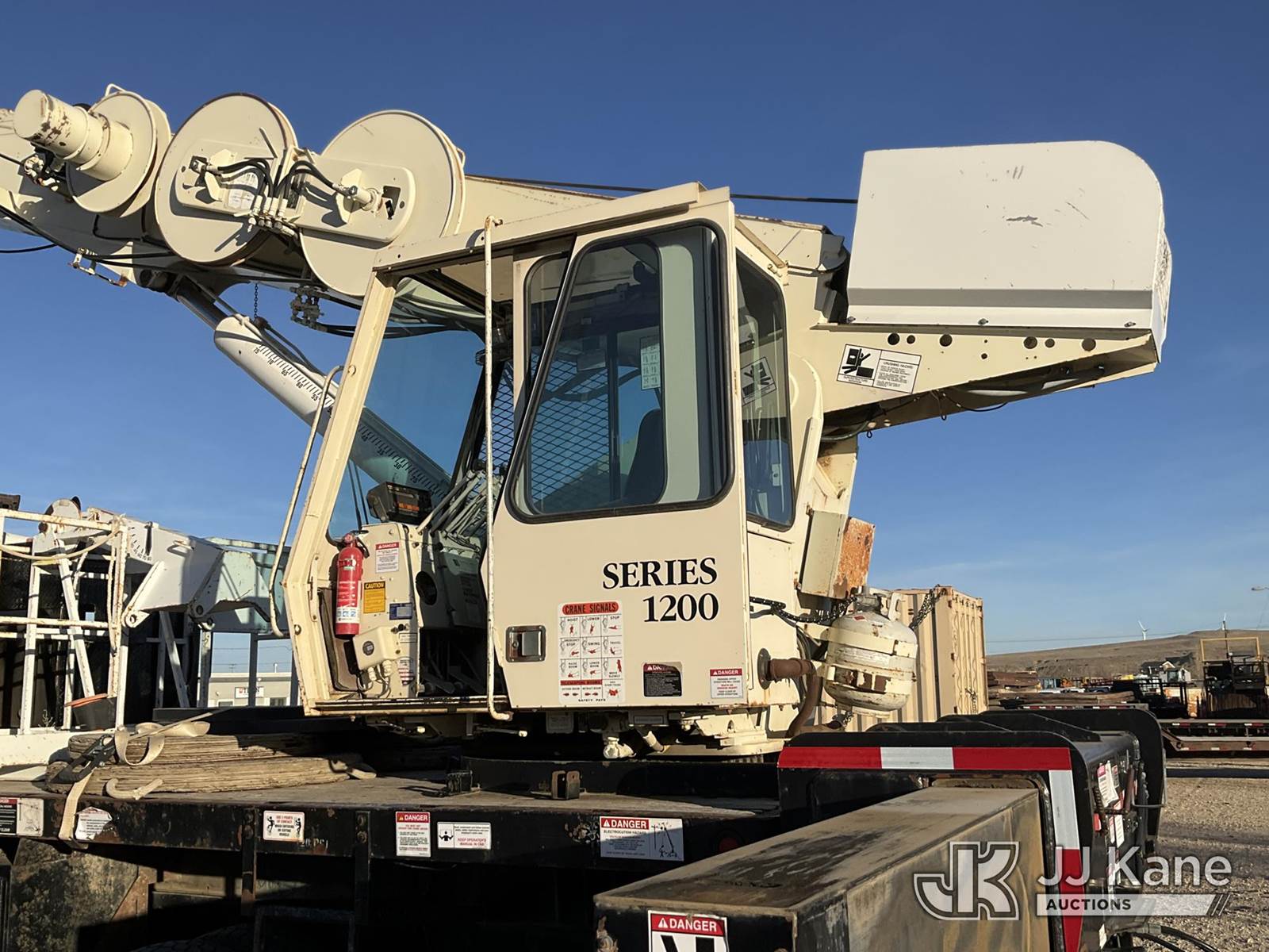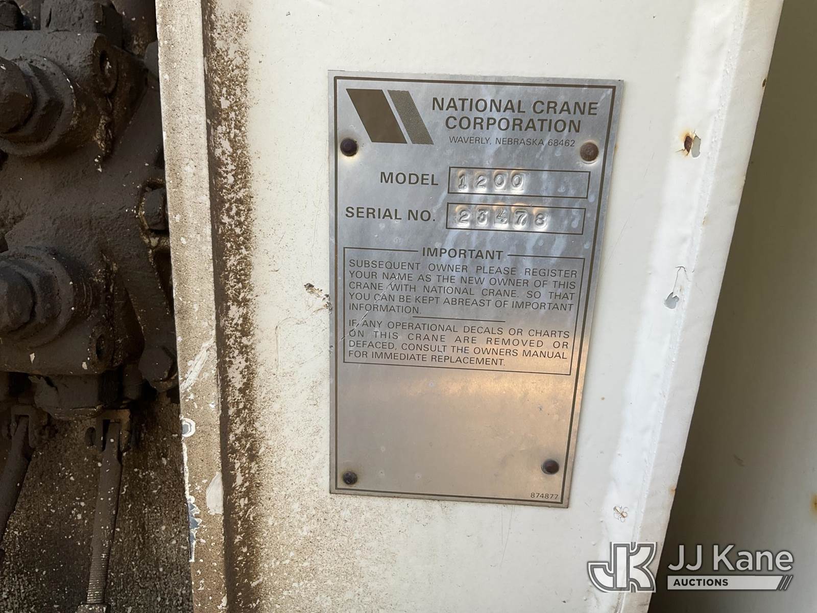 National 1200, 23-Ton Crane s/n 23478, with 105 ft sheave height, 29 ft.-95 ft 4 section hyd boom, 52 ft swing away stowable jib, heel winch, anti-two block, hook block, two-man basket, 2 -1 man baskets, pole grabs, pendant remote control, enclosed cab & 5 hyd outriggers, rear mounted on 1993 Kenworth C500 T/A Flatbed Truck, 14.0L L6 DIESEL 6X4, manual, A/C, (Exempt from Odometer Disclosure - Reads 106,293 miles) (Runs , Moves & Upper Operates)(Anti Two Block Disconnected) (Reads 9,186 hours) This is a Titled Item NOTE: This unit is being sold AS IS/WHERE IS via Timed Auction and is located in Evansville, WY. For more information & removal arrangements please contact John Larkin @ John.larkin@jjkane.com (Missing manuals, See Auction Company for Manufacturers Information to obtain manuals) (Buyer is responsible for removal. Assistance by consignor or JJ Kane Auctions is not assured.)