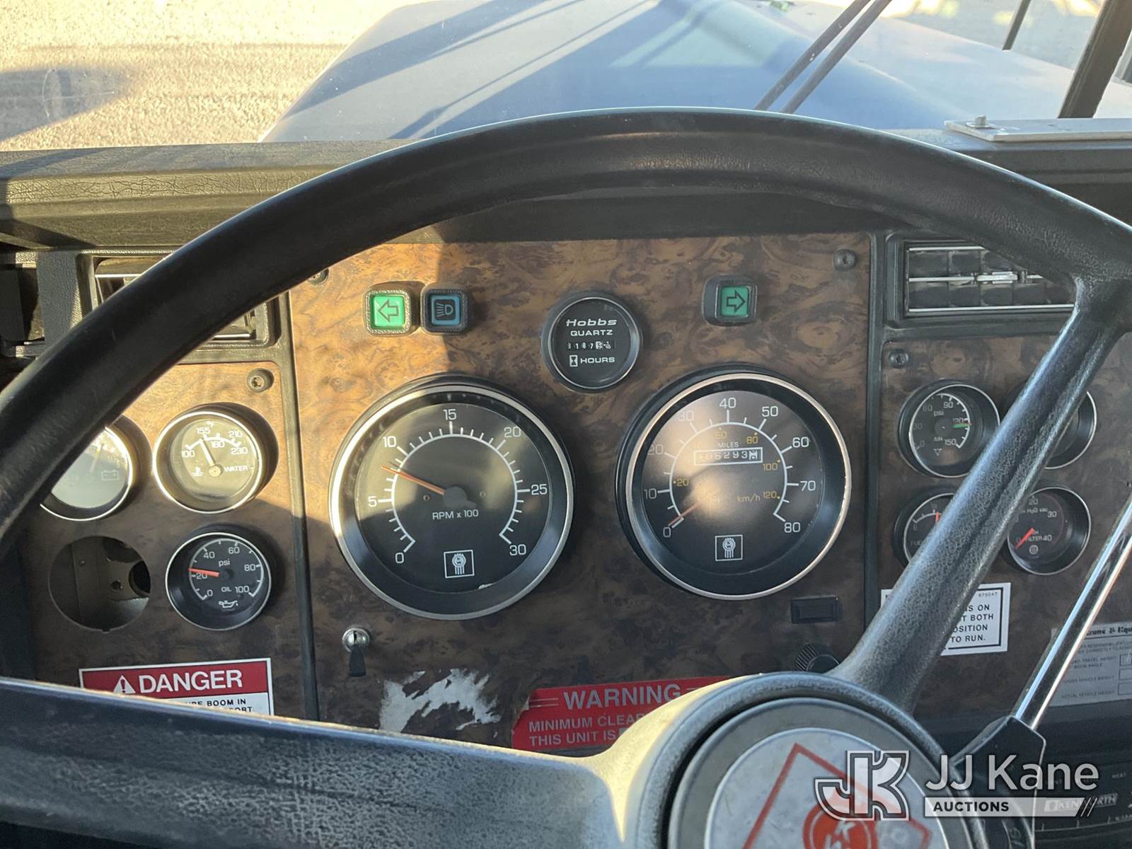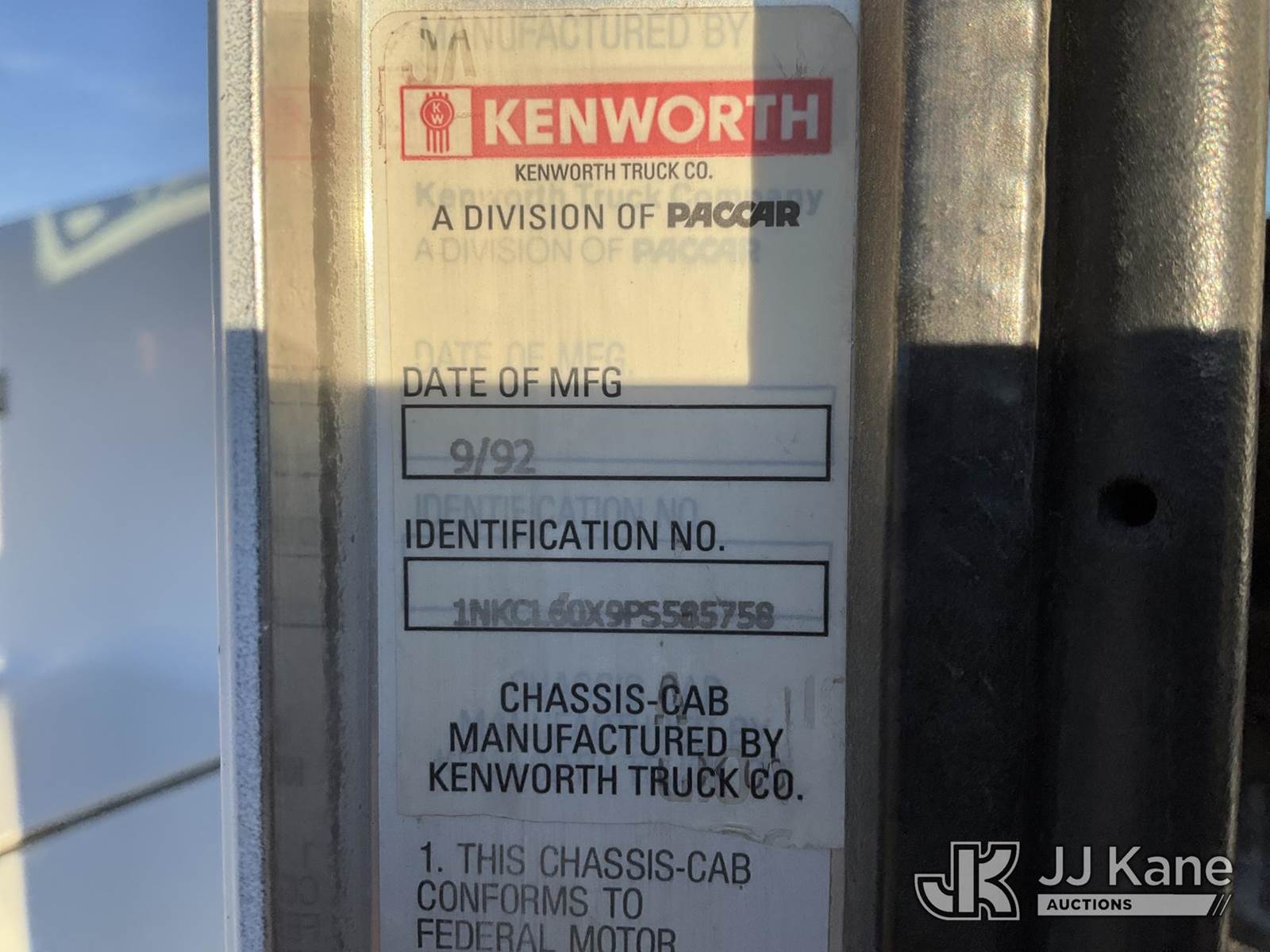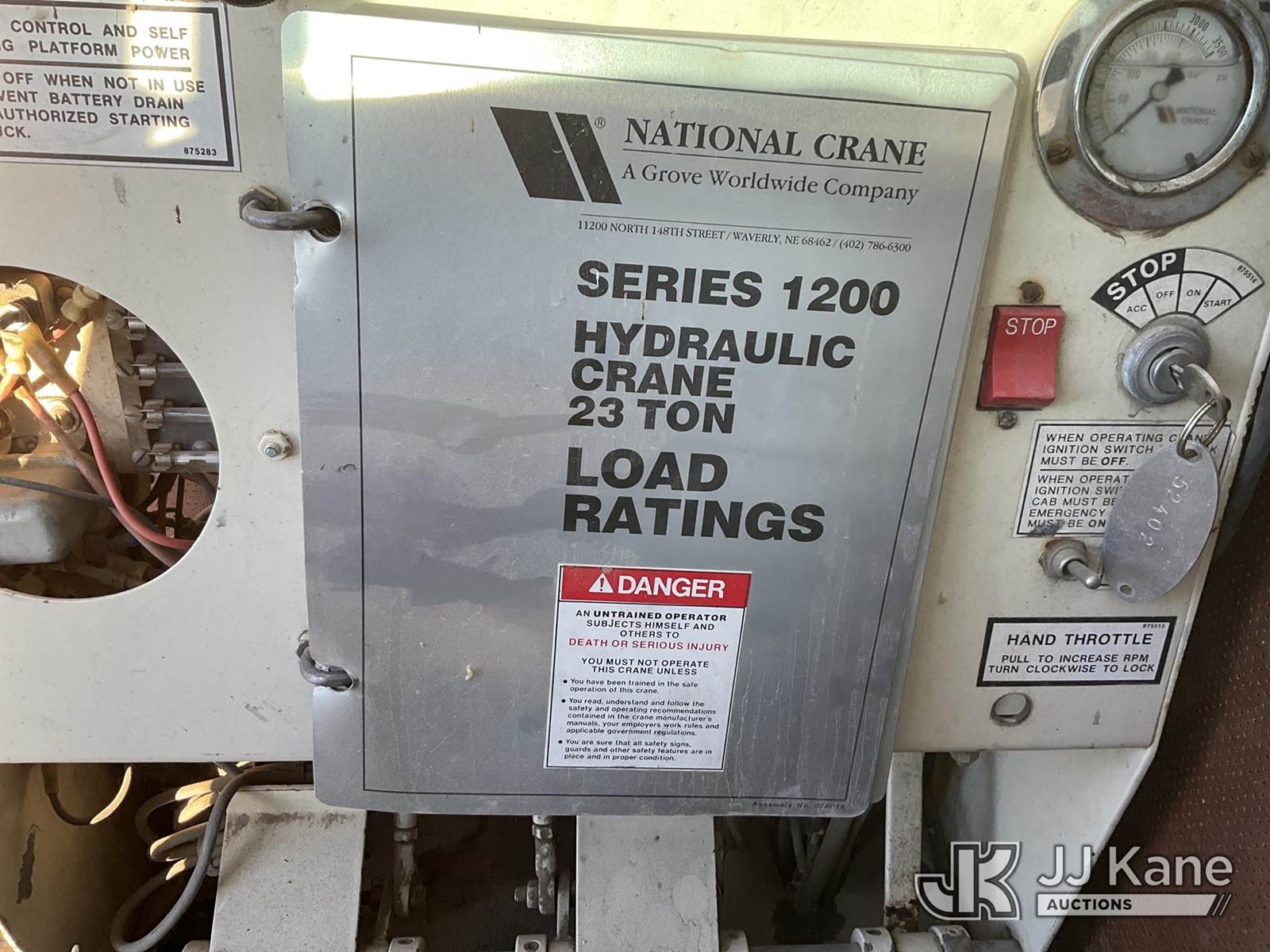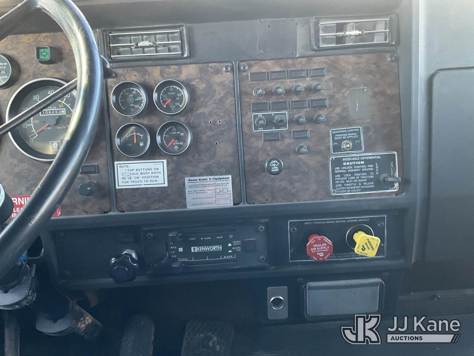 National 1200, 23-Ton Crane s/n 23478, with 105 ft sheave height, 29 ft.-95 ft 4 section hyd boom, 52 ft swing away stowable jib, heel winch, anti-two block, hook block, two-man basket, 2 -1 man baskets, pole grabs, pendant remote control, enclosed cab & 5 hyd outriggers, rear mounted on 1993 Kenworth C500 T/A Flatbed Truck, 14.0L L6 DIESEL 6X4, manual, A/C, (Exempt from Odometer Disclosure - Reads 106,293 miles) (Runs , Moves & Upper Operates)(Anti Two Block Disconnected) (Reads 9,186 hours) This is a Titled Item NOTE: This unit is being sold AS IS/WHERE IS via Timed Auction and is located in Evansville, WY. For more information & removal arrangements please contact John Larkin @ John.larkin@jjkane.com (Missing manuals, See Auction Company for Manufacturers Information to obtain manuals) (Buyer is responsible for removal. Assistance by consignor or JJ Kane Auctions is not assured.)