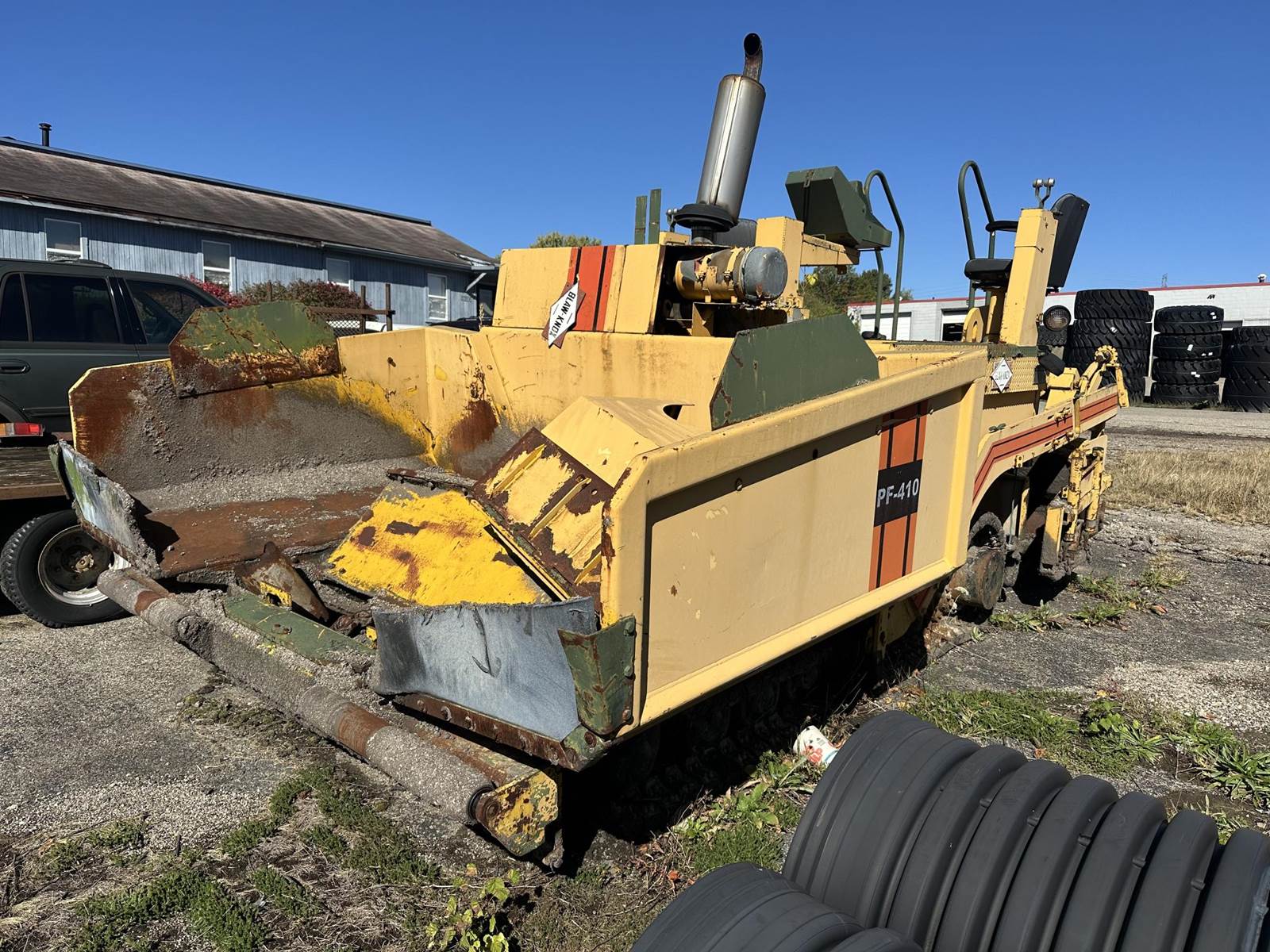 1994 Blaw Knox PF-410 Paver. 6500 Hours. Features a Cummins 5.9 with 158HP. Operating weight is 32K lbs. Hopper capacity: 8-9 Tons. Working Width: 8-16 Feet. Features Omni 1A Diesel Heated Screed, Chain Driven Feed to Augers, Dual Station Controls, and Power Crown Control.