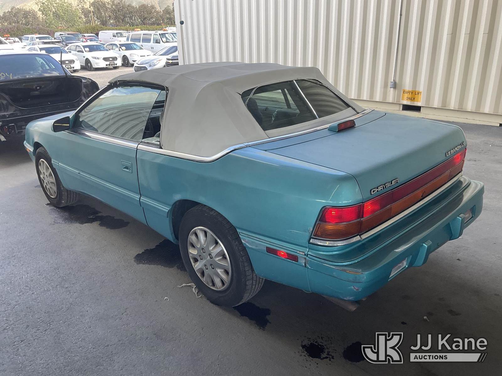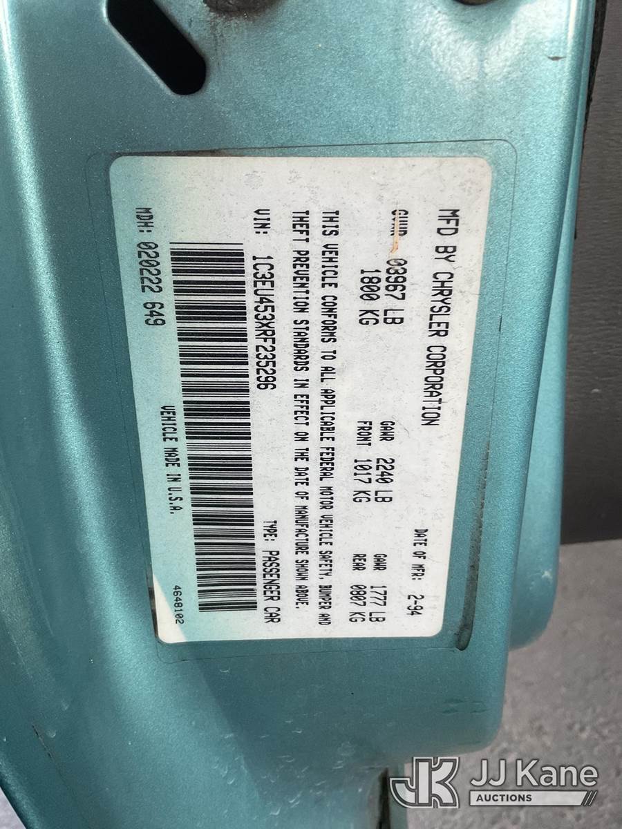 1994 Chrysler LeBaron Convertible 2-Door Sport Coupe, s/n 1C3EU453XRF235296, 3.0L V6 SOHC 8V Gas FWD, 4-Speed Automatic, A/C, (Exempt from Odometer Disclosure - Reads 72,950 miles) (Runs & Moves) (Head Lights Do Not Work, Horn Does Not Work) (Bidding Restricted to Licensed Vehicle Dealers Only), This is a Titled Item NOTE: This unit is being sold AS IS/WHERE IS via Timed Auction and is located in Jurupa Valley, CA. Inspection & preview days for this unit are the 2 business days prior to the first day of items closing for this auction, item is located at 4510 Muth Way Jurupa Valley, CA 92509 and hours of operations are 8a-4p. For pre-sale questions, please contact please contact Office Staff @ (310) 353-7140. Dealer License Number 45696. (Buyer is responsible for removal. Assistance by consignor or JJ Kane Auctions is not assured.)