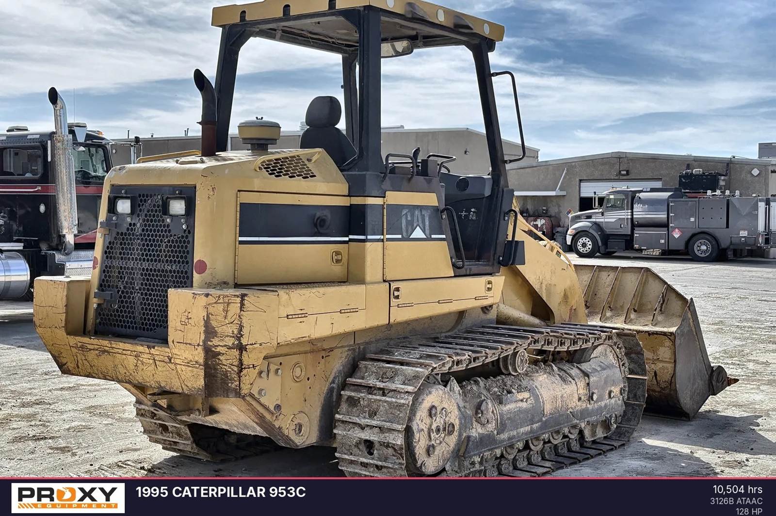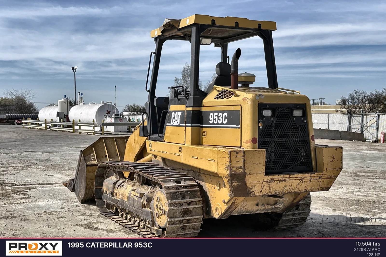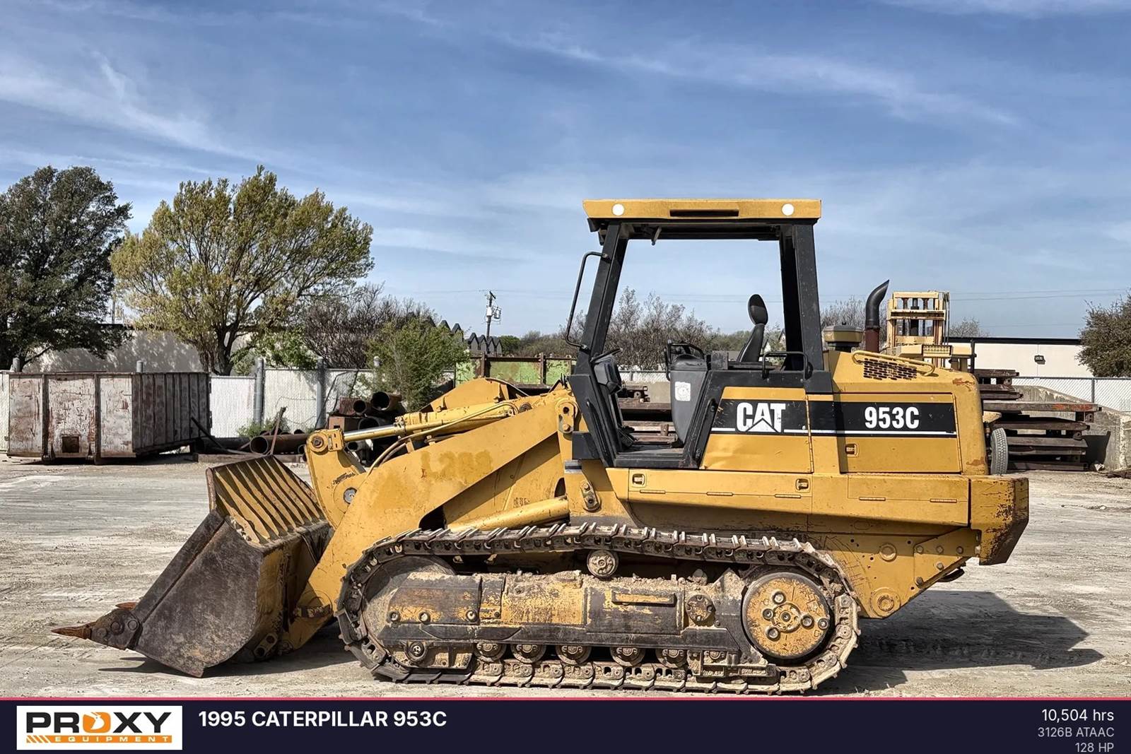 1995 Caterpillar 953C with 10,504 hours. This track loader features a 128 horsepower Cat 3126B engine, an operating weight of 33,389 pounds, and a 2.42 cubic yard bucket capacity. The unit shows normal wear for its age and service history, and complete maintenance records are available for review. The rear-mounted engine design provides balance and visibility, while the hydrostatic drive system allows for counter-rotation and infinitely variable speed. Operators benefit from the pressurized, sound-suppressed ROPS/FOPS cab and the electronic monitoring system for real-time diagnostics. Contact Proxy Equipment for more information, financing options, and shipping quotes.