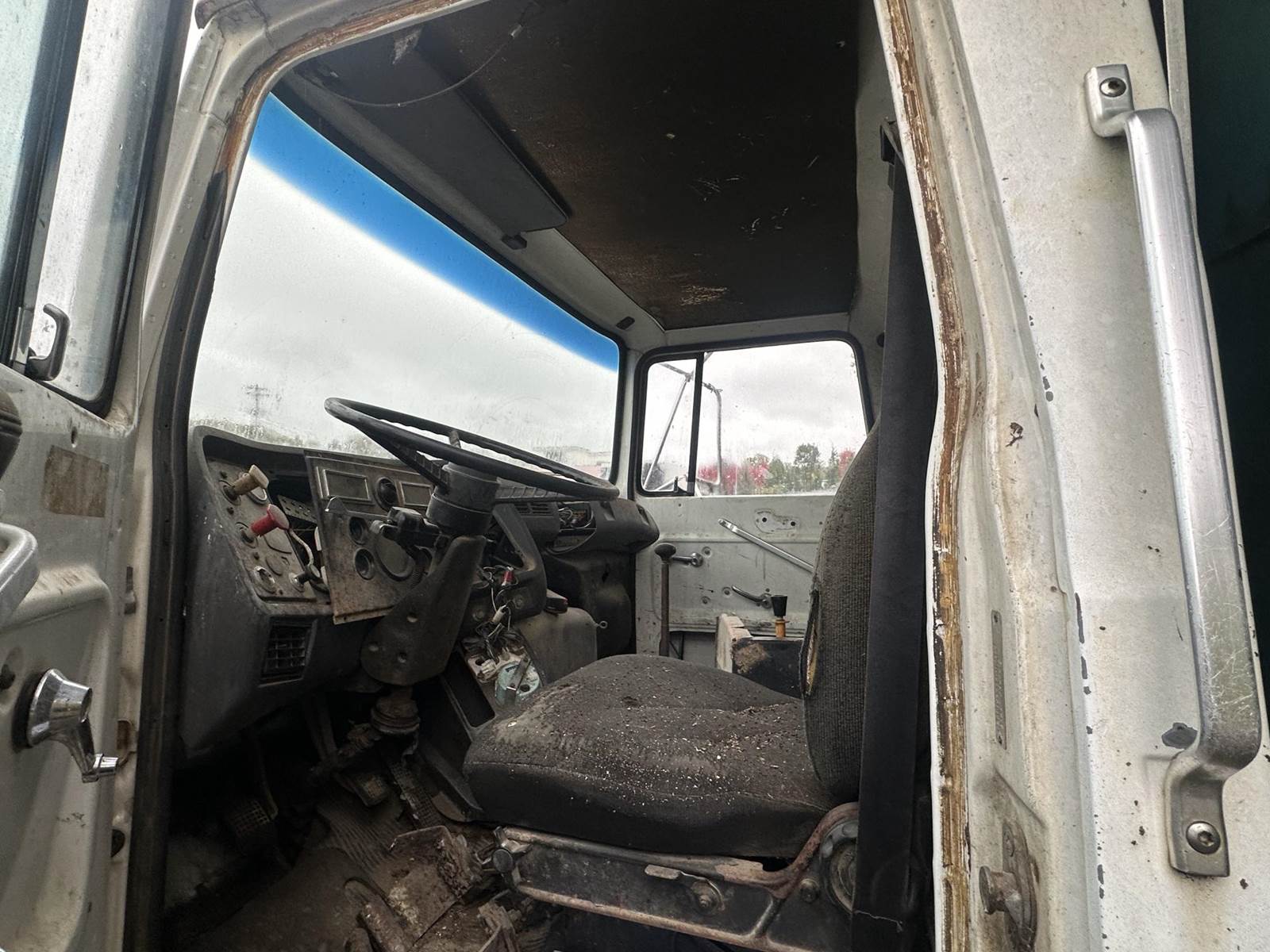 1995 Ford L8000 Dump Truck. Cummins FP1460 Diesel, Eaton Manual 7LL. Single Axle, GVWR: 33200 Lbs; Front Axle: 12000 Lbs; Rear Axle: 21200 Lbs. Spring Suspension, Air Ride Seat, Single Skuttle/Coal Door on Tailgate. **PARTS TRUCK**, missing steps/tank on drivers side, passenger seat, a few ducts in the engine area.