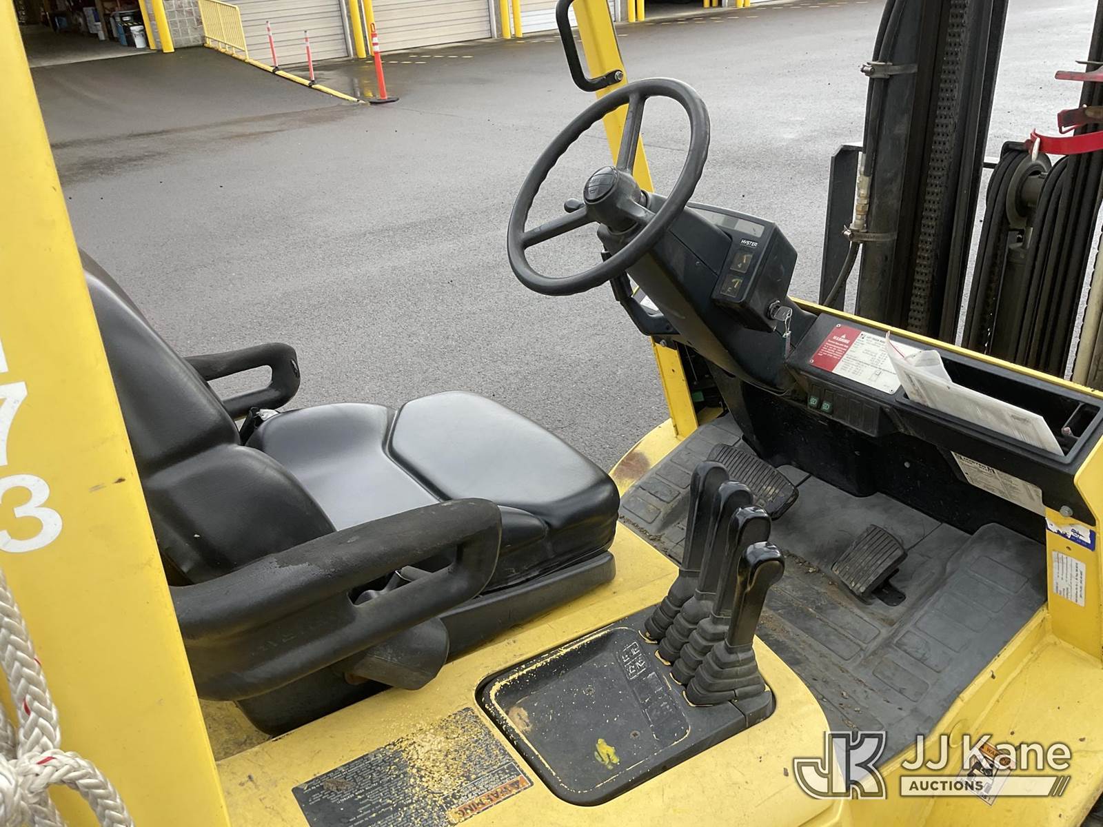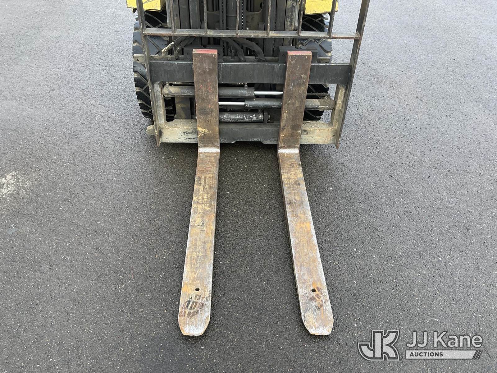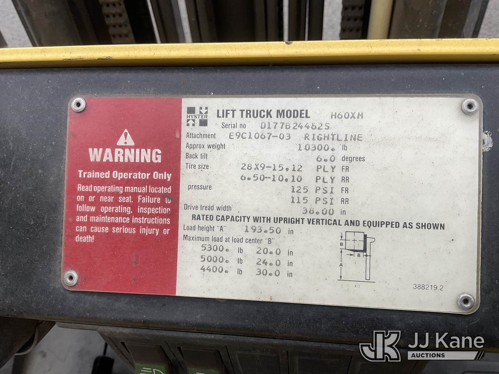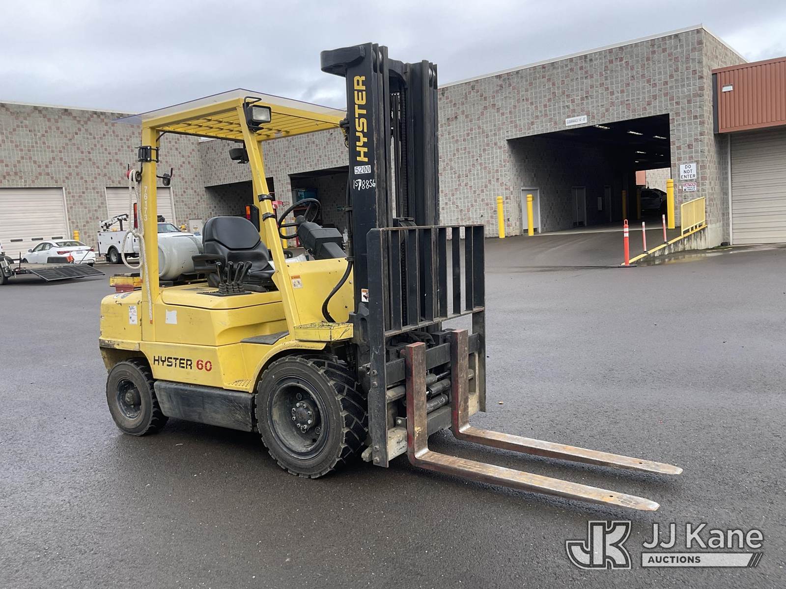 1995 Hyster H60XM Pneumatic Tired Forklift, s/n D177B24462S, 4-cyl, Shuttle, LPG, with 5300lbs lift capacity, 193in fork height, tilt, side shift, fork spreader, (Runs, Moves & Operates) (Reads 7,674 hours) NOTE: This unit is being sold AS IS/WHERE IS via Timed Auction and is located in Roseburg, OR. For more information & removal arrangements please contact Joseph Hull @ (801) 386-2131. (Buyer is responsible for removal. Assistance by consignor or JJ Kane Auctions is not assured.)
