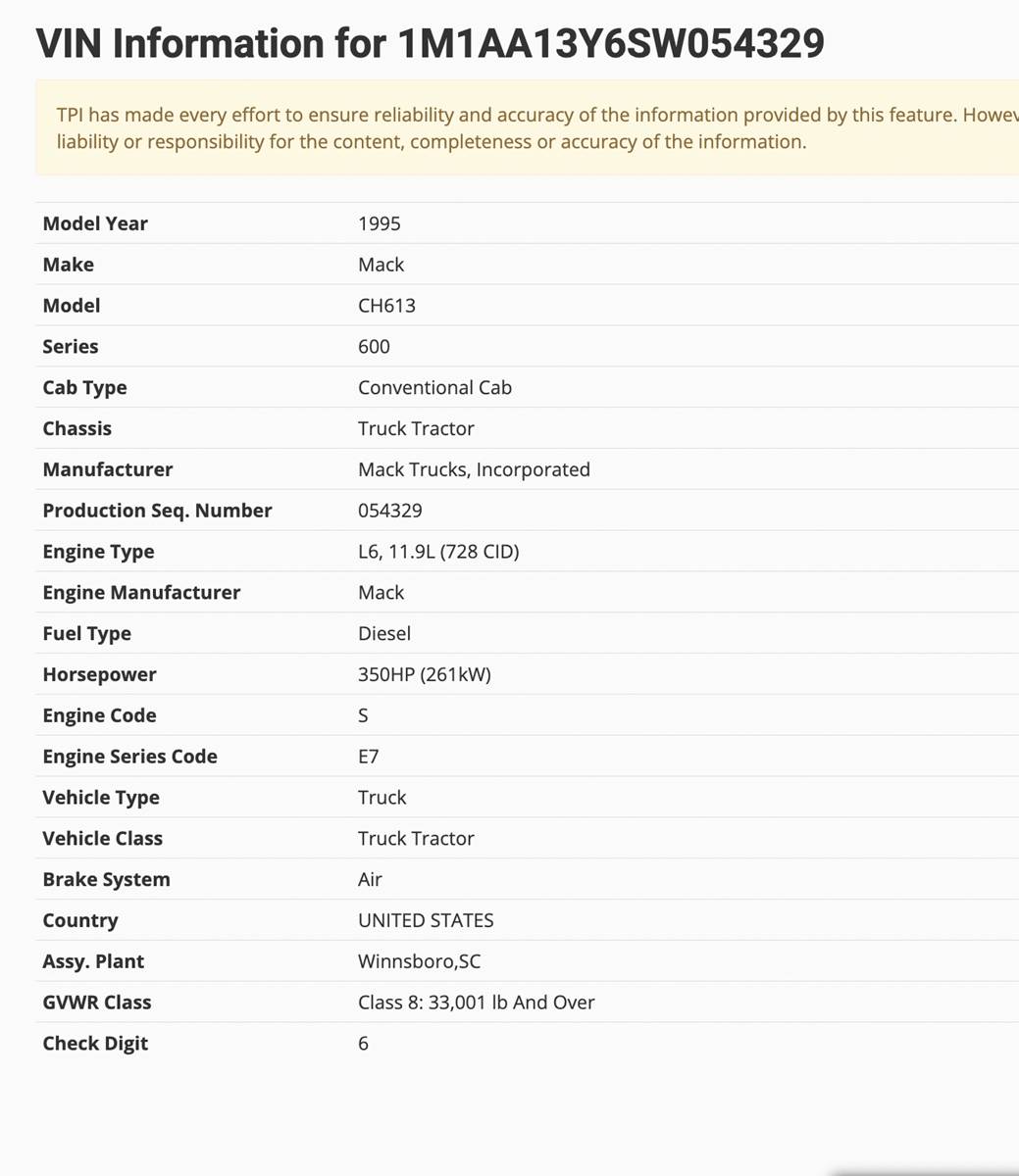 (USED ./ REPAIRABLE) 1995 MACK CH613 TRACTOR TRUCK 600 SERIES CAB FOR SALE, VIN; 1M1AA13Y6SW054329, AIR BRAKE SYSTEM, OFF TRACTOR TRUCK w/ MACK E7350HP DIESEL ENGINE, CLASS8: 33,001 LB AND OVER, STOCK # 9968-1