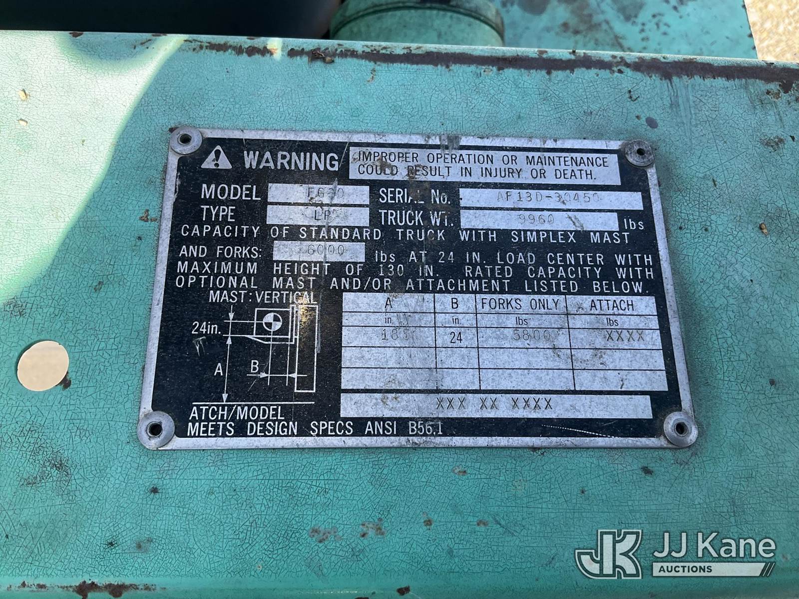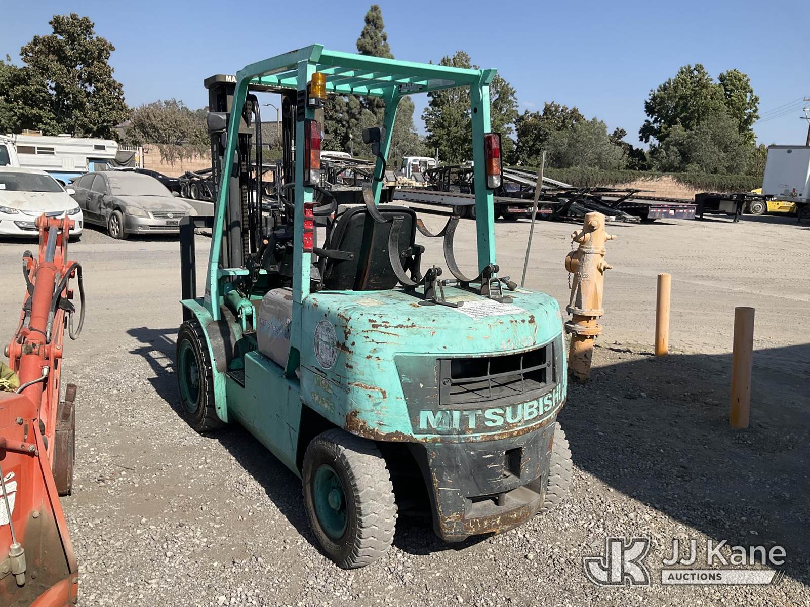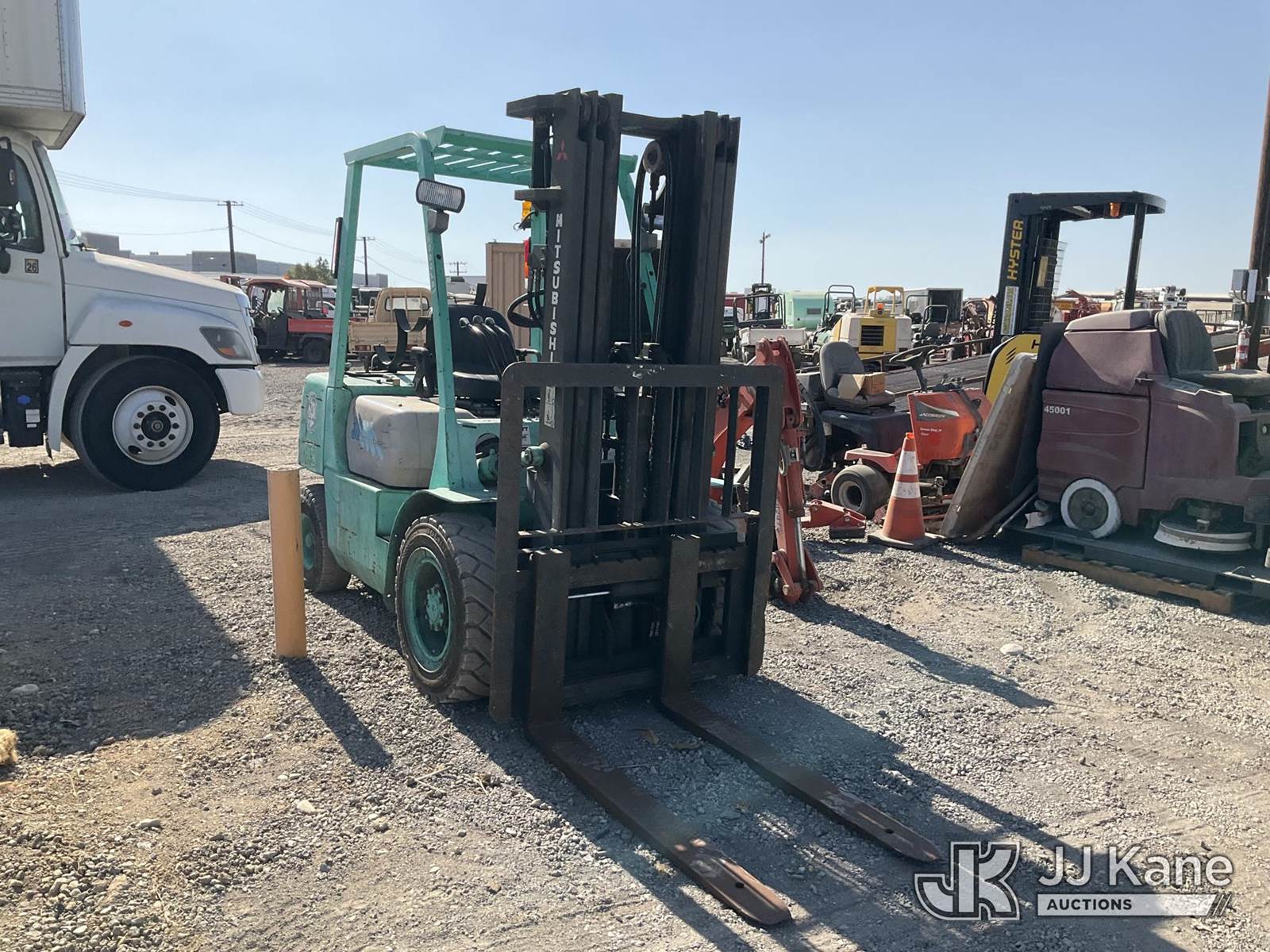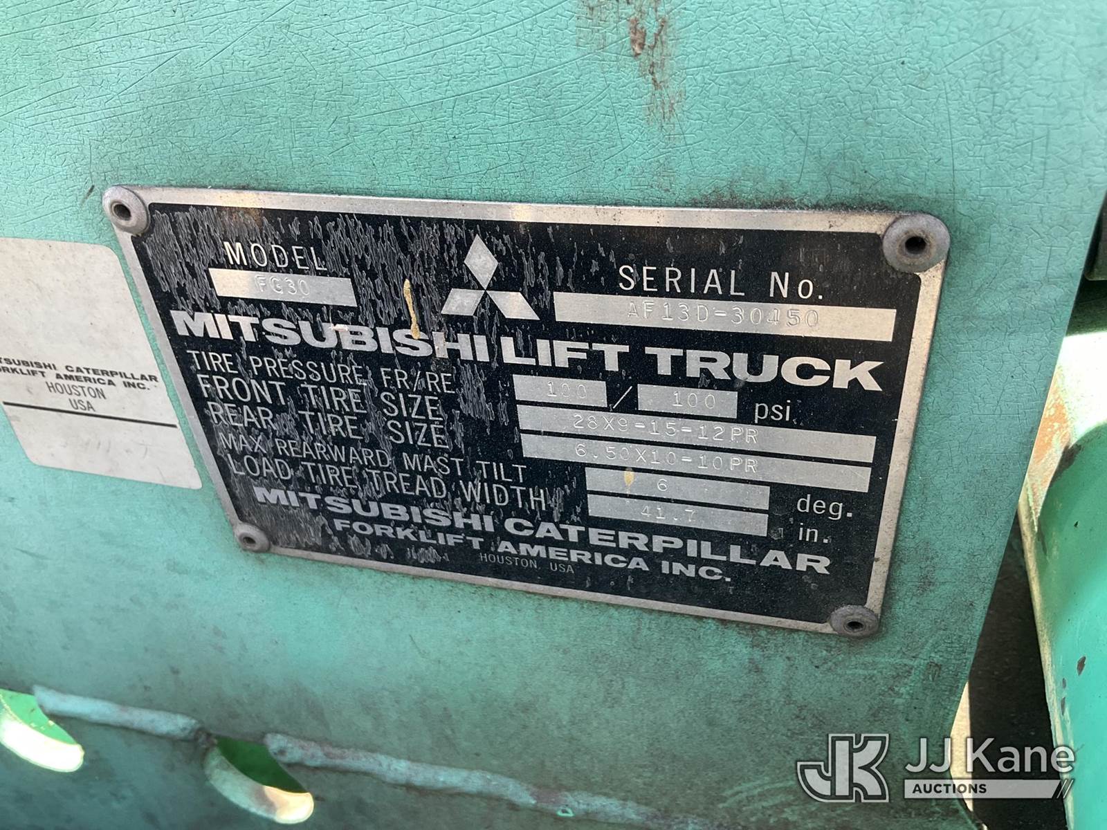 1995 MITSUBISHI FG30 Pneumatic Tired Forklift, s/n AF13D30450, 4-cyl, Dual Fuel (LPG & Gas), (Runs & Operates) (Reads 5,039 hours) NOTE: This unit is being sold AS IS/WHERE IS via Timed Auction and is located in Jurupa Valley, CA. Inspection & preview days for this unit are the 2 business days prior to the first day of items closing for this auction, item is located at 4510 Muth Way Jurupa Valley, CA 92509 and hours of operations are 8a-4p. For pre-sale questions, please contact please contact Office Staff @ (310) 353-7140. Dealer License Number 45696. (Buyer is responsible for removal. Assistance by consignor or JJ Kane Auctioneers is not assured.)