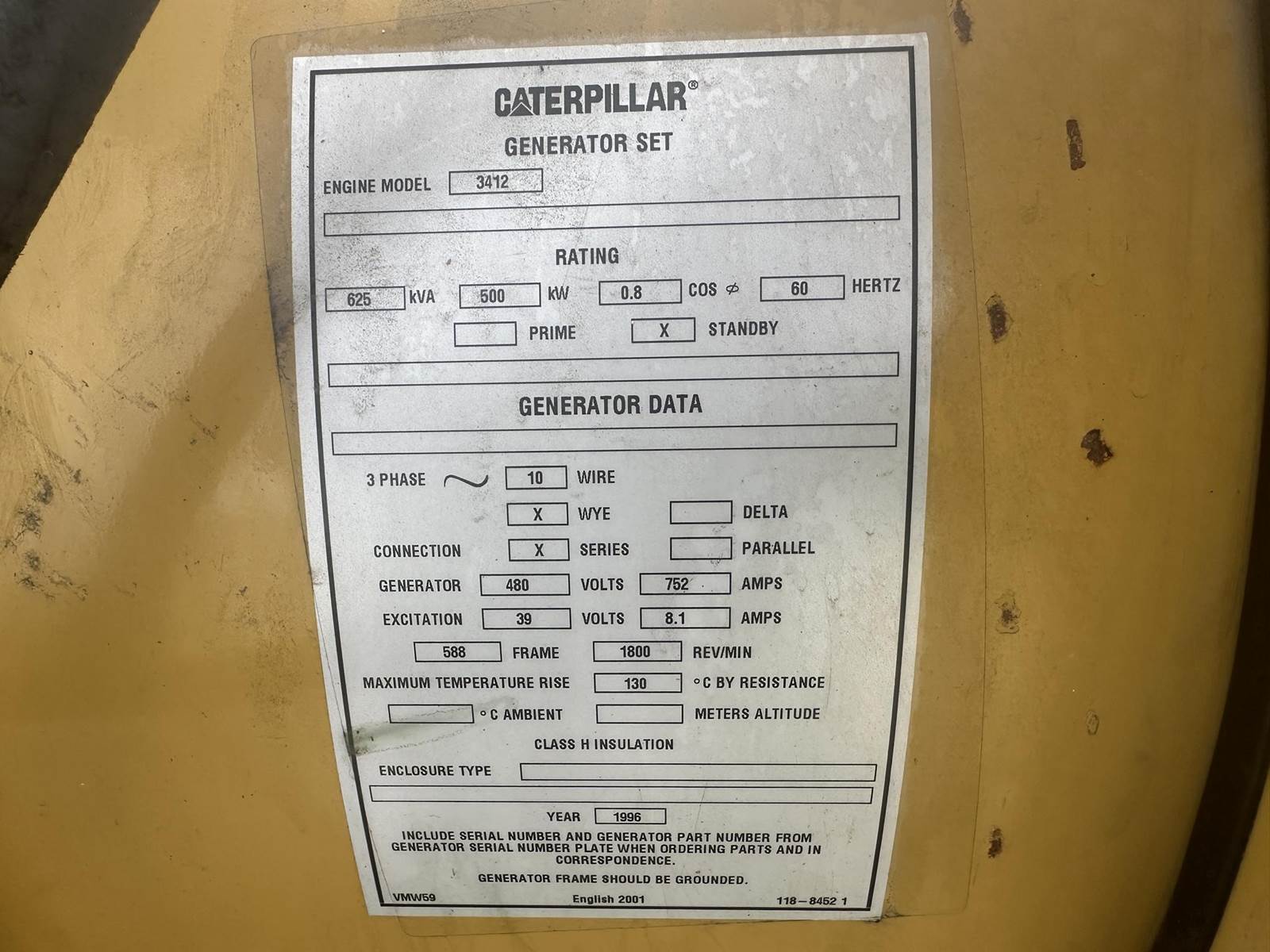 Caterpillar 500 kW standby diesel generator set. CAT 3412 engine rated 749 HP at 1800 RPM, SN-81Z20306. 3/60/277/480V, 10 reconnectable to other voltages. 800 Amp main-line circuit breaker. EMCP II digital control panel. Coolant heater. No batteries. Open power unit with engine driven radiator. 251 Hrs. Year 1996. Load test pending. Overall dimensions 56W x 150L x 83H on 6H blocks, 9,800 lbs. FOB Waukesha, WI.