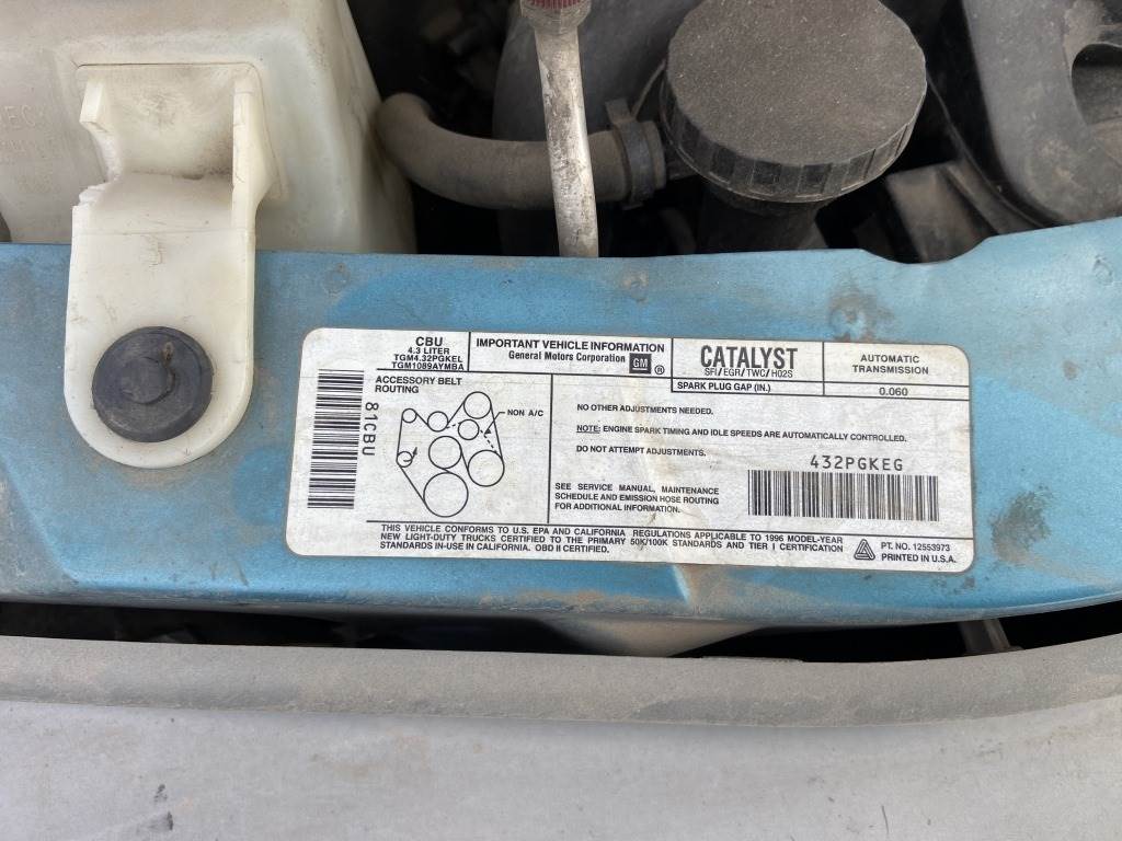 Location: Spokane WA ***County Government Surplus*** VIN: 1GNDM19W0TB185654 Engine: 4.3L 6cyl Gas Transmission: Automatic *Body damage* Cab divider, Proto tool cabinet, A/C, AM/FM/Cassette, spring suspension, LT215/75R15 tires. Miles: 144,351