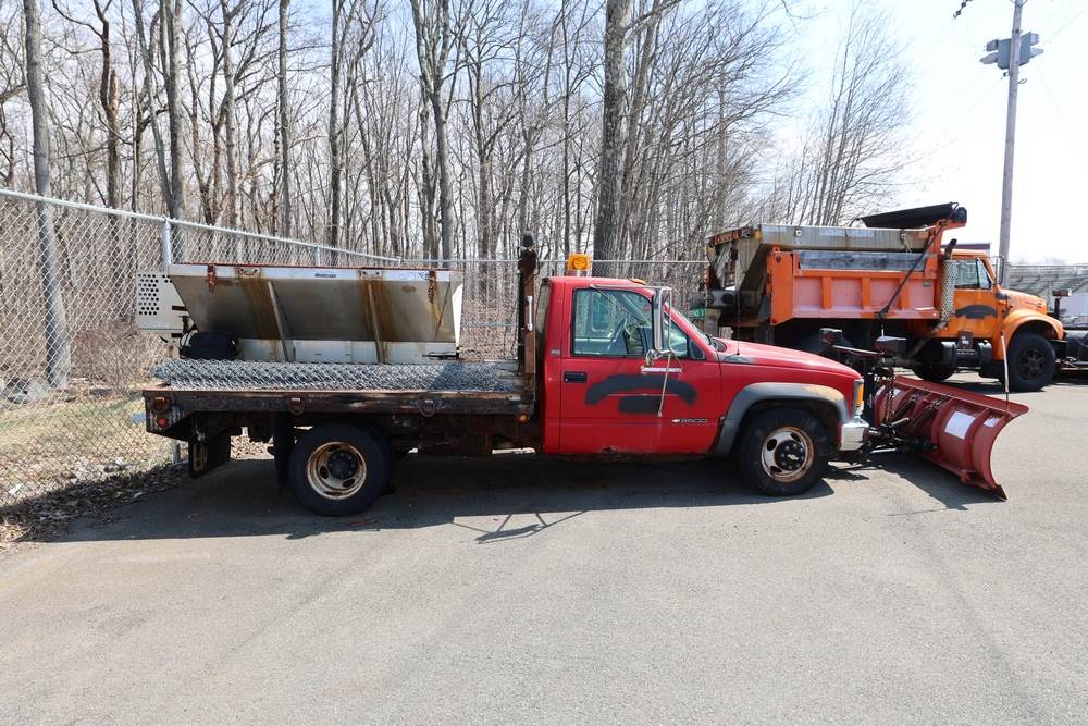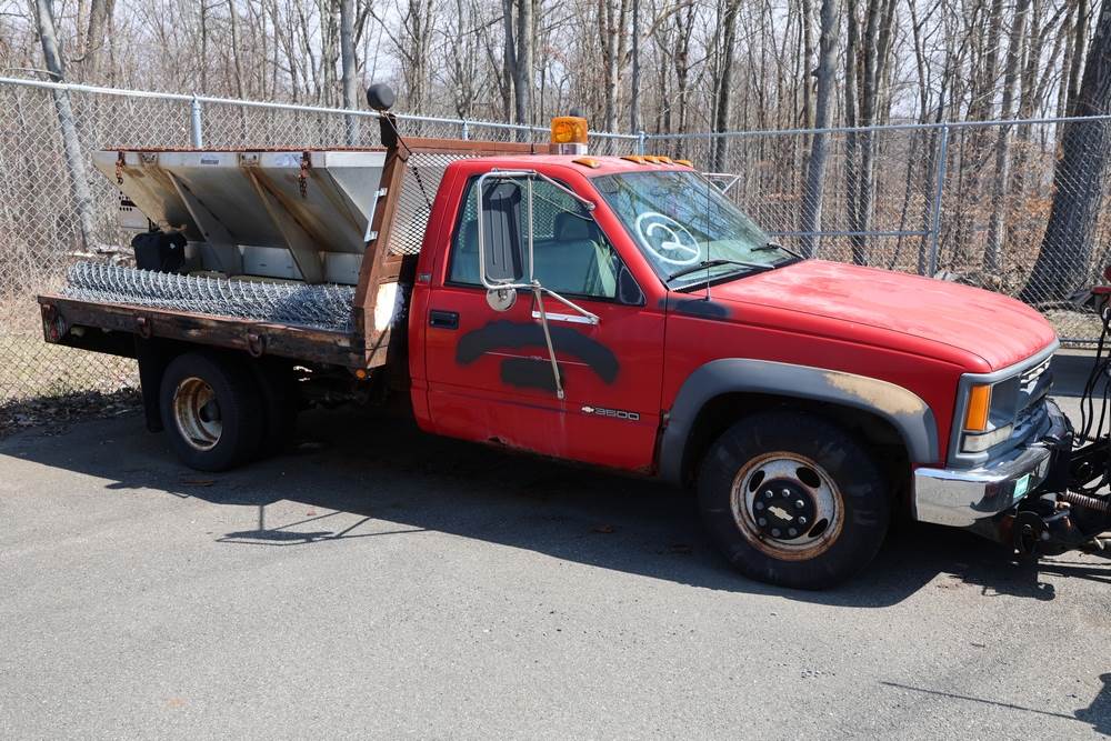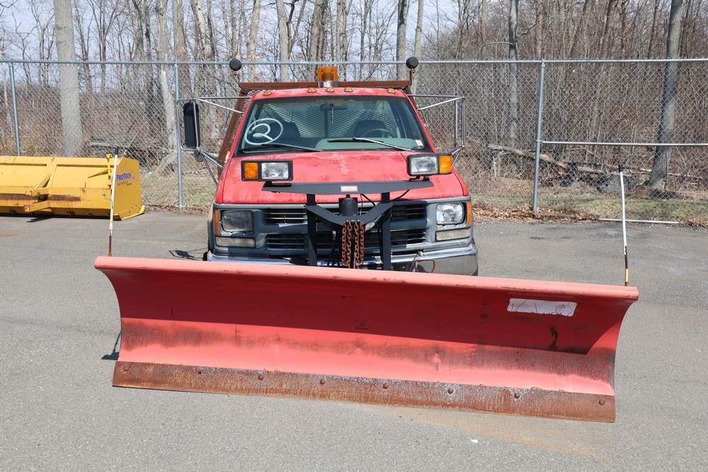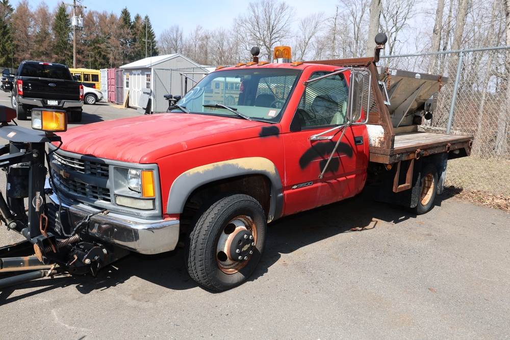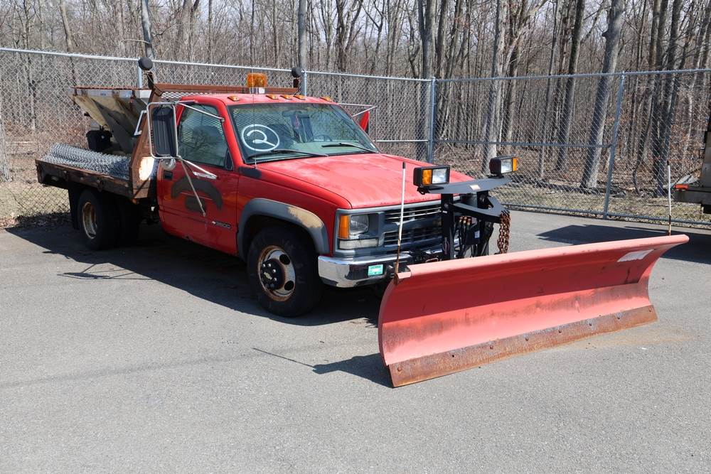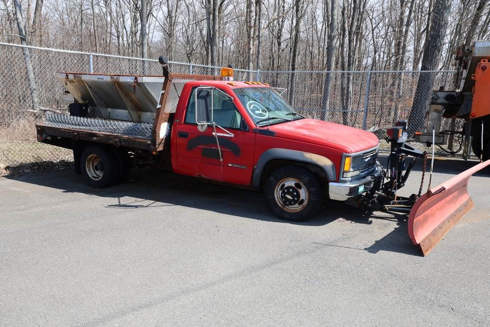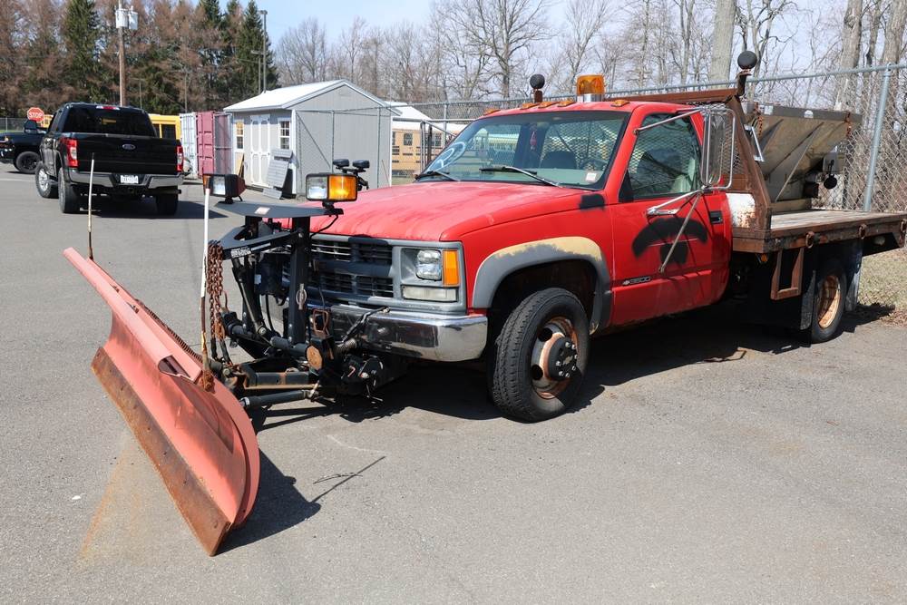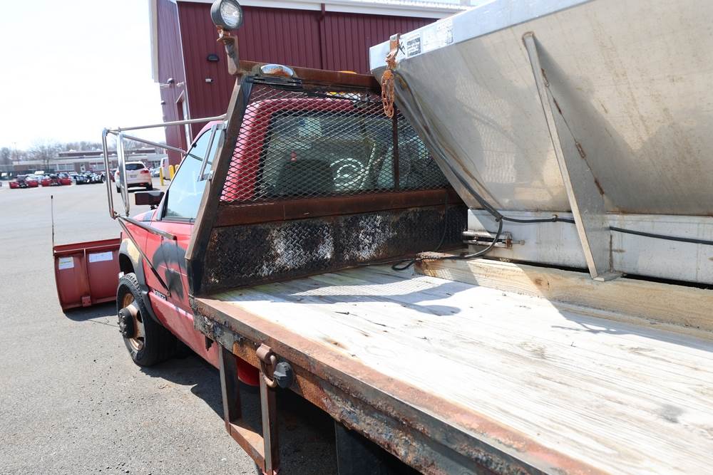 1996 Chevrolet C/K 3500 Flatbed. VIN: 1GBJK34R1TE185681. Body: Chassis 2D. Engine: 5.7L V8 FI Gasoline. Asset #: F208. Odometer reading: 68292. Seller reports: Ran when parked, must be towed, fencing not included. Salt spreader, front plow. Title & key available.