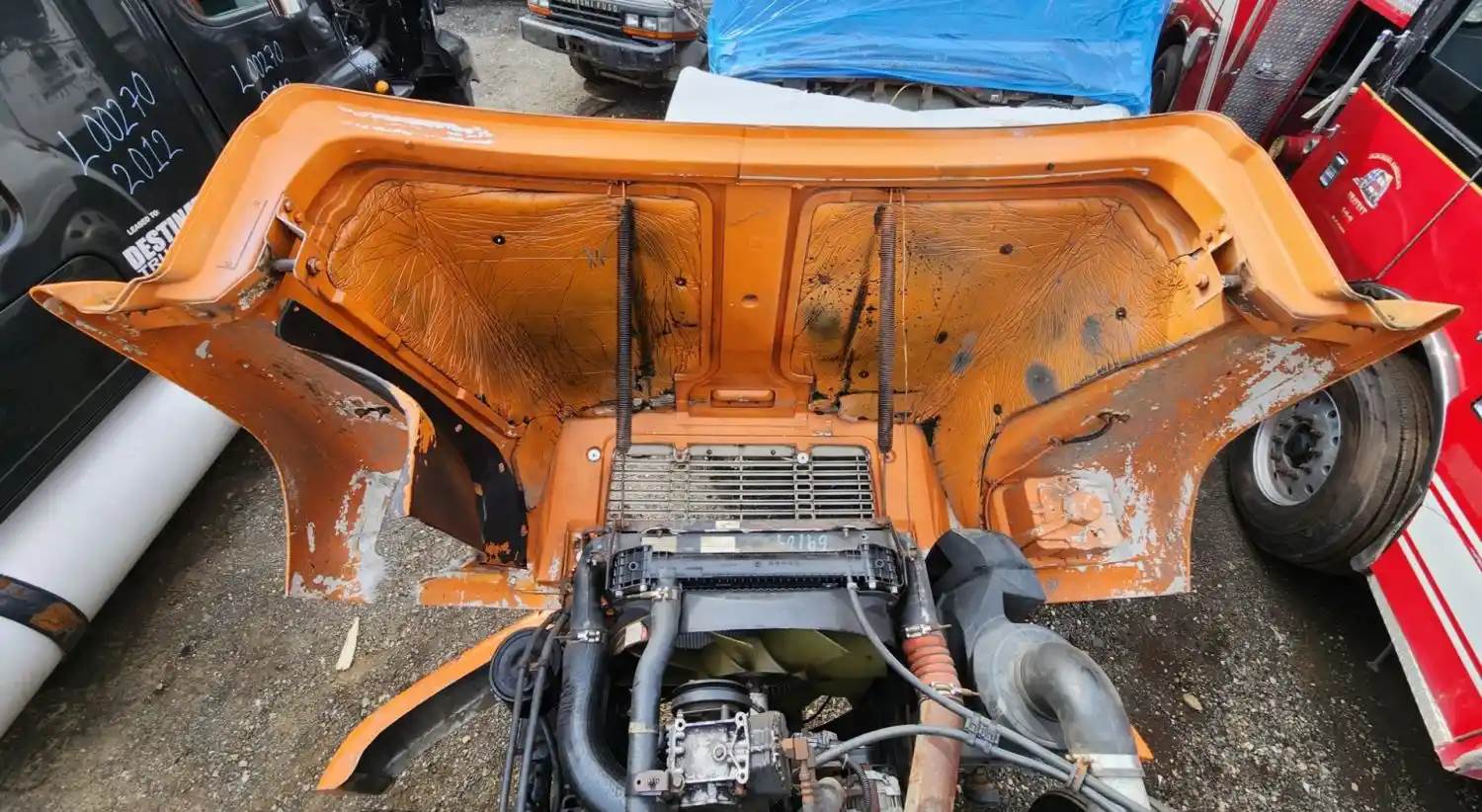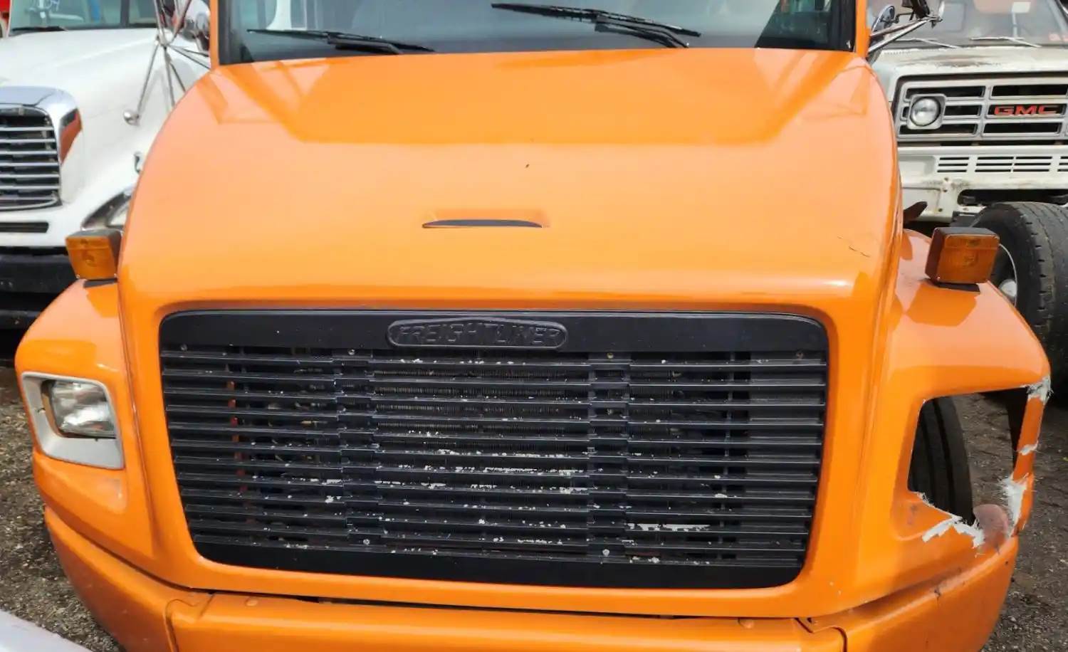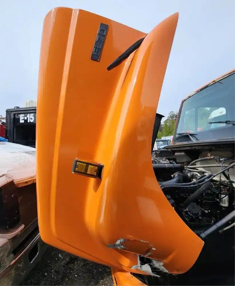 (Used) 1996 Freightliner FL70, HOOD ASSEMBLY- Length: 45" From Cowl to grille, Color: Orange, Material: Fiberglass, Damage Reference images for condition, For more information about this item, give us a call. We ship Worldwide! (CRG HEAVY TRUCK PARTS) 929 W PULASKI HWY ELKTON, MD 21921, Length: 45" From Cowl to grille, Type: Manual