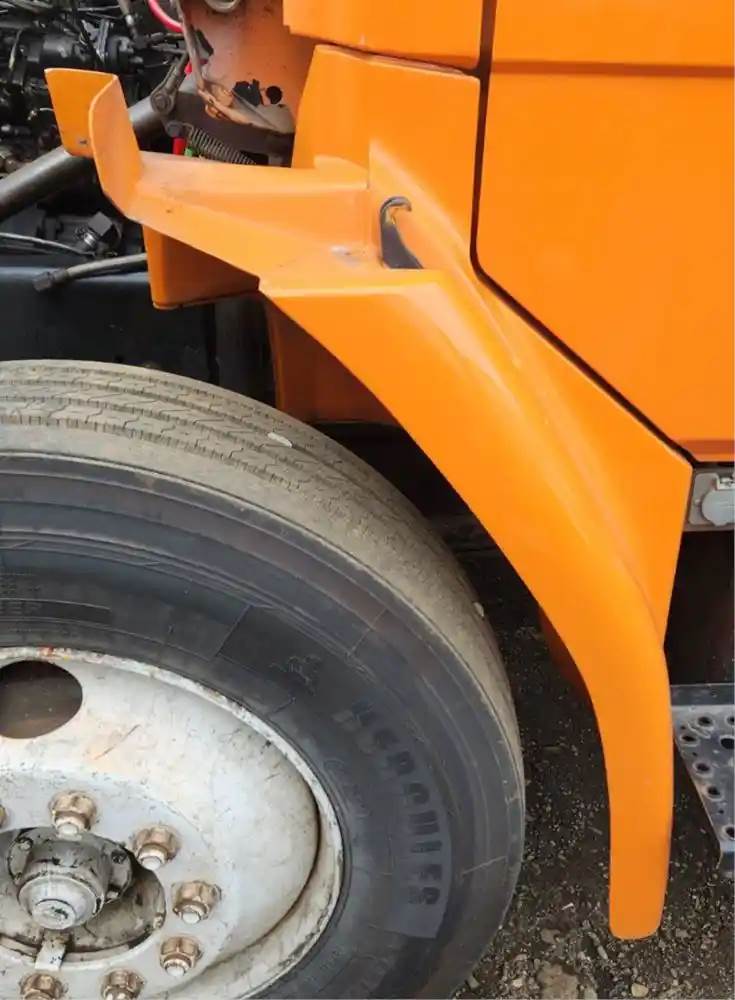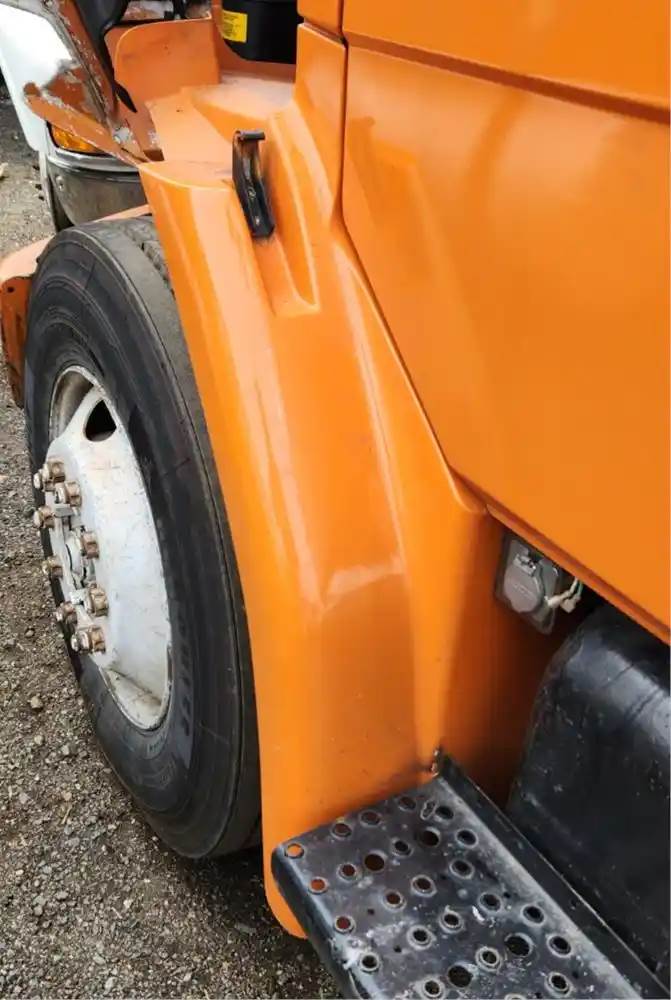 (Used) 1996 Freightliner FL70, FENDER EXTENSION- Side: Driver Left Side, Color: Orange, Material: Fiberglass, Damage Reference images for condition, For more information about this item, give us a call. We ship Worldwide! (CRG HEAVY TRUCK PARTS) 929 W PULASKI HWY ELKTON, MD 21921