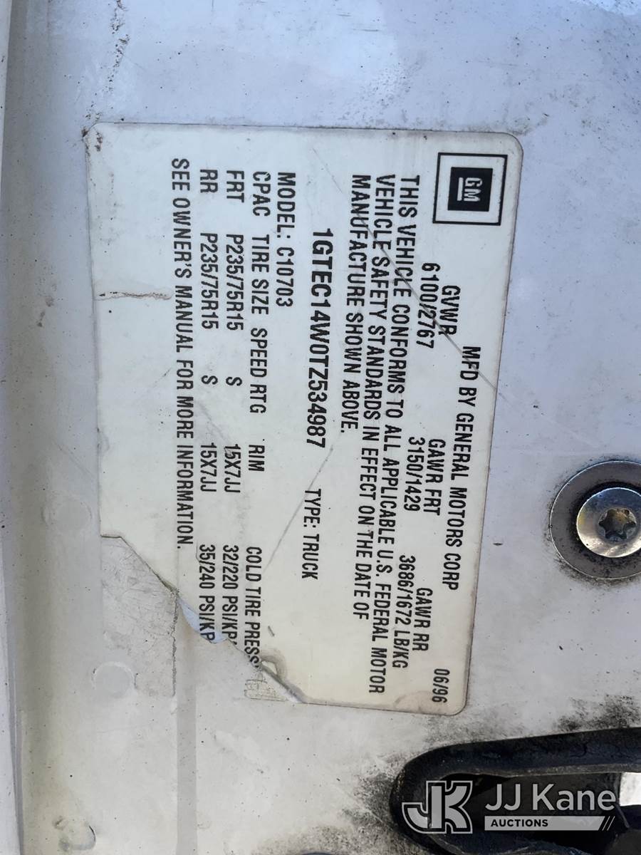 1996 GMC Sierra C/K 1500 Pickup Truck, 4.3L V6 OHV 12V gas, Auto, RWD, A/C, (Exempt from Odometer Disclosure - Reads 68,921 miles) (Runs & Moves) (Drivers Inside Door Handle Broken, Body/Paint Damage) This is a Titled Item NOTE: This unit is being sold AS IS/WHERE IS via Timed Auction and is located in Ocala, FL. Inspection & preview days for this unit are by appointment only; please contact us at contact@jjkane.com or 84-Go-JJKane for more details. For more information & removal arrangements please contact Mike Lessard @ (352) 629-6677. (Buyer is responsible for removal. Assistance by consignor or JJ Kane Auctions is not assured.)