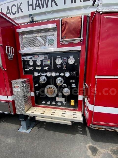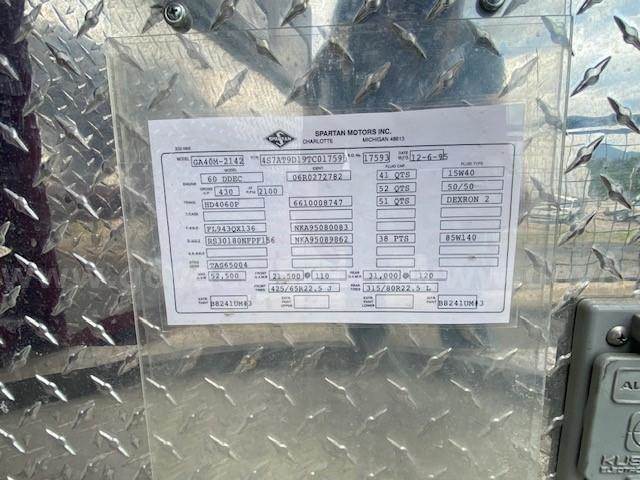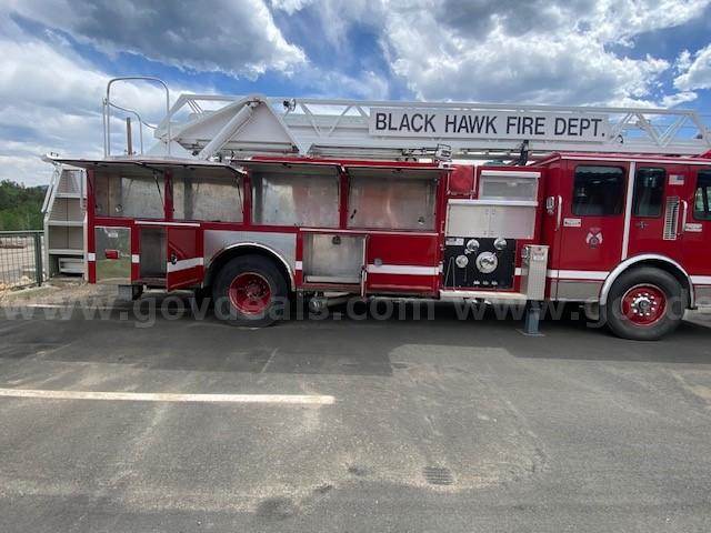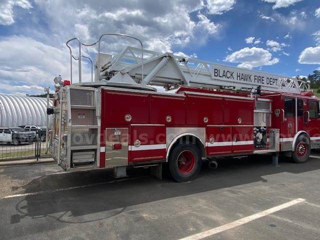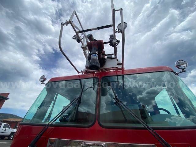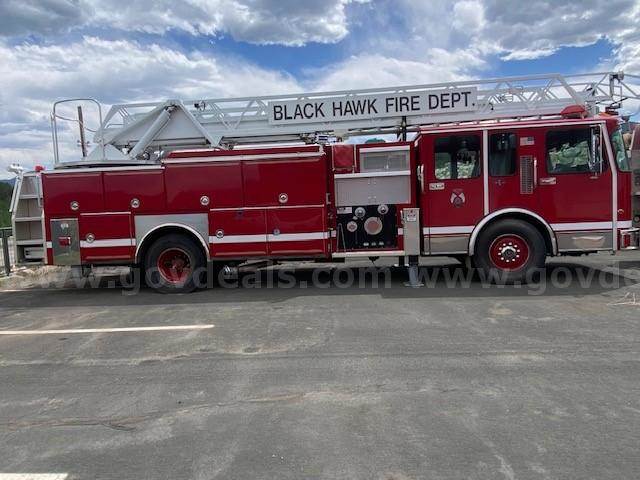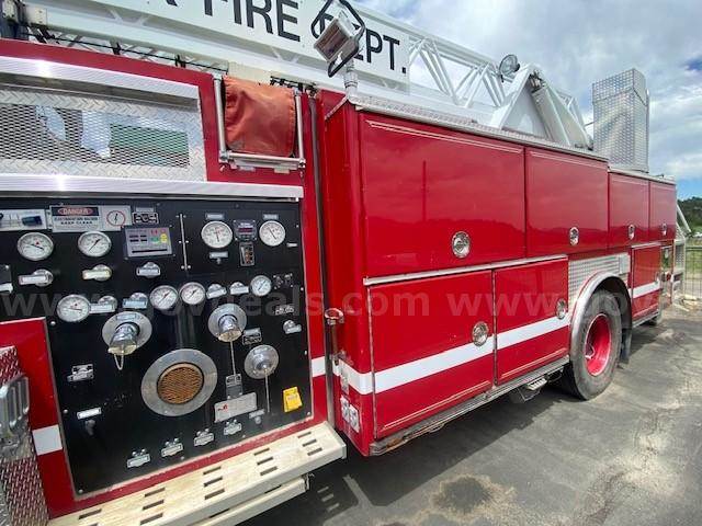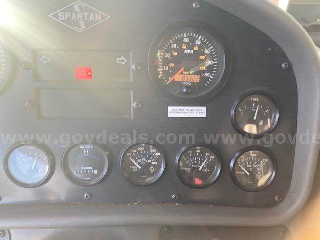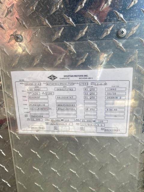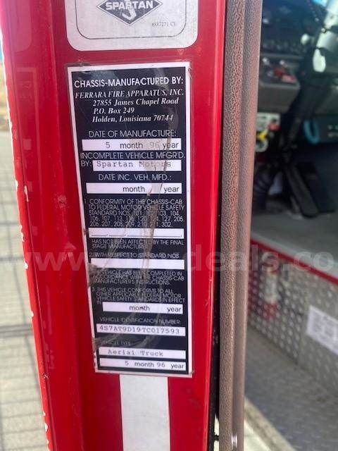 1996 Spartan MetroStar Ladder Truck 75’ Aerial Ladder Truck Detroit Diesel Series 60DDEC runs well Allison Transmission Model 4060 is in good condition Mileage: 8,532 4-door aluminum tilt cab Wheel base 220” 50gal Fuel tank Front Tire size: 425/65R22.5 J Rear Tire size: 315/80R22.5 L Hale Fire pump model OSA125-23L stage single, which has been removed (was bad) Water Tank Capacity: 500 gallons Aerial Manufacturer R.K. Manufacturing The Truck Engine and Transmission are in good condition Decals were removed; some impressions may be present The buyer will have to have a way to tow it away **GovDeals.com is the online auction platform where you can bid on and buy government surplus**