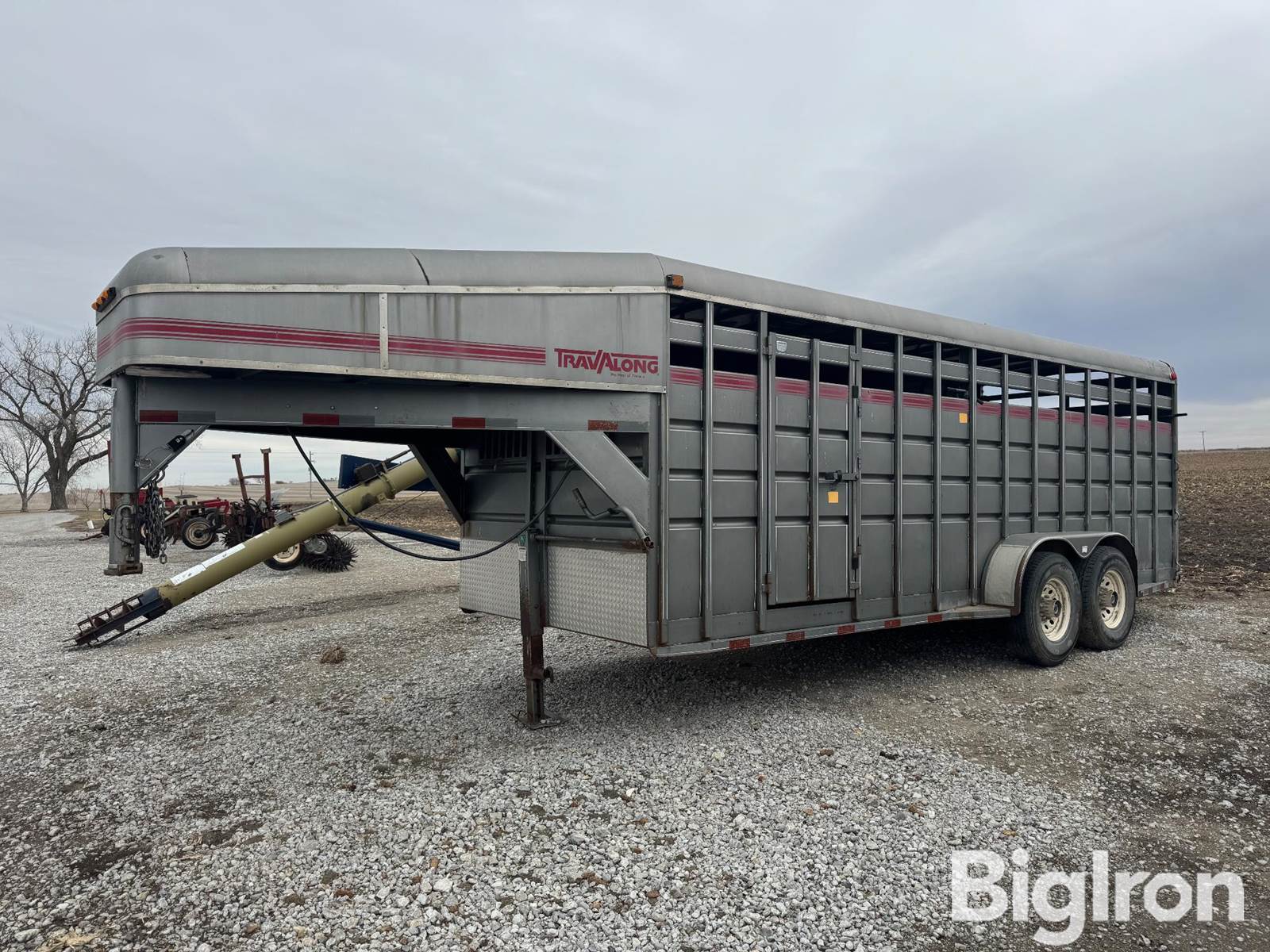 1996 Travalong 20’ T/A gooseneck Livestock trailer, adjustable 2 5/16” gooseneck hitch, 20’ x 6’ 8” inside with split gate, wood floor, rear slide and swing gate, 235/85R16 tires, 8 bolt hubs, torsion axle suspension, electric brakes, front 28” walk in door, over tongue feed storage, rank jack, 7 way electric plug in, aluminum rock guard, VIN: 4DYGS2024T1014245