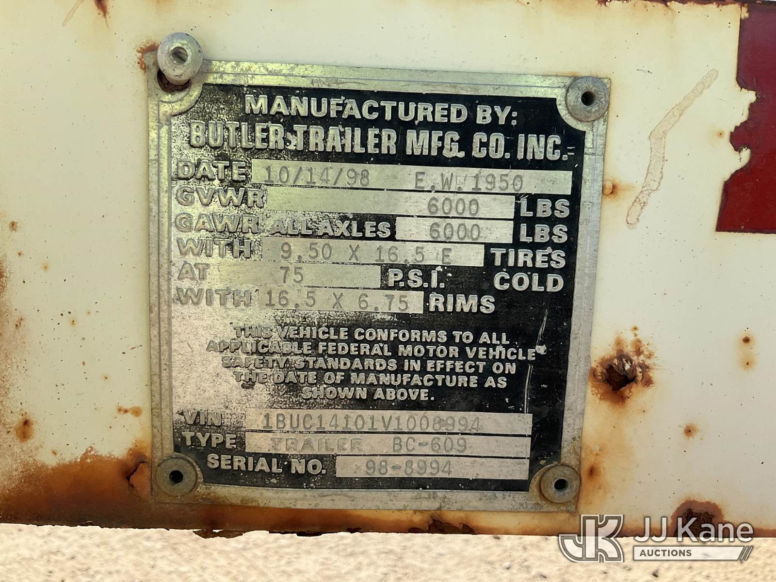 1997 Butler BC-609 S/A Tagalong Utility Trailer, with 8 ft 5 in. level deck between wheels, (Rust Damage) This is a Titled Item NOTE: This unit is being sold AS IS/WHERE IS via Timed Auction and is located in South Beloit, IL. Inspection & preview days for this unit are the 2 business days prior to the first day of items closing for this auction, item is located at 14354 Dearborn Ave South Beloit, IL and hours of operations are 8a-4p. For pre-sale questions, please contact Derek Eklund at (608) 904-0618 or (derek.eklund@jjkane.com). (Buyer is responsible for removal. Assistance by consignor or JJ Kane Auctioneers is not assured.)