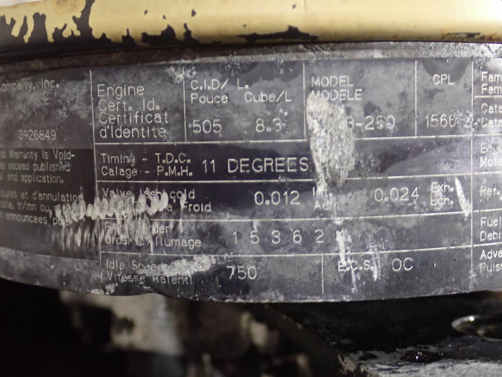 1997 Cummins 6CTAA 250 diesel engine, 6CTA 8.3 liter, 250 HP, air to air intercooled, Ford truck applications, CPL 1566, mechanical fuel system. STRONG RUNNER, SEE VIDEO. 90 PSI OIL PRESSURE AT COLD IDLE AND 100 PSI AT MID THROTTLE -- NO SMOKE OR BLOWBY OBSERVED DURING COLD TEST RUN, NICE ENGINE.