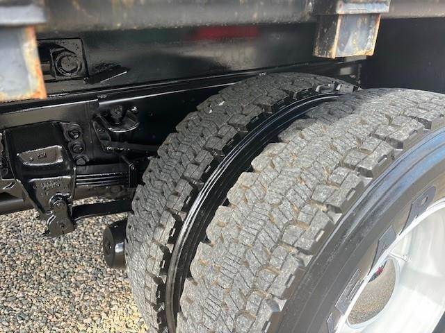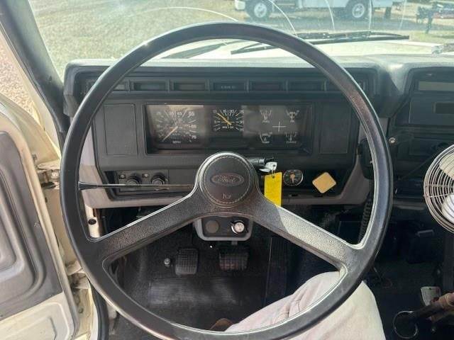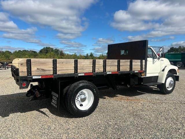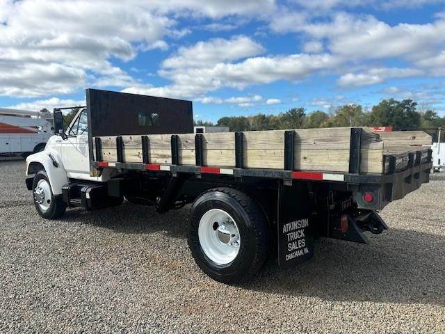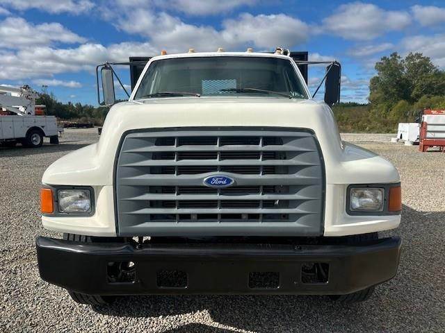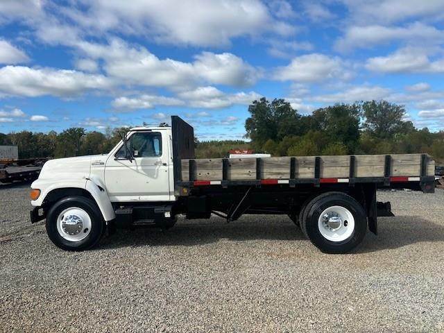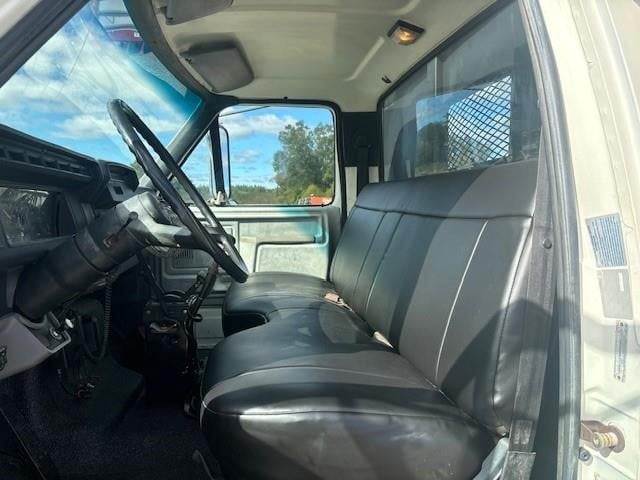 1997 Ford F-800 --- Single Axle, 5.9 Cummins 190 HP, Manual 5+2 Speed, 8,500 Front Axle, 17,500 Rear Axle, 177" Wheelbase, 14' 9" Bridge, Spring, Air Brake, Pintle Hitch with Electric Brakes, 14' Steel OX Flat Dump Body, Steel Wheels, High Level Interior, P/S,