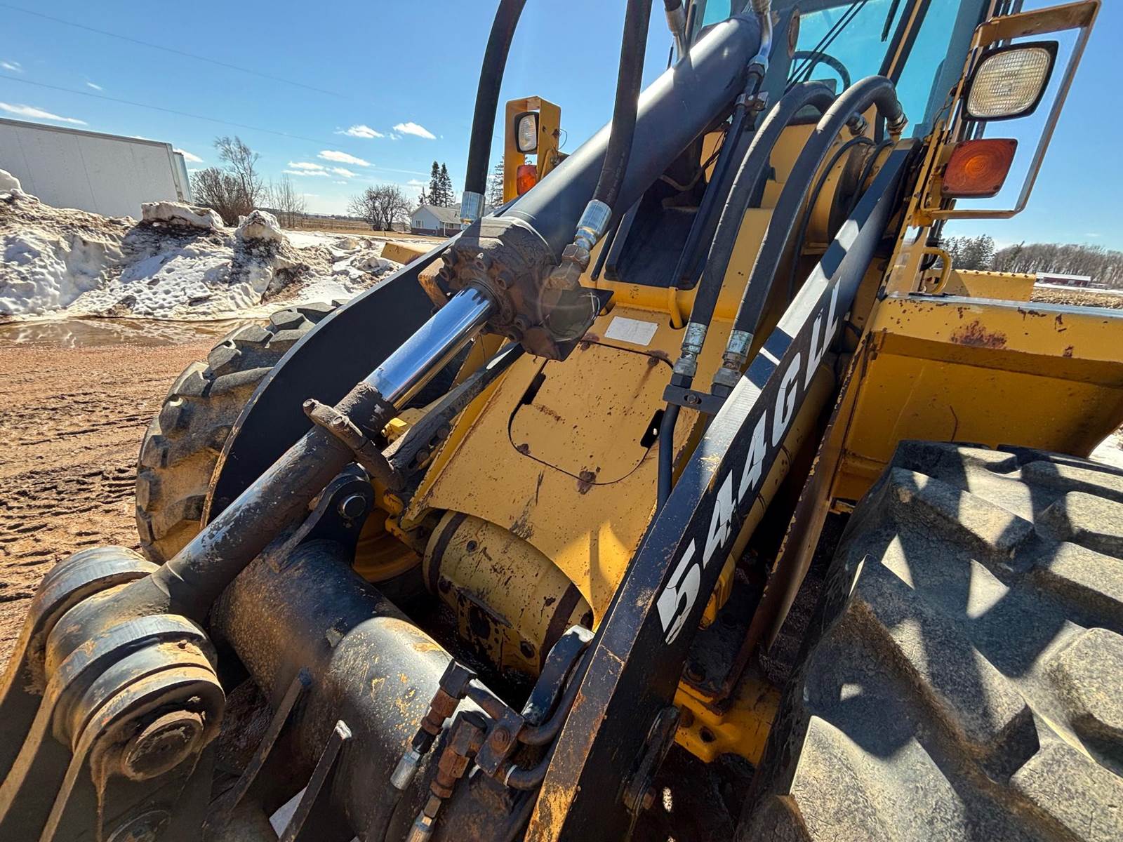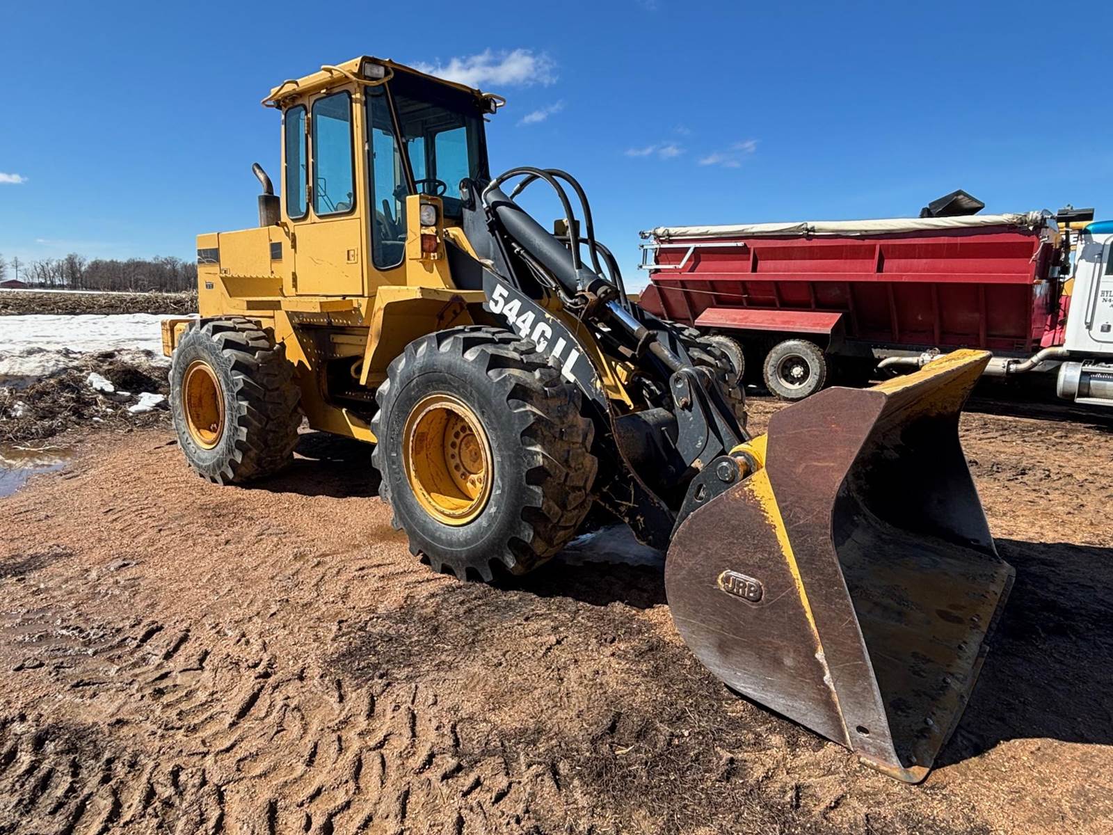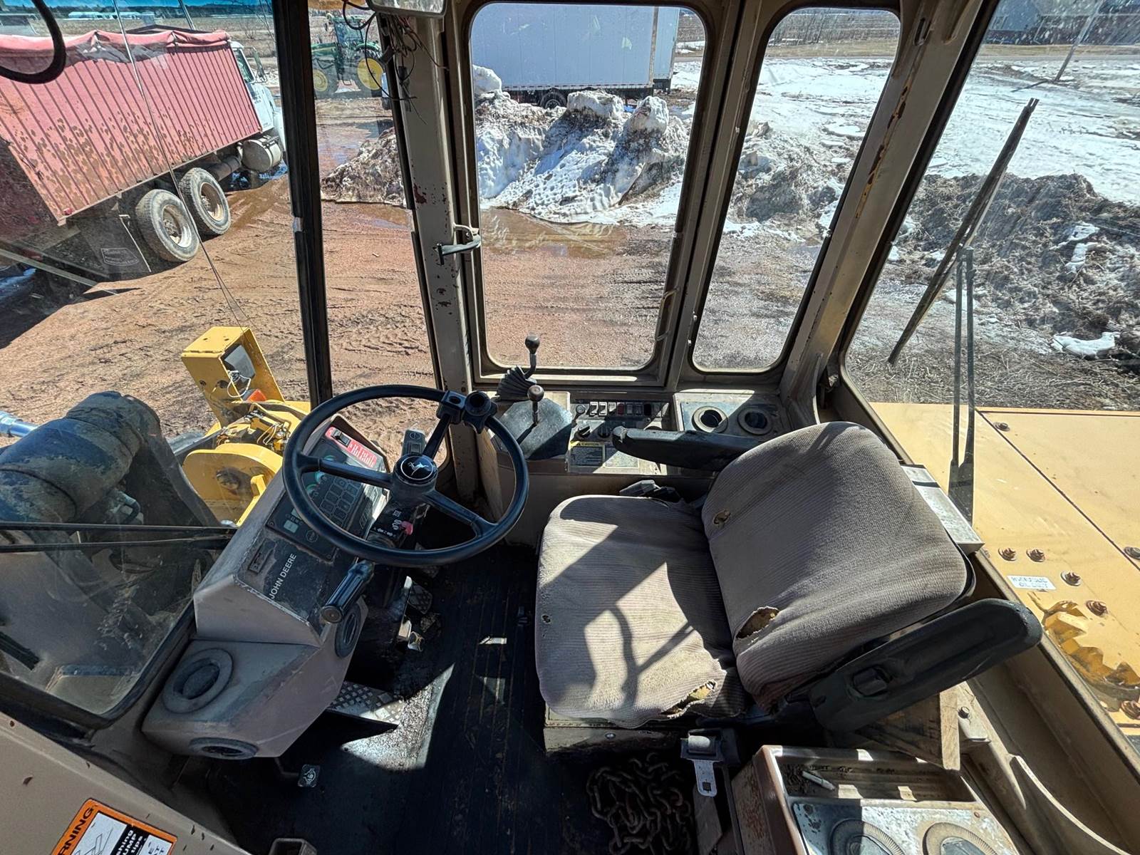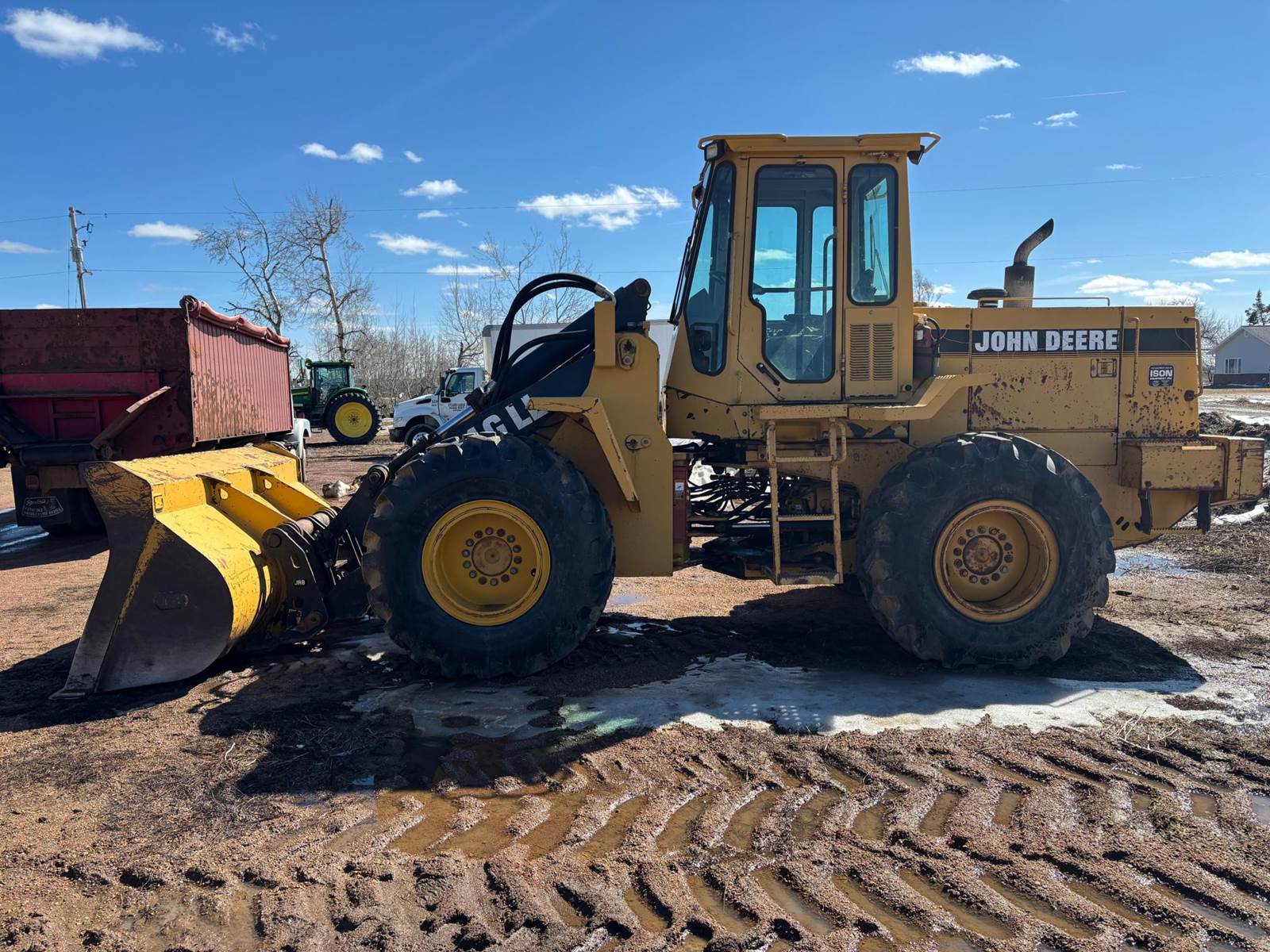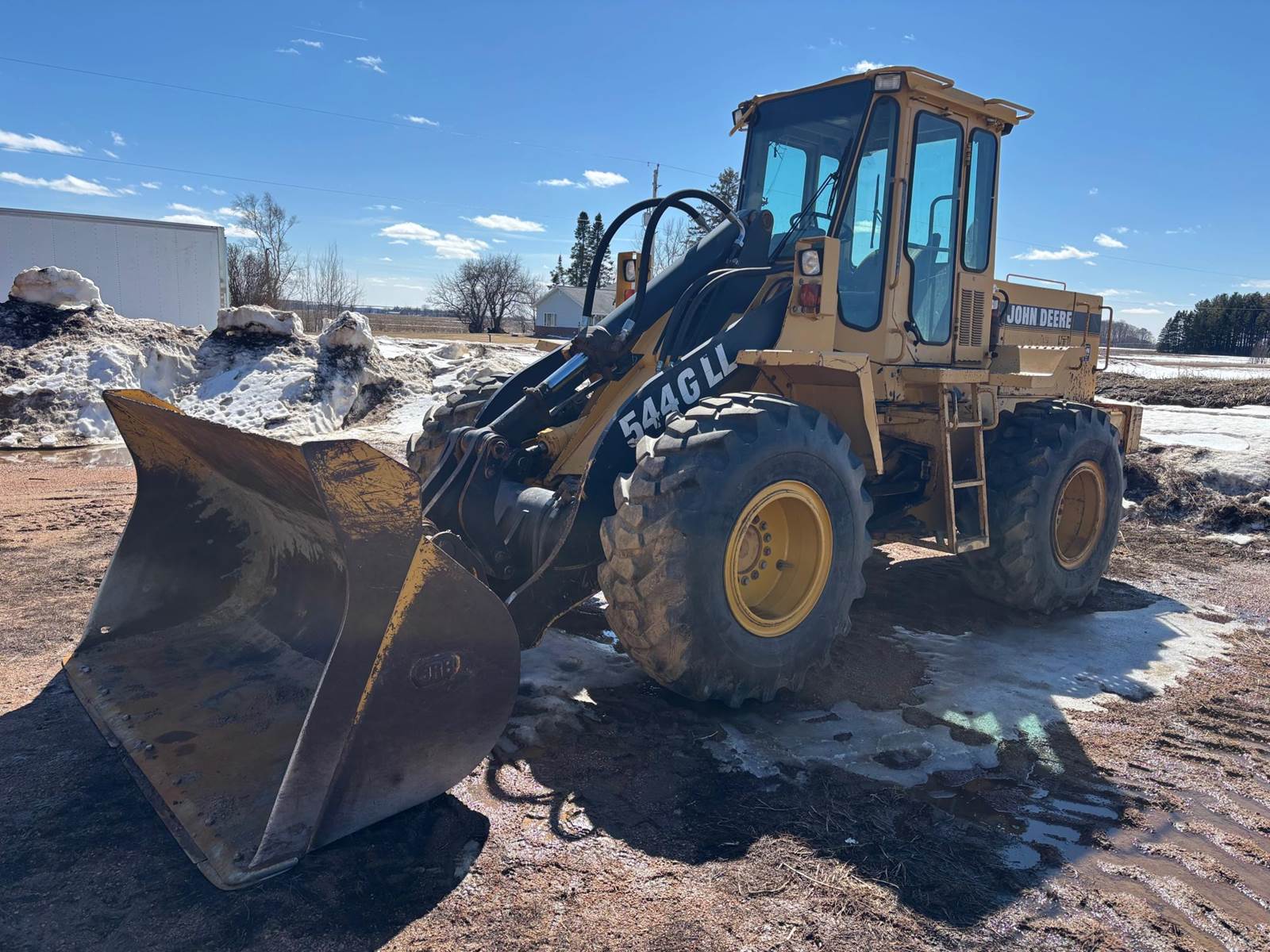 1997 John Deere 544G LL Wheeled Loader, 8,500 estimated hours (meter incorrect). The following items have maybe 600 hours and repairs completed at dealer; tires, bushings, pins, ram seal, center pivot. The front arms and bucket are tight. Quick connect and Auxiliary hydraulics. There is a crack in front windshield a pops out of 4th gear. Engine: 6-cylinder John Deere 6059T Diesel, 120-125 hp. Operating Weight: Approx. 23,246–25,000 lbs., Bucket Capacity: 2.5 – 3.0 cu yd (standard). Power shift, 4 forward gears, 3 reverse gears. Hydraulic System: ~36 GPM, 2,900 PSI, 2-function loader controls. Tires: 17.5-25 or 20.5R25. Runs well and starts in the coldest weather.