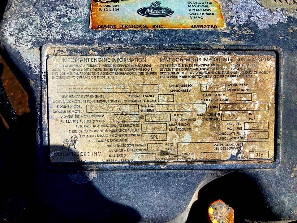 GOOD USED 1997 MACK EM7-300 4 VALVE MECHANICAL DIESEL TAKEOUT ENGINE FOR SALE at ADELMAN’S TRUCK PARTS in CANTON, OHIO. COMPLETE and RUN TESTED, MAXIDYNE ENGINE, 300 HP @ 1750 RPM, 29672P3 11GBA #, 4 VALVE HEAD, with MECHANICAL INJECTION PUMP, and 70+ LBS OIL PRESSURE.