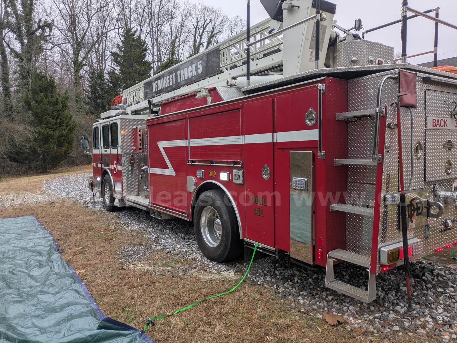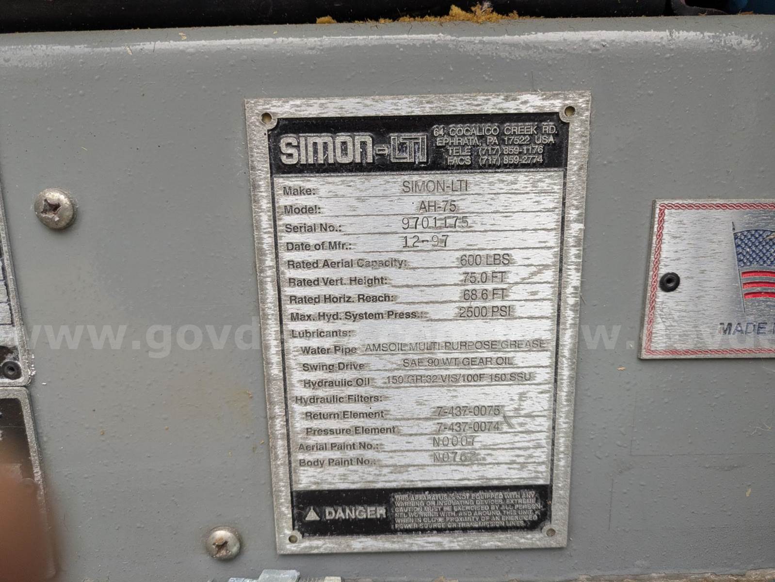 1997 Simon Duplex Ladder Truck. Vehicle starts, runs, and drives. Taken out of service 12 months ago. Odometer is inoperable so exact mileage is unknown. The City obtained the truck in 2012 and there were 43,700 miles at time of purchase. Cummins 6L diesel engine is operable. Leaks oil. Allison automatic transmission is operable. Simon AH75 LTI 75' ladder. S/N: 9701175. Ladder and electrical system are not operating correctly. Hale 76596 pump is operable. No records of past pump test. 500 gallon poly tank. Tires in fair condition. Exterior is red and black with minor scratches and dings. No cracked glass. Seats are grey cloth with some damage. LED lights have been installed and are working correctly. Water way has been serviced with new seals.
