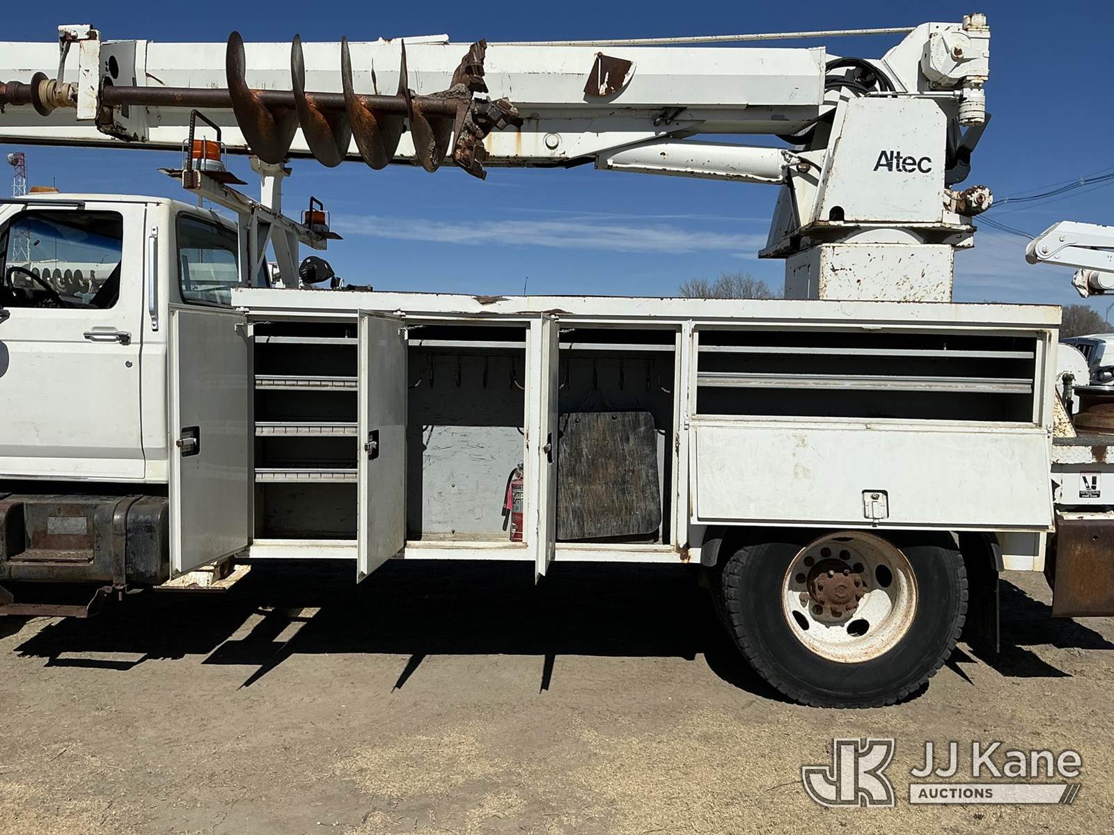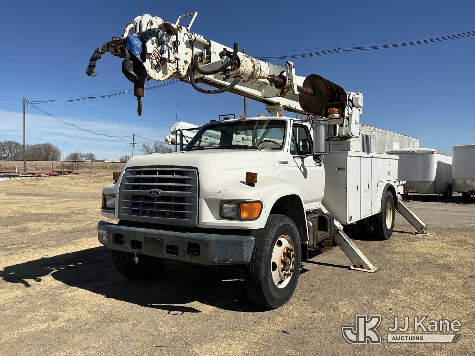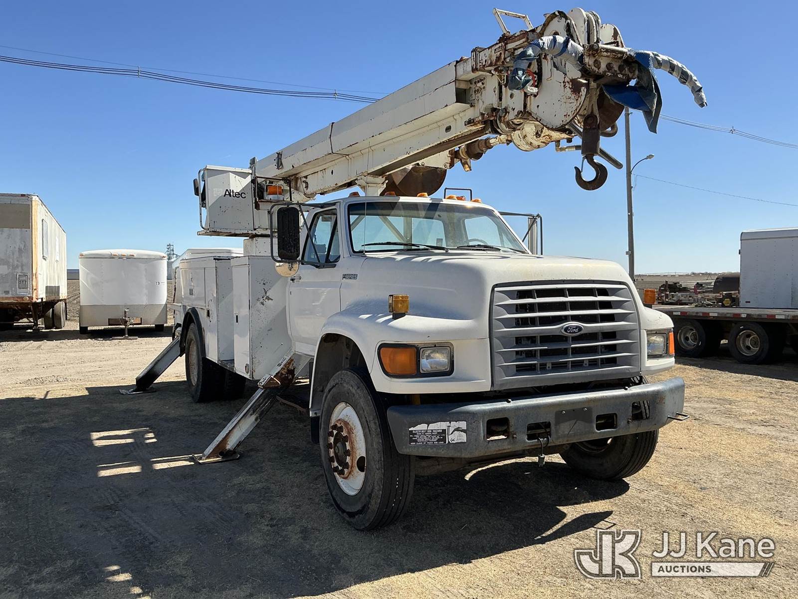 Altec D947-TR, 24,000 Lb Digger Derrick s/n 0797BA1093, with 47' sheave height, 2 spd digger, upper controls, heel winch, pole grabs, riding console & 4 outriggers, rear mounted on 1998 Ford F800 Utility Truck, 5.9L Diesel 4X2, Auto, A/C, (Exempt from Odometer Disclosure - Reads 70,508 miles) (Runs, Moves & Upper Operates) (The OEM has deemed this unit to have reached the End of Service life and will not provide service for the unit. Parts and/ or technical support for the unit may be limited, The manufacturer has notified JJ Kane that this equipment is subject to an open recall. 222 (CSN) Pivot Pin Inspection 236D (CSN) Rotation Brake Maintenance 237D (CSN) Upper Control Improvements 242AD (CSN) Adding Trunnion Pin Inspection Holes and Retorquing Trunnion Pins 244D (CSN) Digger Hanger Bracket and Latch Inspection 246D (CSN) Turntable Tilt Procedure Correction The equipment should not be operated until this is addressed. Buyer is responsible for reviewing the recall notice and contacting the manufacturer to schedule the recommended corrective actions. Associated costs may be covered by the manufacturer in some cases.) (Reads 11,015 hours) This is a Titled Item NOTE: This unit is being sold AS IS/WHERE IS via Timed Auction and is located in Holdrege, NE. For more information contact Austin Scott @ 816-205-2291 Removal by appointment only, Buyer/Hauler must present copy of paid invoice or release form upon arrival. Purchaser acknowledges ALL lots must be removed within 7 business days of Auction. For removal please reference the realease form sent out after purchase. (Manuals provided in cab) (Buyer is responsible for removal. Assistance by consignor or JJ Kane Auctions is not assured.)