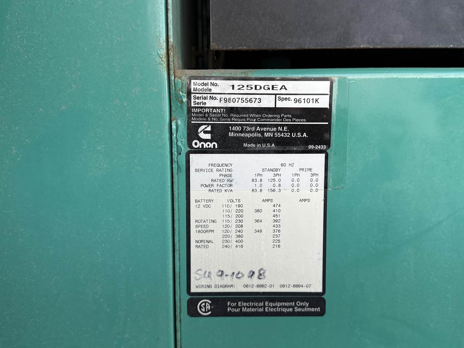 Cummins 125 kW standby (113 kW prime) diesel generator set model DGEA, SN-F980755673. Cummins 6CT8.3-G engine rated 207 HP at 1800 RPM, SN-45705802. 3/60/120/208V, 12 lead reconnectable to other voltages. 600 Amp main-line circuit breaker. Detector control panel. Coolant heater. Weather enclosure. 366 gallon UL listed sub-base fuel tank with secondary containment. Load test pending. 889 Hrs. Year 1998. Overall dimensions 40W x 106L x 101H on 6H blocks, 5100 lbs. FOB Waukesha, WI