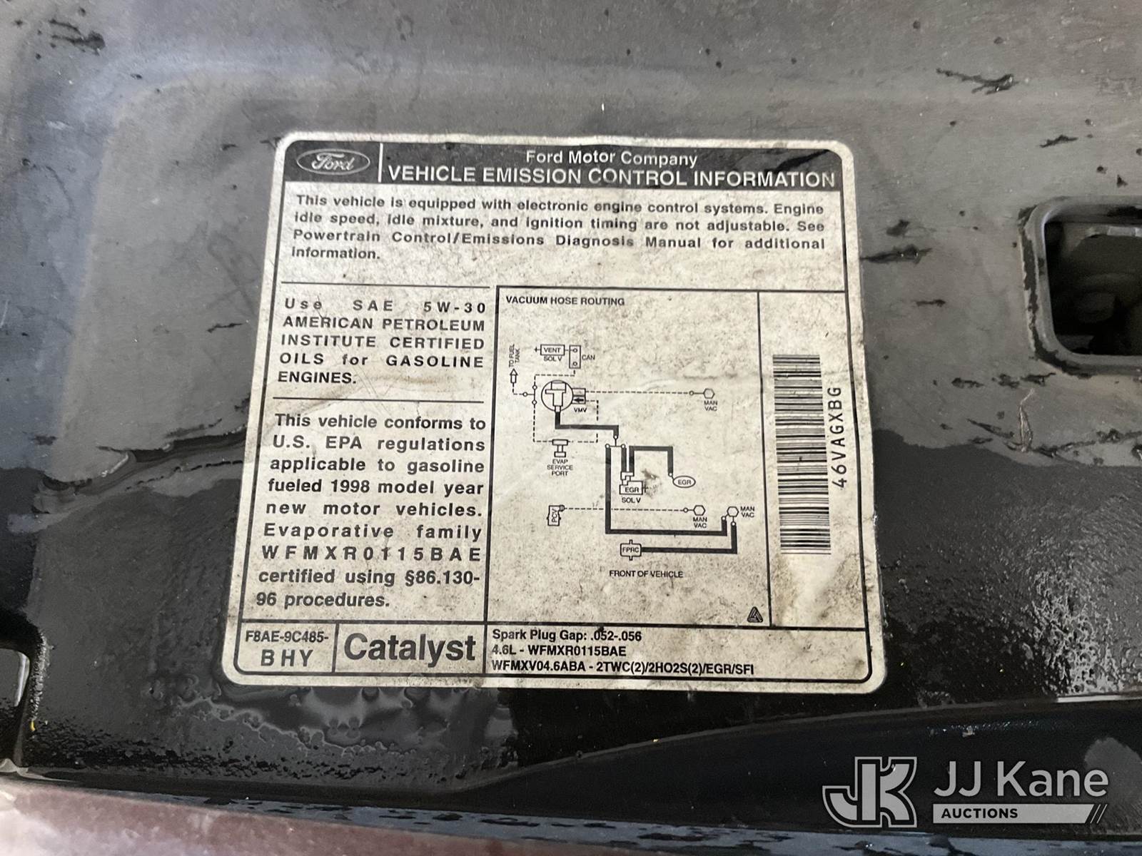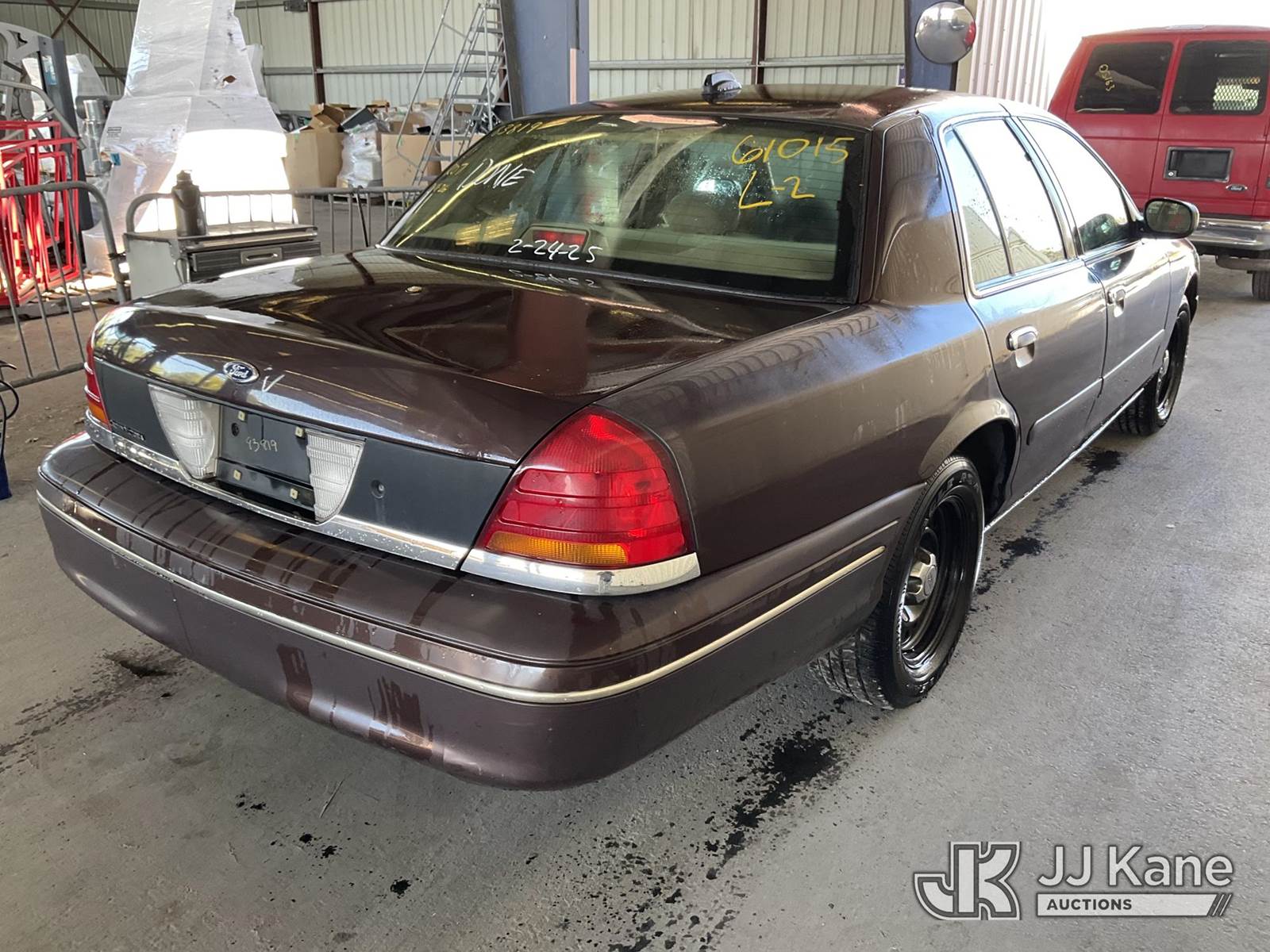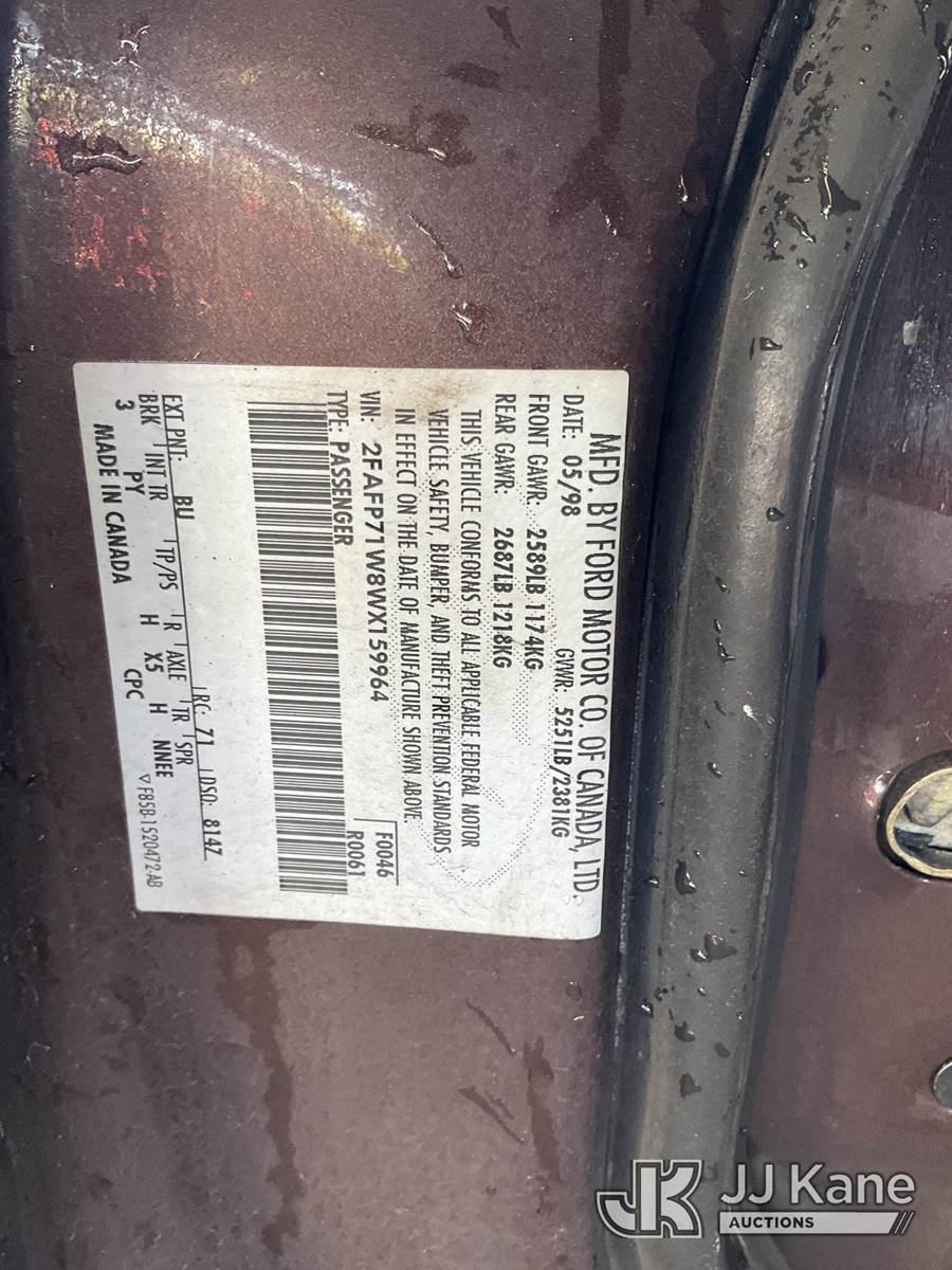 1998 Ford Crown Victoria Police Interceptor 4-Door Sedan, s/n 2FAFP71W8WX159964, 4.6L V8 SOHC 16V RWD, GAS, 4-Speed Automatic, A/C, (Exempt from Odometer Disclosure - Reads 129,142 miles) (Runs & Moves, Engine Light On, Missing Catalytic Converter) (Bidding Restricted to Licensed Vehicle Dealers Only), This is a Titled Item NOTE: This unit is being sold AS IS/WHERE IS via Timed Auction and is located in Jurupa Valley, CA. Inspection & preview days for this unit are the 2 business days prior to the first day of items closing for this auction, item is located at 4510 Muth Way Jurupa Valley, CA 92509 and hours of operations are 8a-4p. For pre-sale questions, please contact please contact Office Staff @ (310) 353-7140. Dealer License Number 45696. (Buyer is responsible for removal. Assistance by consignor or JJ Kane Auctions is not assured.)