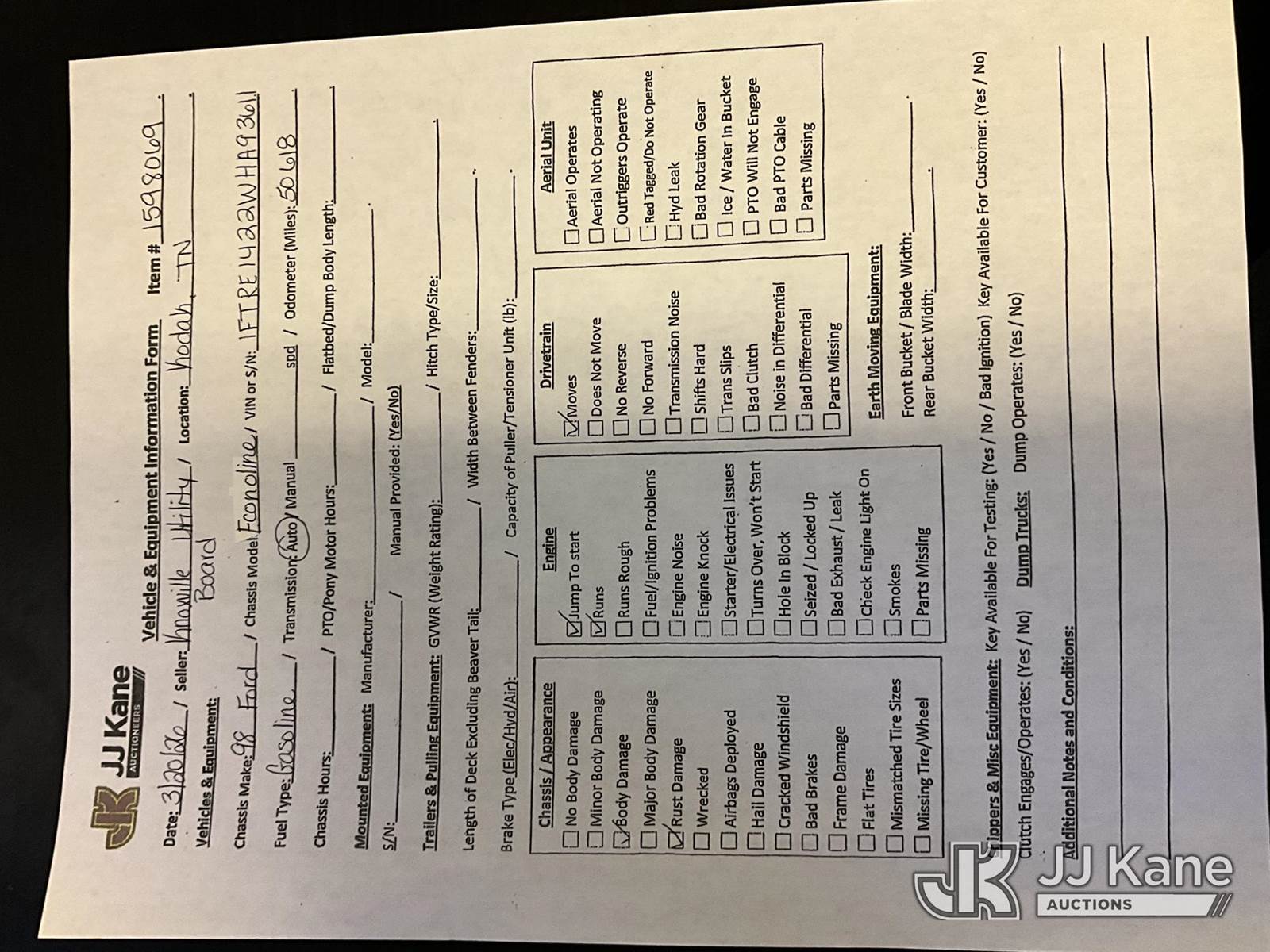 1998 Ford Econoline E150 Cargo Van, 6-cyl gas, RWD, 4-Speed Automatic, A/C, (Exempt from Odometer Disclosure - Reads 50,618 miles) (Runs & Moves) (Jump to Start, Body/Rust Damage) This is a Titled Item NOTE: This unit is being sold AS IS/WHERE IS via Timed Auction and is located in Kodak, TN. Inspection & preview days for this unit are by appointment only; please contact us at contact@jjkane.com or 84-Go-JJKane for more details. (Buyer is responsible for removal. Assistance by consignor or JJ Kane Auctions is not assured.)