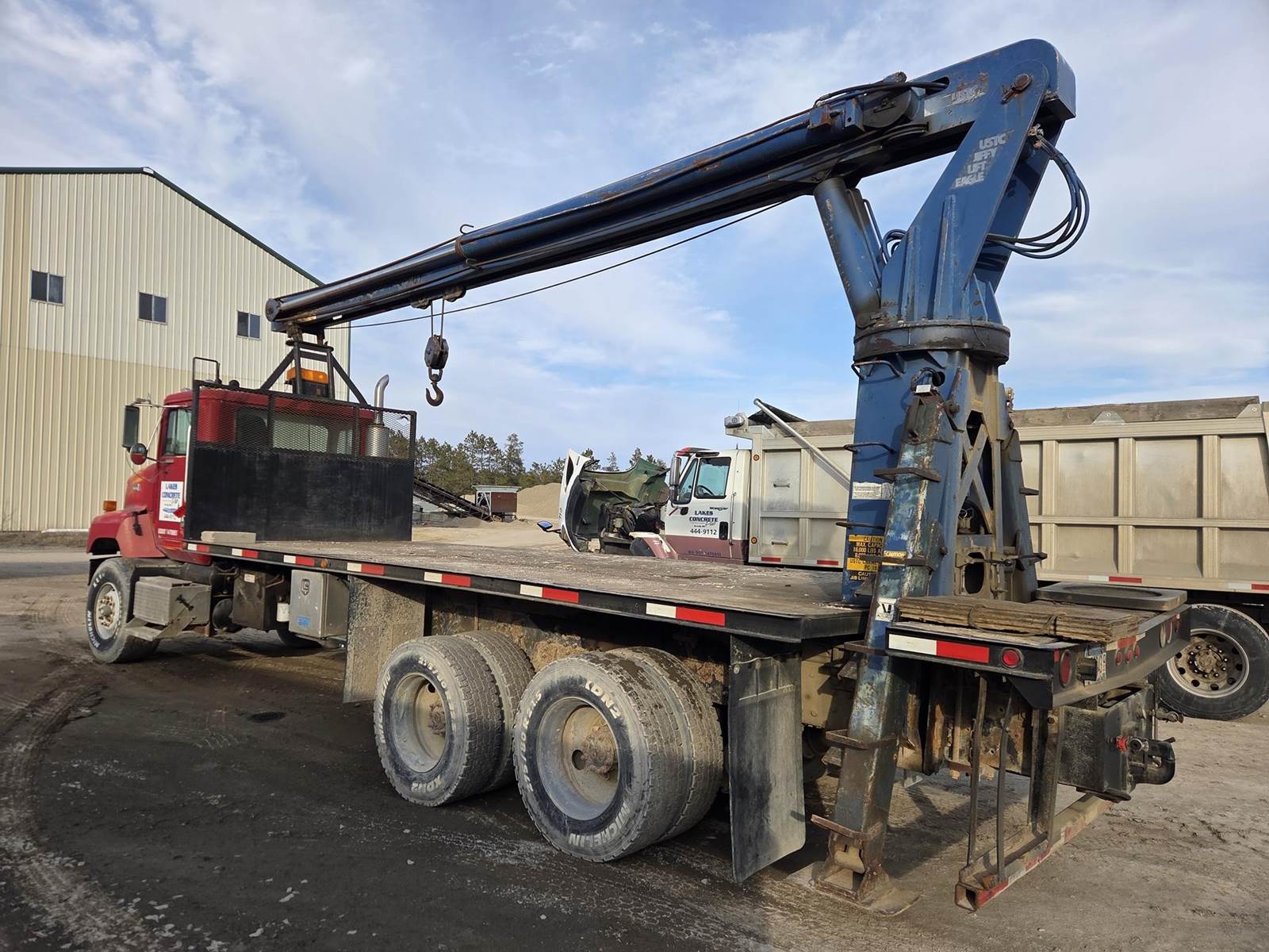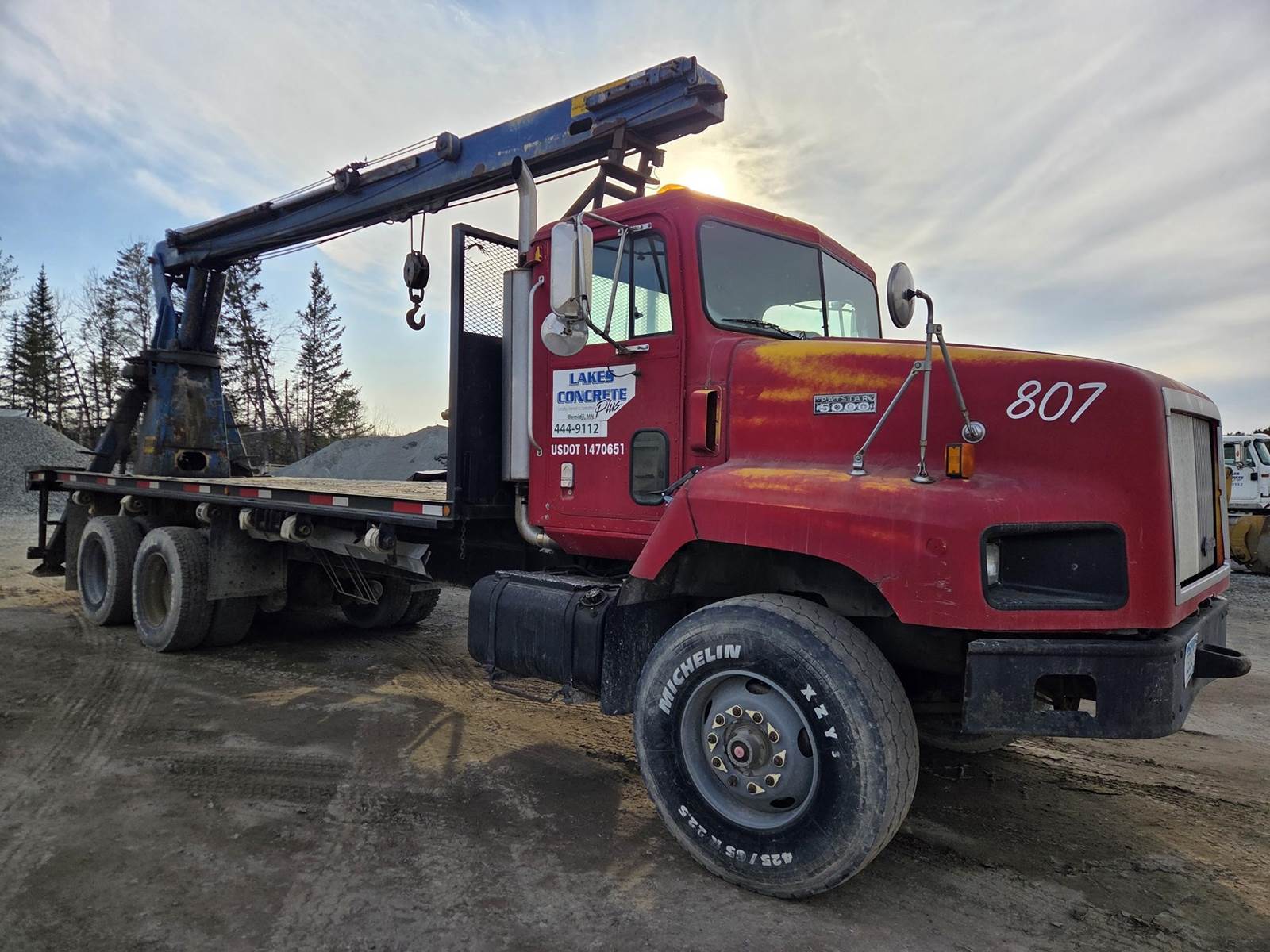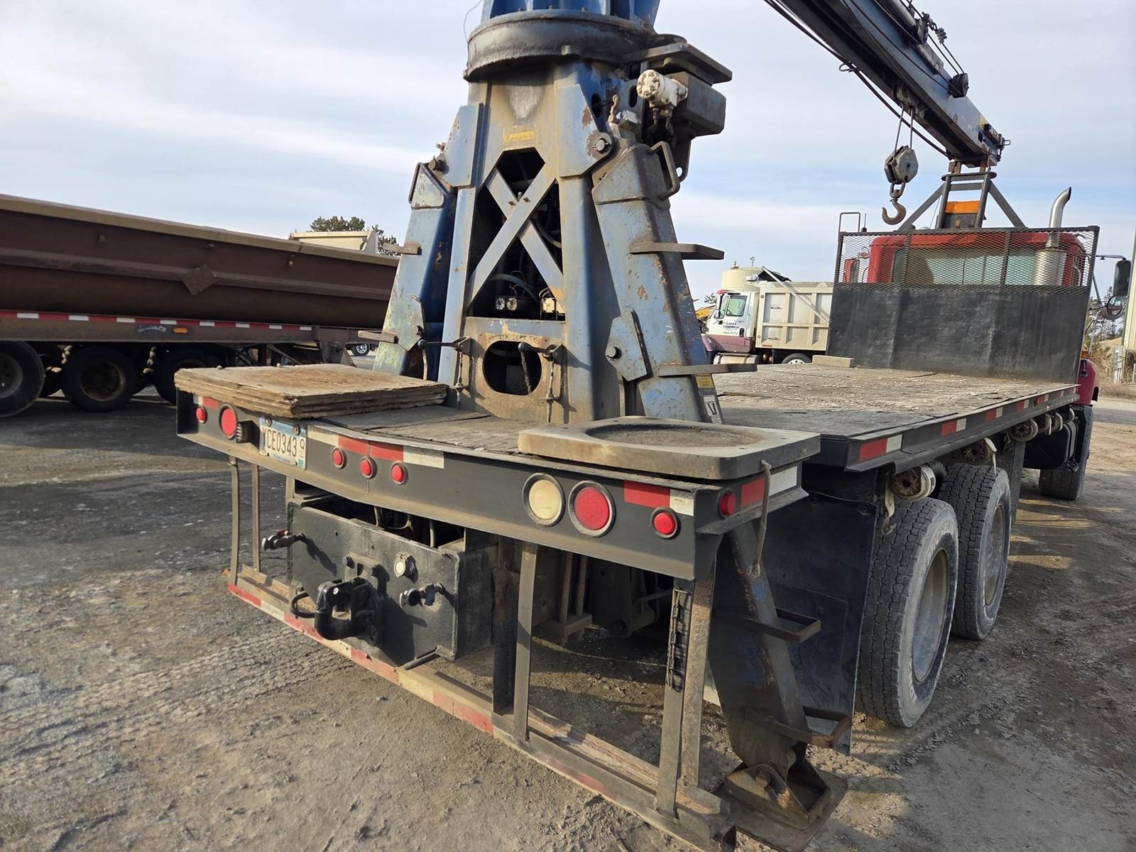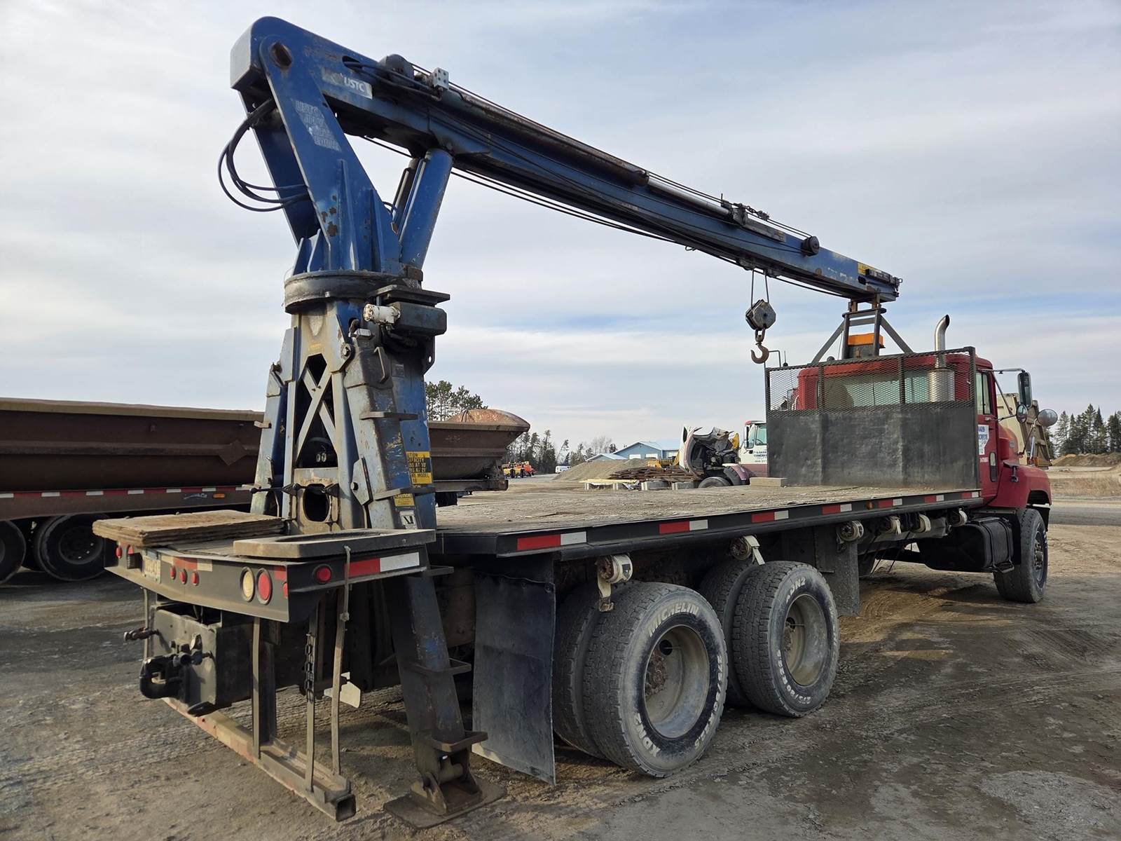 Cummins M11 Celect Plus Turbo Diesel Engine, Eaton Fuller 9 Speed Manual Transmission, 66000PB GVWR, 20000LB Front Axle GAWR, Interaxle Lock, Diff Lock, PTO, Double Frame, Walking Beam Suspension, Approx. 24' Bed, Approx. 96" Width, Outriggers, USTC PC-16E 16000LB Crane, Remote Control, Winch Straps, Heat/AC, Cruise Control, Heated Mirrors, 425/65R22.5 Front Tires, 275/80R22.5 Rear Tires