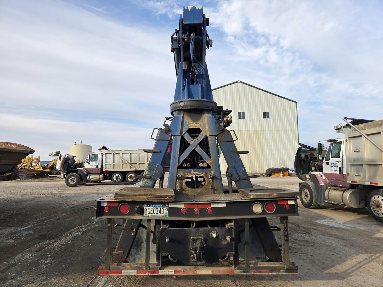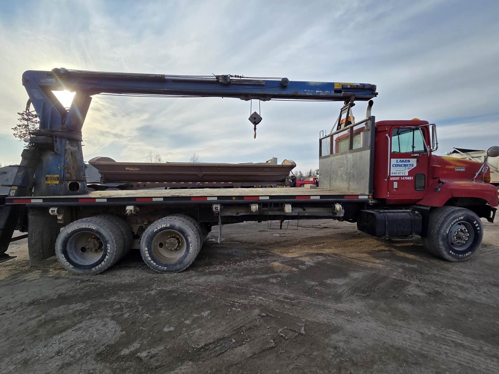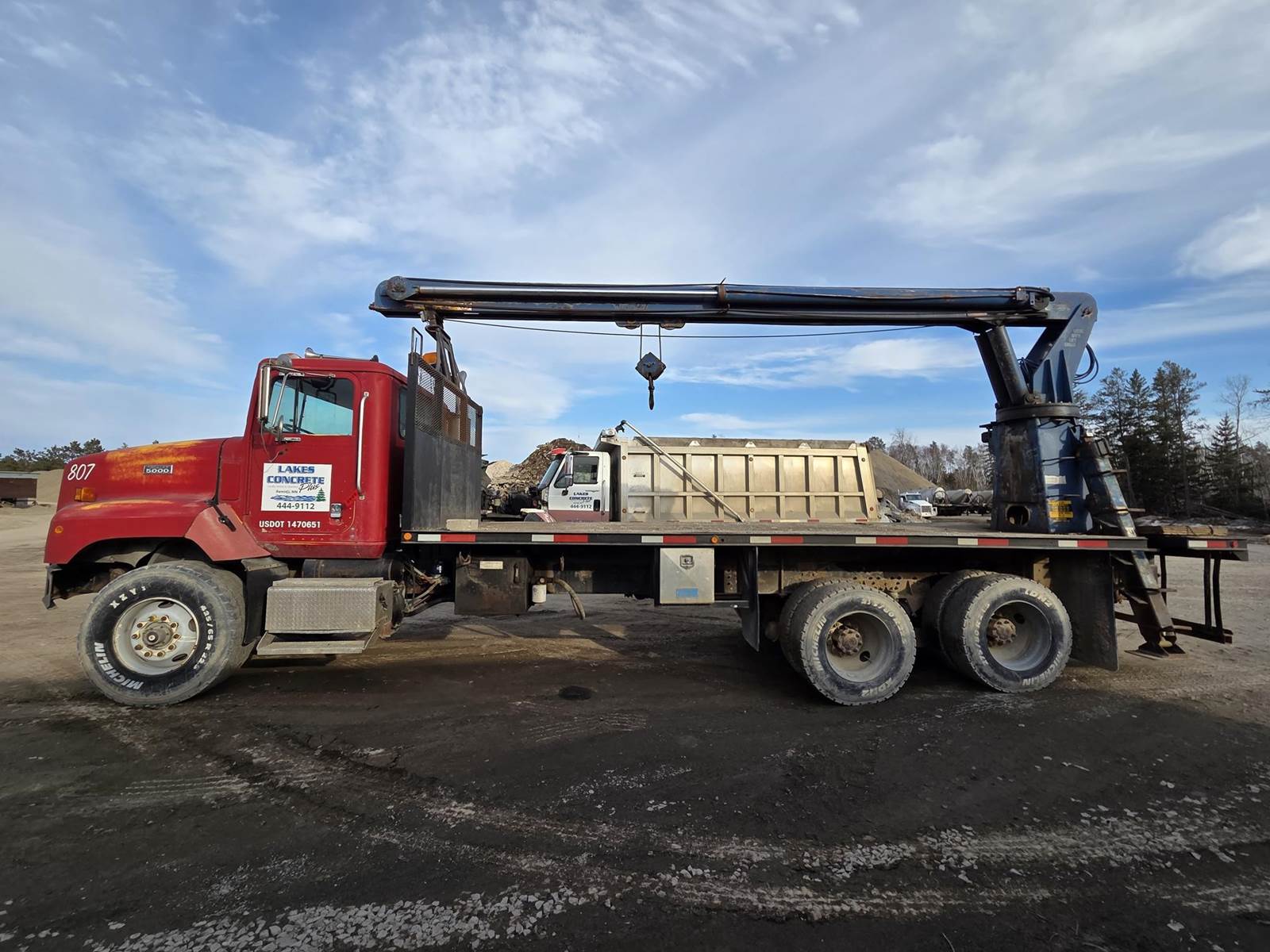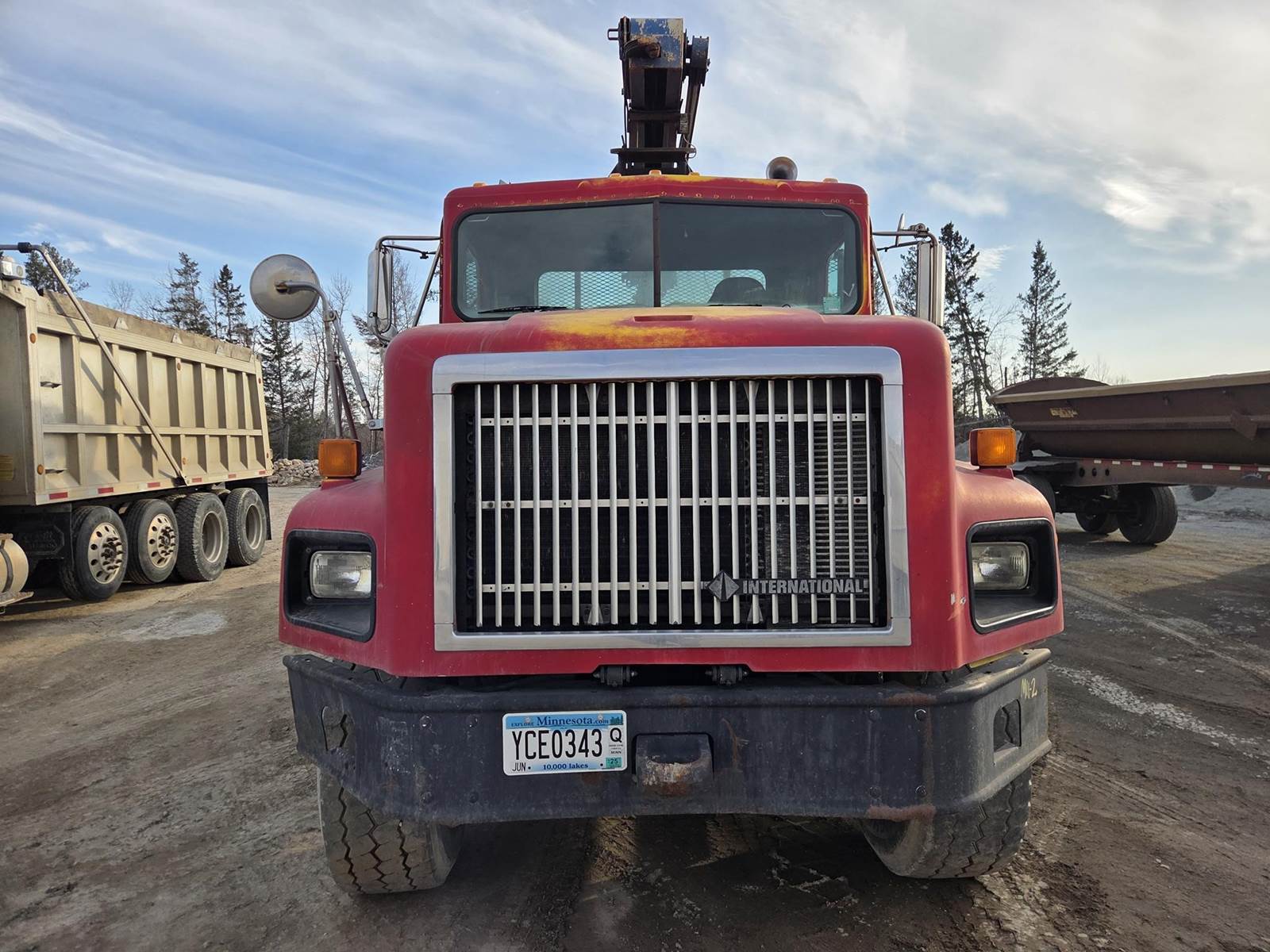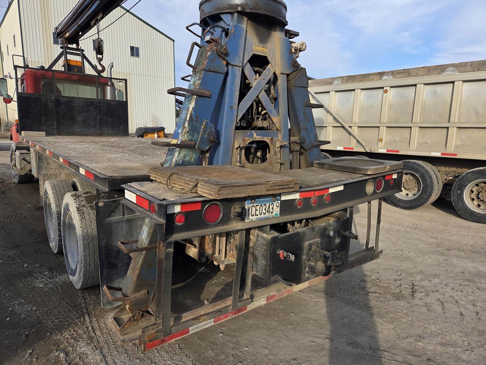 Cummins M11 Celect Plus Turbo Diesel Engine, Eaton Fuller 9 Speed Manual Transmission, 66000PB GVWR, 20000LB Front Axle GAWR, Interaxle Lock, Diff Lock, PTO, Double Frame, Walking Beam Suspension, Approx. 24' Bed, Approx. 96" Width, Outriggers, USTC PC-16E 16000LB Crane, Remote Control, Winch Straps, Heat/AC, Cruise Control, Heated Mirrors, 425/65R22.5 Front Tires, 275/80R22.5 Rear Tires