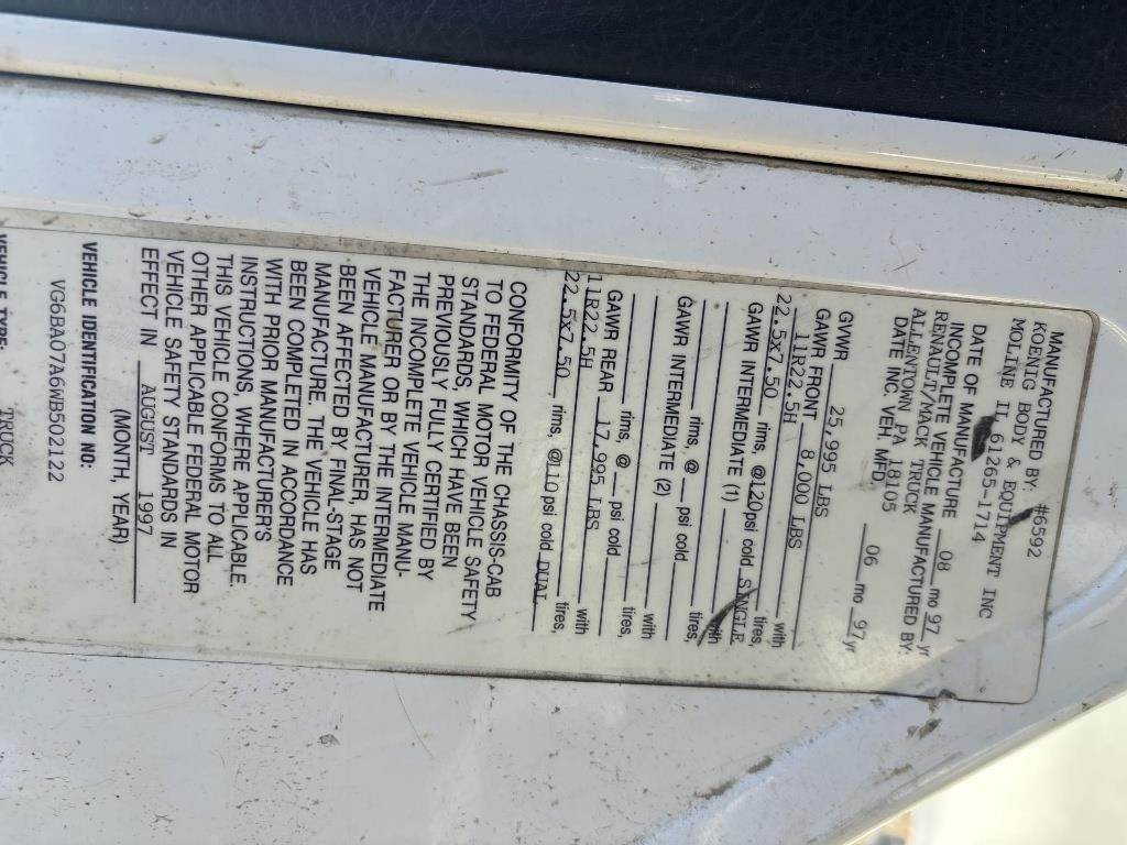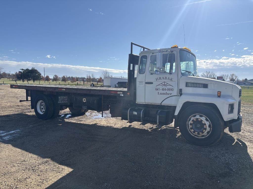 Location: Toledo IA Mack Diesel Powered Motor, 6 Speed manual Transmission, Heat/AC, Spring Suspension, Air Brakes, Approx 22' Flat Bed x 96" Wide, Approx 18''x48" Side Box ,Overall Dimensions 30' x 102" Tall, Steel Rims, 11R 22.5 Front Tires, 11R 22.5 Rear Tires VIN: VG6BA07A6WB502122 Miles Shown: 104395