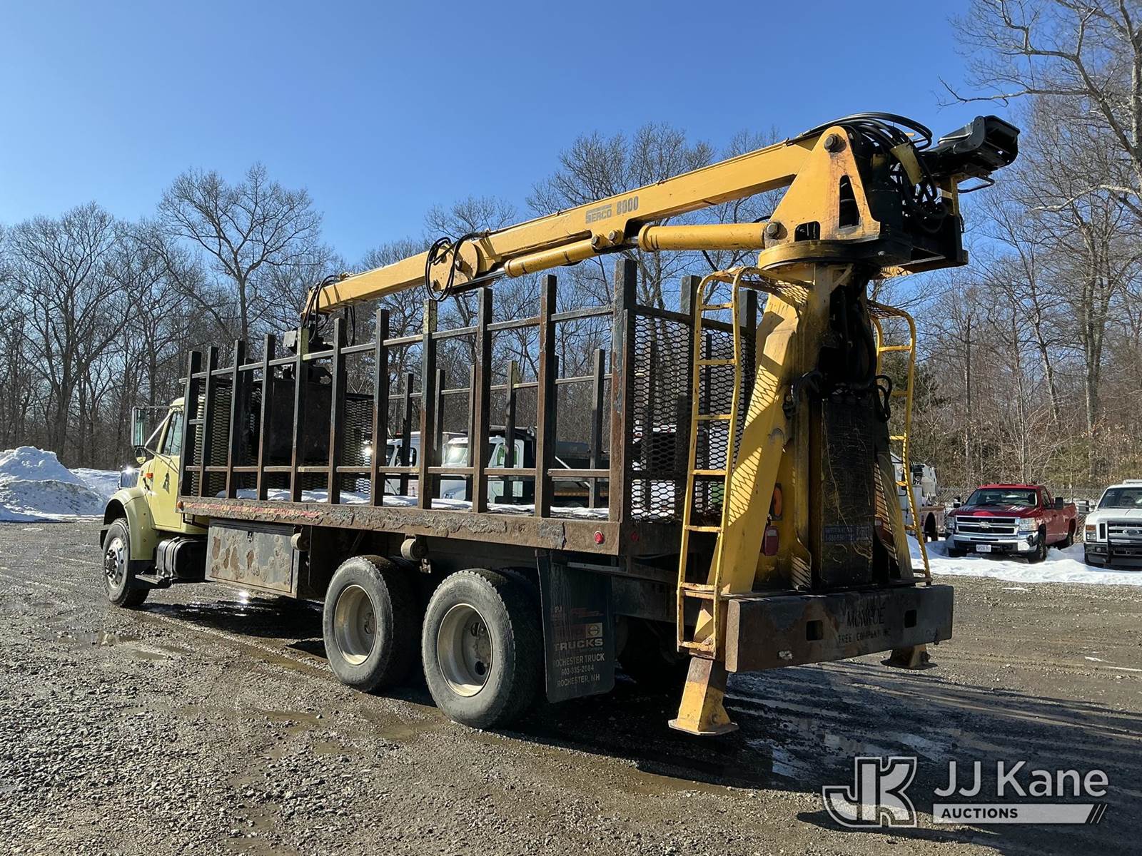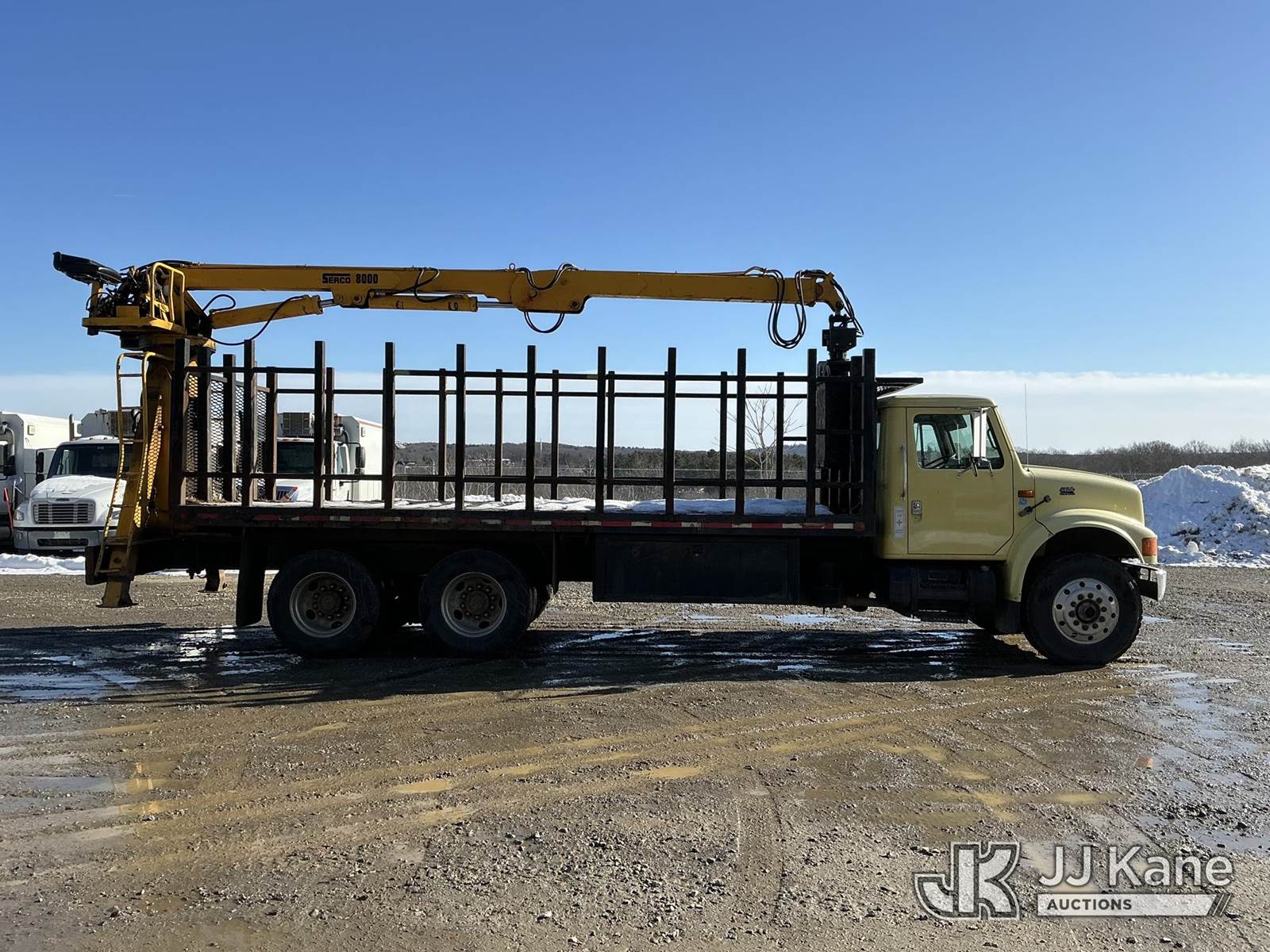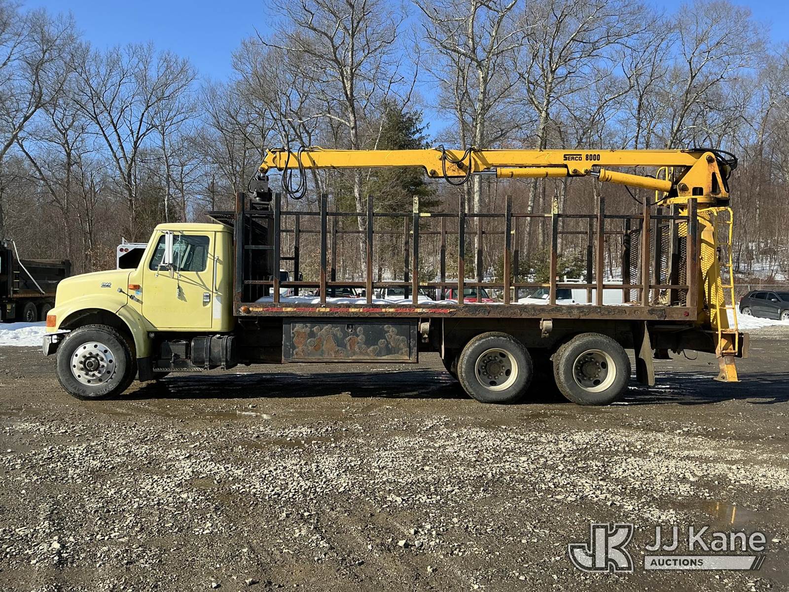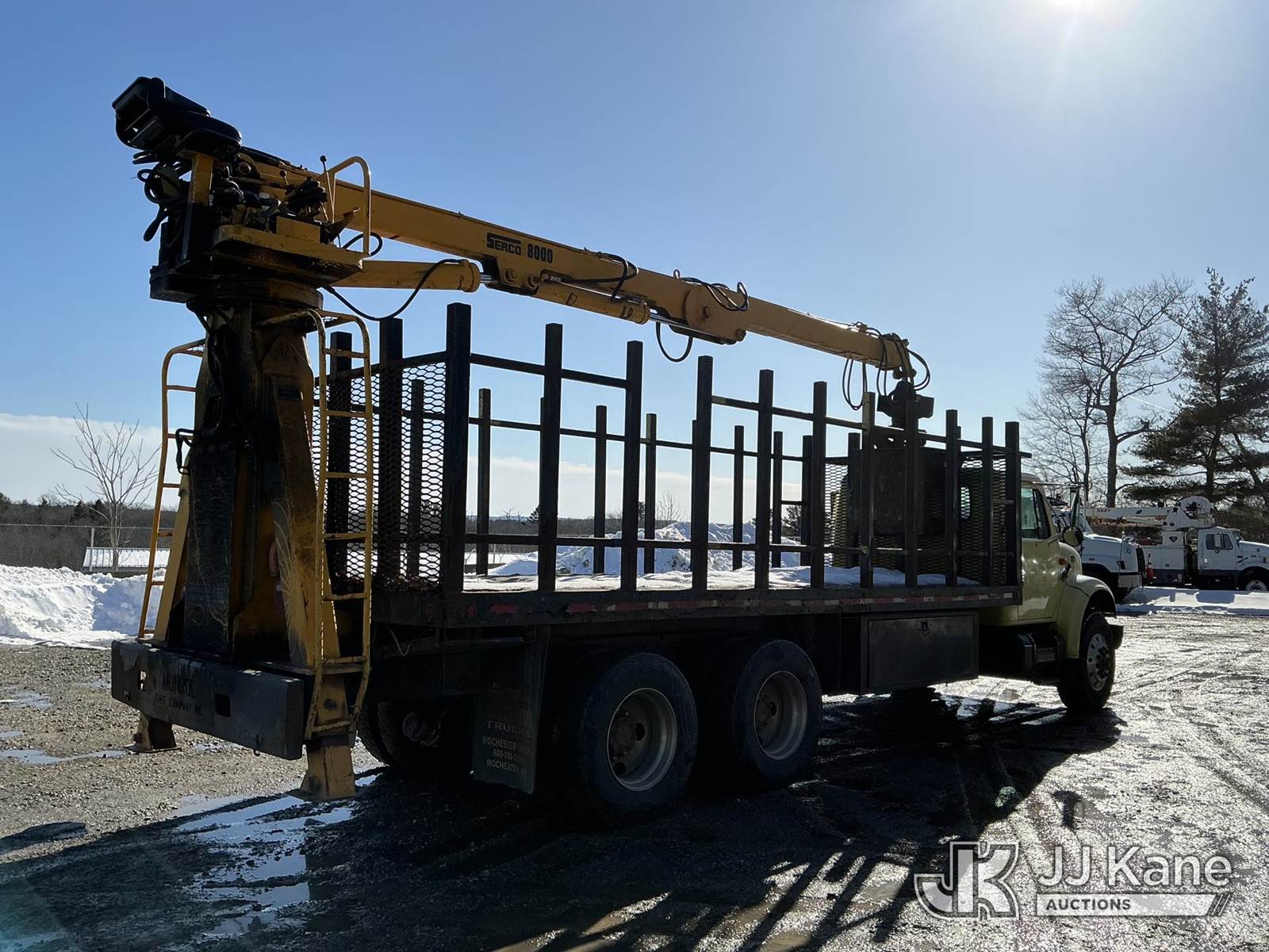 Serco 8000, 8,000 Lb Grappleboom/Log Loader Crane s/n L3814, with 27 ft reach & 2 hyd outriggers & riding console, rear mounted on 1998 International 4900 T/A Flatbed/Log Truck, DT530 6X4, diesel, Auto, (Exempt from Odometer Disclosure - Reads 120,040 miles) (Runs & Moves) (Road Side Outrigger Control Seized, Upper Condition Unknown, Road Side Door Handle Inoperable, Seller States: Loader Valve Bank & Rotary Manifold Are Leaking & Need Replacement) (Reads 8,253 hours) This is a Titled Item NOTE: This unit is being sold AS IS/WHERE IS via Timed Auction and is located in Shrewsbury, MA. Inspection & preview days for this unit are the 2 business days prior to the first day of items closing for this auction, item is located at 11 Fortune Blvd Shrewsbury, MA 01545 and hours of operations are 8a-4p. For pre-sale questions, please contact Rob Gifford @ (508) 864-4126. (Missing manuals, See Auction Company for Manufacturers Information to obtain manuals) (Buyer is responsible for removal. Assistance by consignor or JJ Kane Auctions is not assured.)