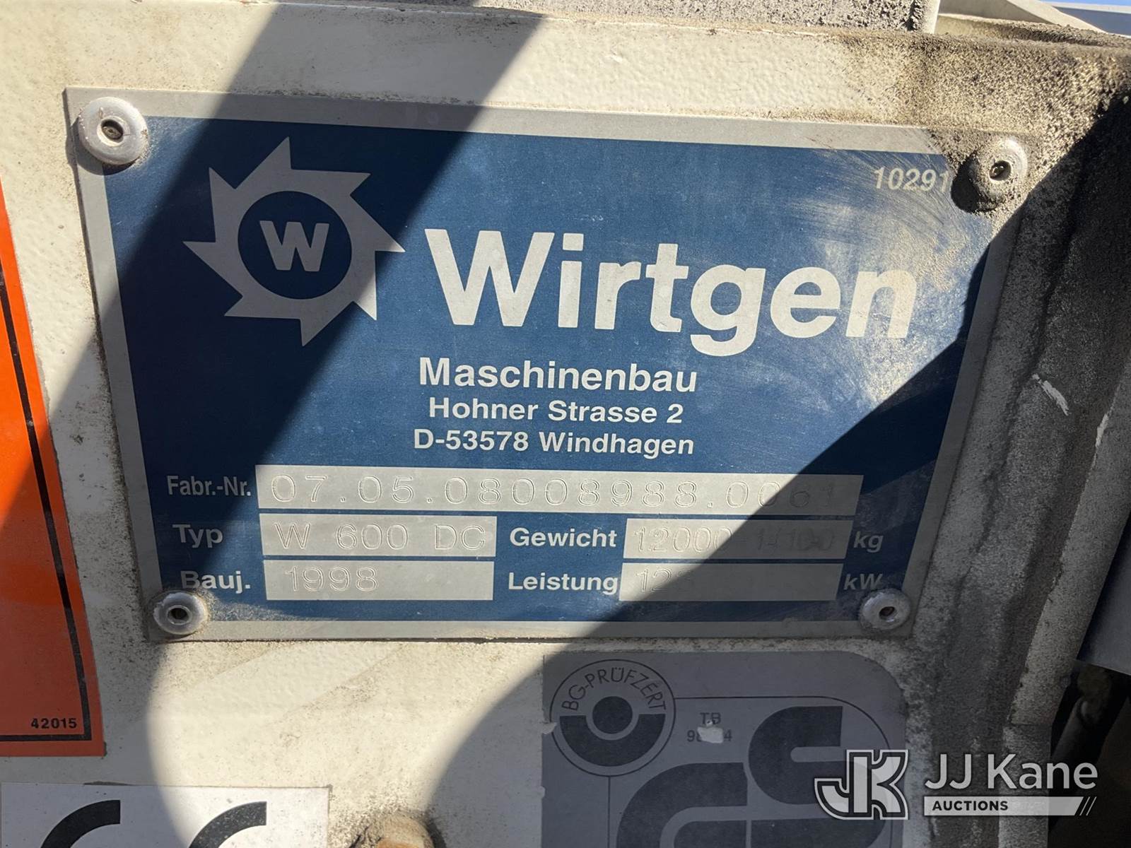 1998 Wirtgen W600DC Asphalt Milling Machine, s/n 07.05.08008988.00, Deutz diesel, with grinder & conveyor, (Runs & Operates) (Reads 1,461 hours) May be subject to ARB Regulations NOTE: This unit is being sold AS IS/WHERE IS via Timed Auction and is located in Jurupa Valley, CA. Inspection & preview days for this unit are the 2 business days prior to the first day of items closing for this auction, item is located at 4510 Muth Way Jurupa Valley, CA 92509 and hours of operations are 8a-4p. For pre-sale questions, please contact please contact Office Staff @ (310) 353-7140. Dealer License Number 45696. (Buyer is responsible for removal. Assistance by consignor or JJ Kane Auctions is not assured.)