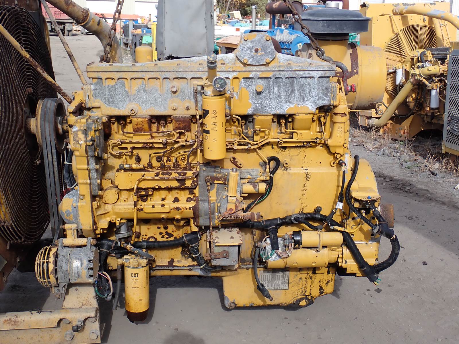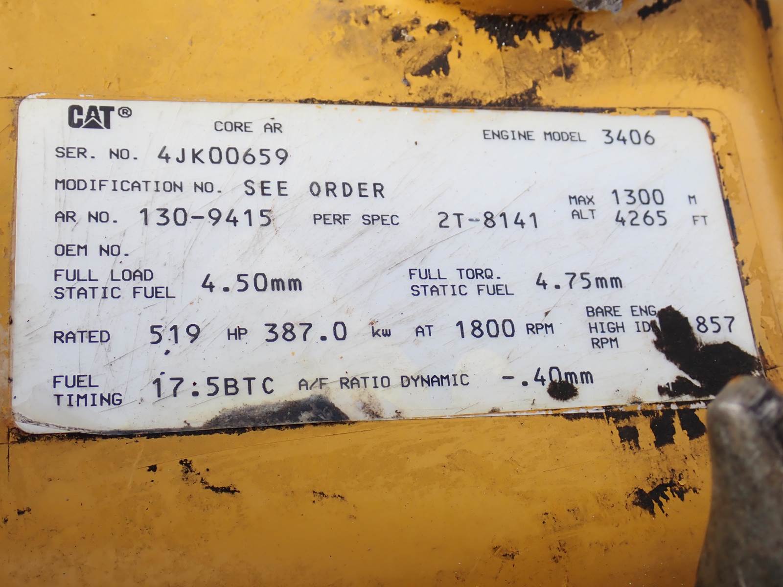 1999 Caterpillar 3406B (3406C) diesel engine, turbocharged, water jacket aftercooled, arrangement # 130-9415, 519 HP at 1800 RPM rating, fully mechanical fuel system, 7200 hours showing when removed from a CAT generator unit. EXCELLENT RUNNING, HIGH HORSEPOWER UNIT. USES 2 PIECE PISTON, ENGINE IS A 3406C ENGINE BY BUILD BUT TAGGED A "B" SERIES BY CAT -- WILL REPLACE EITHER SERIES FOR YOUR APPLICATION. PLEASE CONTACT US FOR HELP W/ INTERCHANGE -- VERY VERY HARD TO FIND UNIT HERE !!