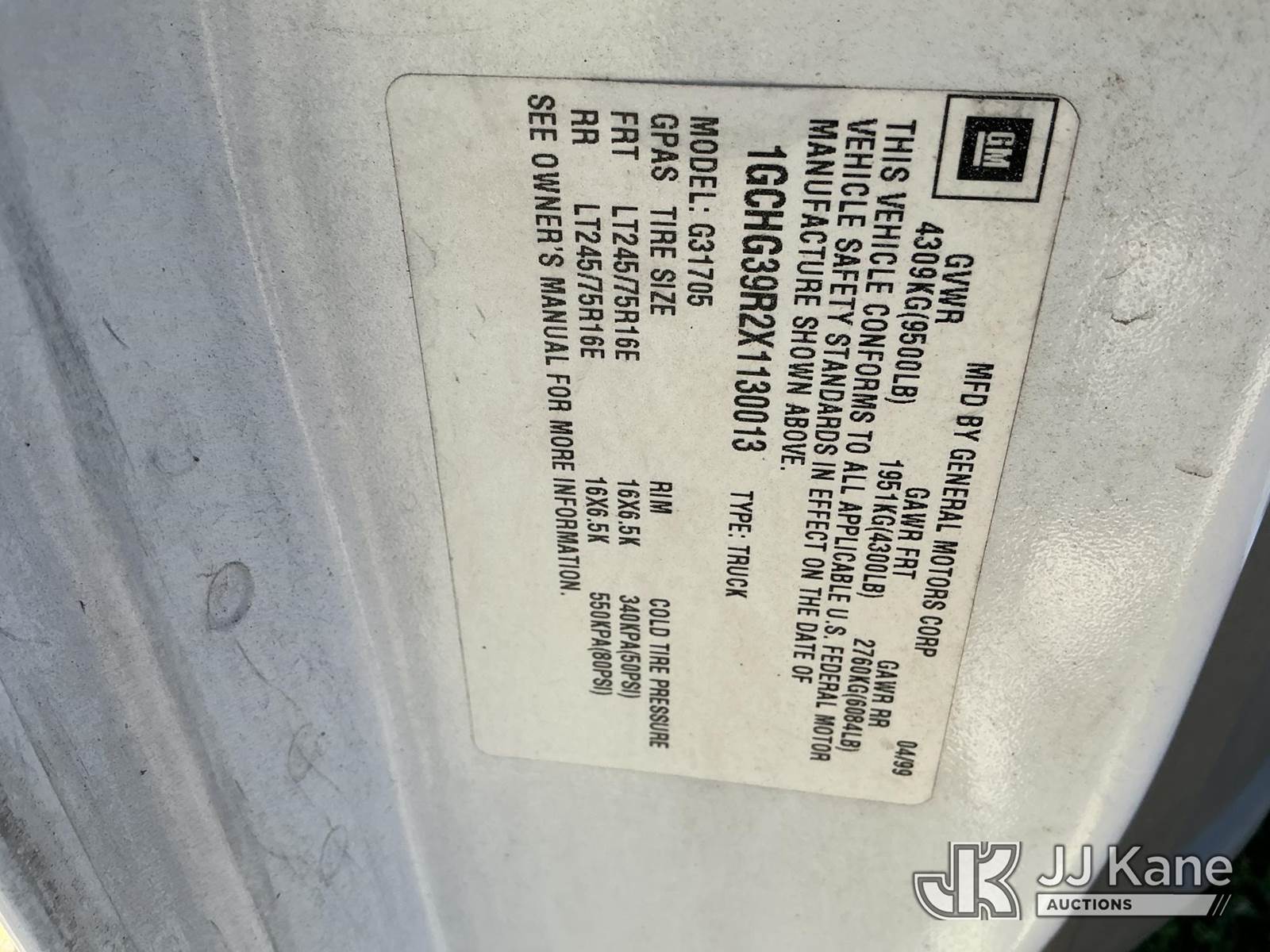 1999 Chevrolet Express G3500 Extended Cargo Van, 8-cyl, 4-Speed Automatic, GAS, A/C, with ladder rack, (Exempt from Odometer Disclosure - Reads 129,232 miles) Hillsborough County School Board Unit (Runs & Moves) ( Paint Damage, Body Damage) (FL Residents Purchasing Titled Items - tax, title & registration fees will be collected at the maximum rate of $400.00 under 25,999 and $800.00 for Over 26,000 and $250.00 trailers - Proof of insurance is mandatory; Out of State Residents Purchasing Title Items - tax will be collected based upon your state rate.) This is a Titled Item NOTE: This unit is being sold AS IS/WHERE IS via Timed Auction and is located in Thonotosassa, FL. Inspection & preview days for this unit are the 2 business days prior to the first day of items closing for this auction, item is located at 11720 N US 301 Thonotosassa, Fl 33592 and hours of operations are 8a-4p. For pre-sale questions, please contact Office Staff @ (813) 986-2485. (Buyer is responsible for removal. Assistance by consignor or JJ Kane Auctioneers is not assured.)