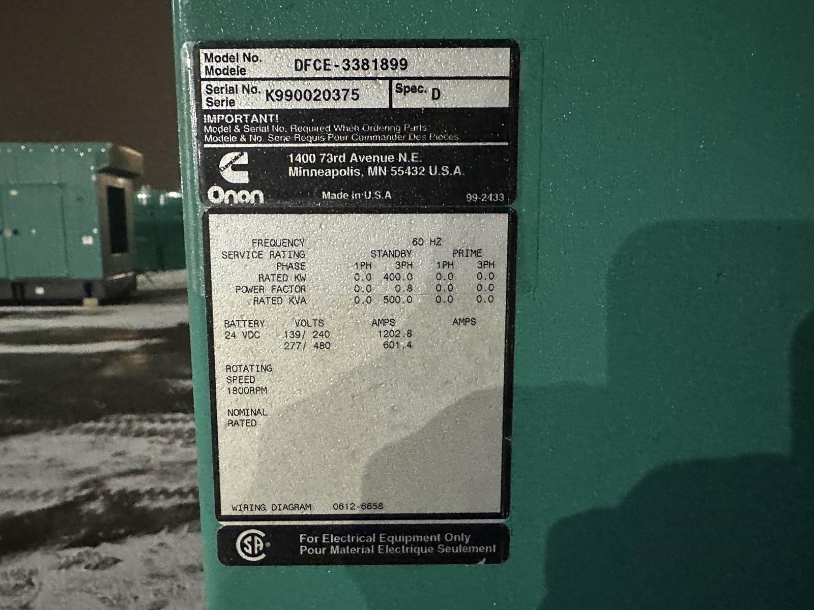 Cummins 400 kW standby diesel generator set model DFCE, SN-K990020375. Cummins NTA855-G5 engine rated 605 HP at 1800 RPM, SN-30363560. 3/60/277480V, 12 lead reconnectable to other voltages. 800 Amp main-line circuit breaker. PMG - permanent magnet generator. On order new DeepSea digital control panel. Coolant heater. No batteries. Open power unit with engine driven radiator. 701 Hrs. Year 1999. Overall dimensions 51W x 143L x 76H on 6H blocks, 7480 lbs. FOB Waukesha, WI
