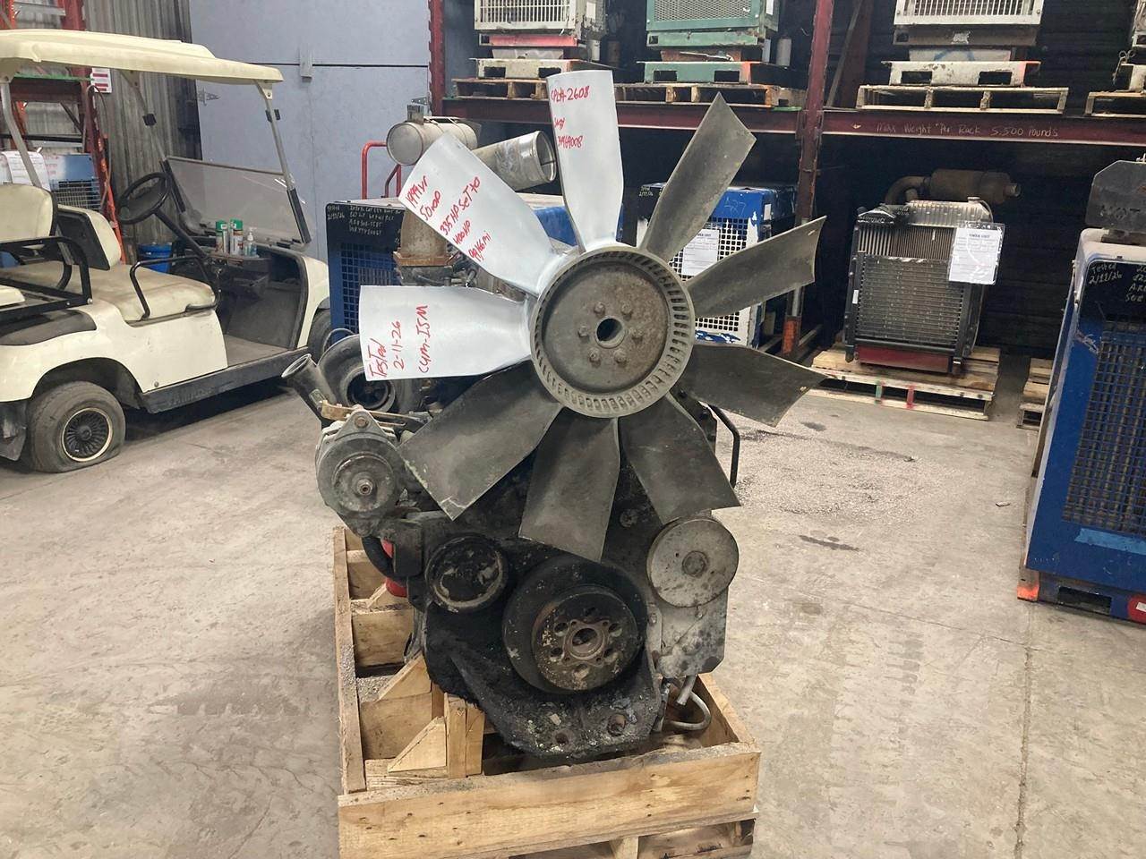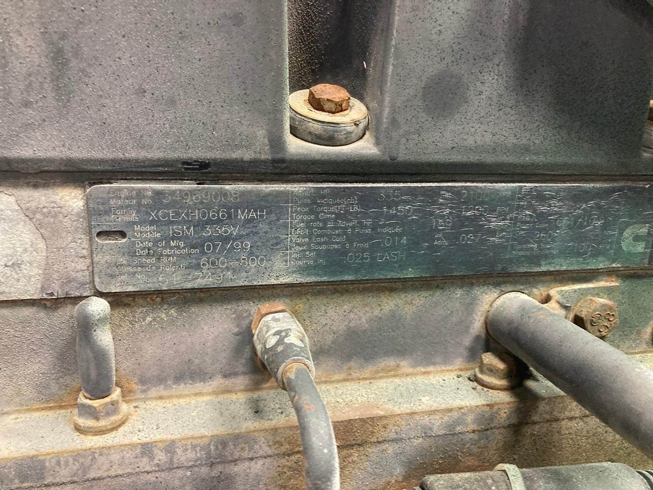 GOOD USED, 1999 LOW MILEAGE CUMMINS ISM 335 HP DIESEL TAKEOUT ENGINE FOR SALE at ADELMAN’S TRUCK PARTS in CANTON, OHIO. 99,166 MILES SHOWING ON ECM, COMPLETE & RUN TESTED, 335 HP @ 2100 RPM (ECM SET @ 400HP), MODEL ISM335V, 2608 CPL#, CM570, XCEXH0661MAH FAMILY #, with TC, CAC, & ECM EMISSIONS CONTROL SYSTEMS, and 50+ LBS OIL PRESSURE.