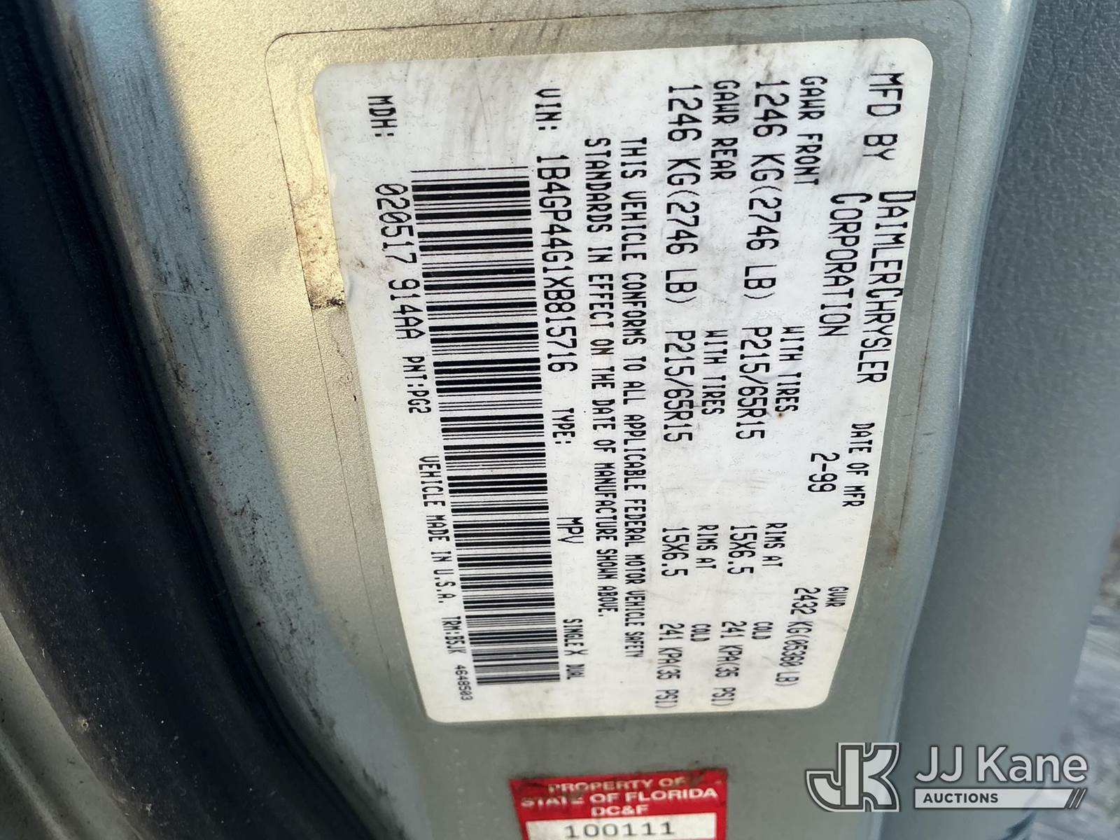 1999 Dodge Grand Caravan Mini Passenger Van, 6-cyl gas, Auto, A/C, (Exempt from Odometer Disclosure - Reads 165,707 miles) State of FL Unit (Runs & Moves) (Jump To Start, Smokes, Runs Rough, Noisy Engine, Paint Damage) This is a Titled Item NOTE: This unit is being sold AS IS/WHERE IS via Timed Auction and is located in Thonotosassa, FL. Inspection & preview days for this unit are the 2 business days prior to the first day of items closing for this auction, item is located at 11720 N US 301 Thonotosassa, Fl 33592 and hours of operations are 8a-4p. For pre-sale questions, please contact Office Staff @ (813) 986-2485. (Buyer is responsible for removal. Assistance by consignor or JJ Kane Auctioneers is not assured.)