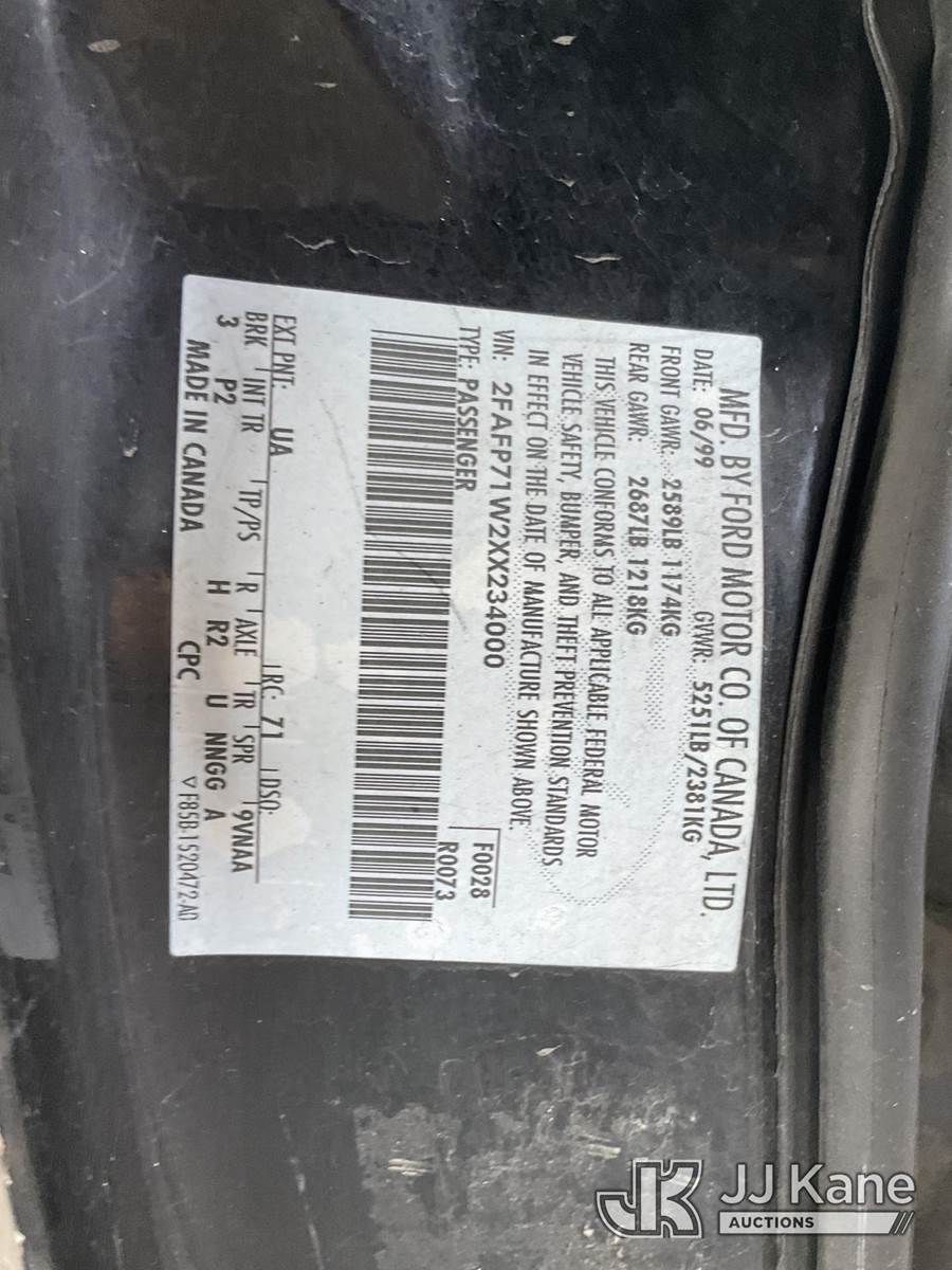 1999 Ford Crown Victoria Police Interceptor Police Interceptor 4-Door Sedan, s/n 2FAFP71W2XX234000, 8-cyl gas, RWD, Auto, A/C, (Exempt from Odometer Disclosure - Reads 71,260 miles) (Runs & Moves) This is a Titled Item NOTE: This unit is being sold AS IS/WHERE IS via Timed Auction and is located in Jurupa Valley, CA. Inspection & preview days for this unit are the 2 business days prior to the first day of items closing for this auction, item is located at 4510 Muth Way Jurupa Valley, CA 92509 and hours of operations are 8a-4p. For pre-sale questions, please contact please contact Office Staff @ (310) 353-7140. Dealer License Number 45696. (Buyer is responsible for removal. Assistance by consignor or JJ Kane Auctions is not assured.)