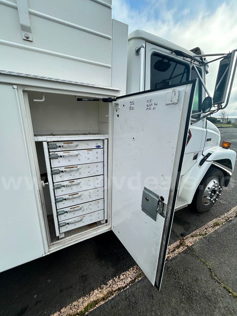 Service Body With rust inhibiting coating/Bedliner for Box interior, Double locking Exterior Cabinets. Alarm System, Kenwood Stereo, Single Bank On-board Battery Charger, Aux. 4000W inverter with Secondary Battery 110V to service Box, Holset on board Compressor, Aux. Oasis XD4000-12 DC Compressor & 50' 3/8" Hose Reel, Oxy/ACET Torches W/ Radnor Regulator & Hoses, Tool Shelves & Equipment Drawers Both Sides of Box.