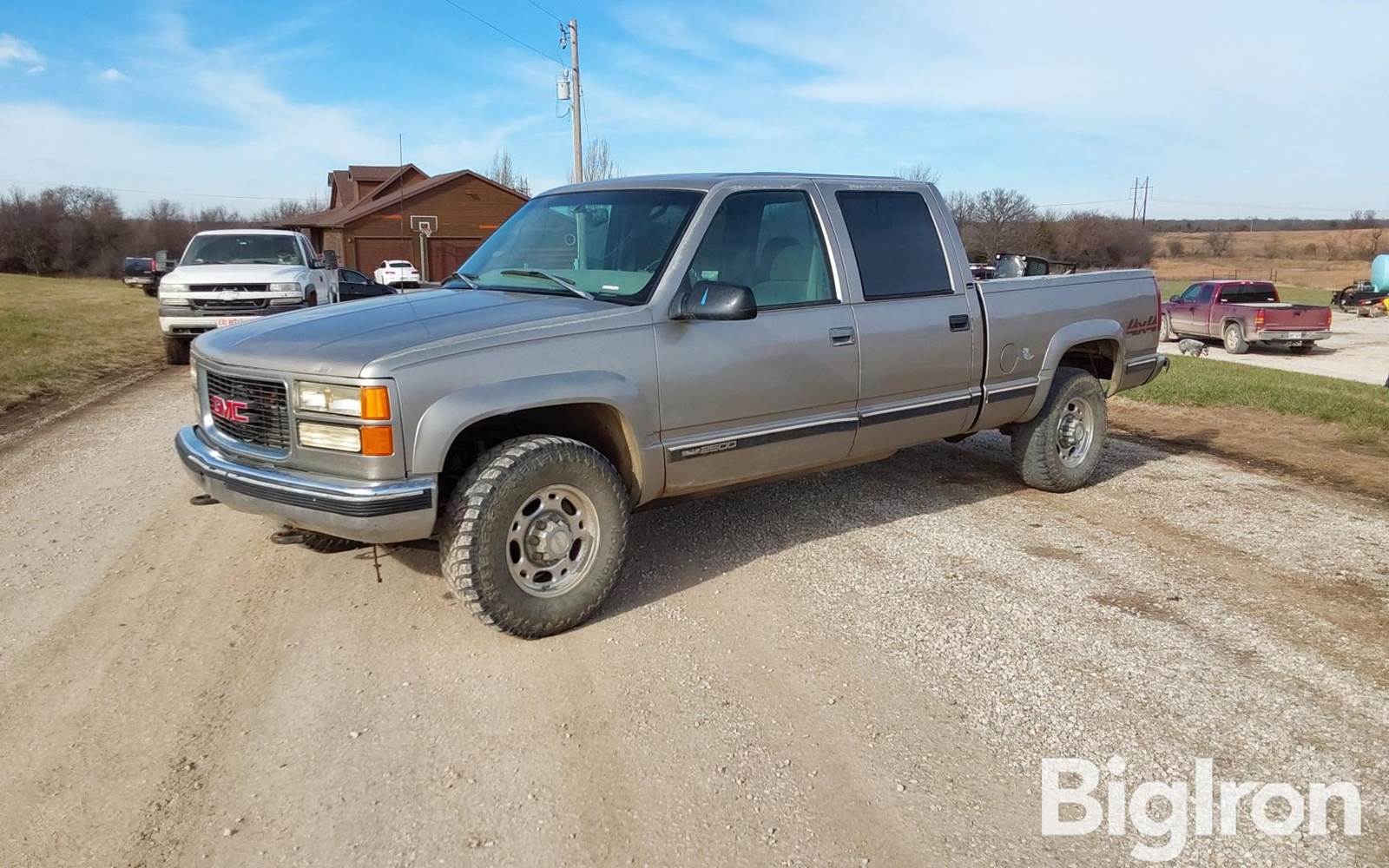 1999 GMC 2500 SLE 4x4 Crew Cab Pickup, 249,556 miles showing, Title Will Be Marked Miles Exempt, GM 7.4L V8 gas engine, automatic transmission, power windows-locks-mirrors, 60/40 front sat, rear bench seat, front tow hooks, gooseneck ball hitch, rear receiver hitch, 265/75R16 tires, NOTE: tailgate missing, VIN: 1GTGK23J6XF005154
