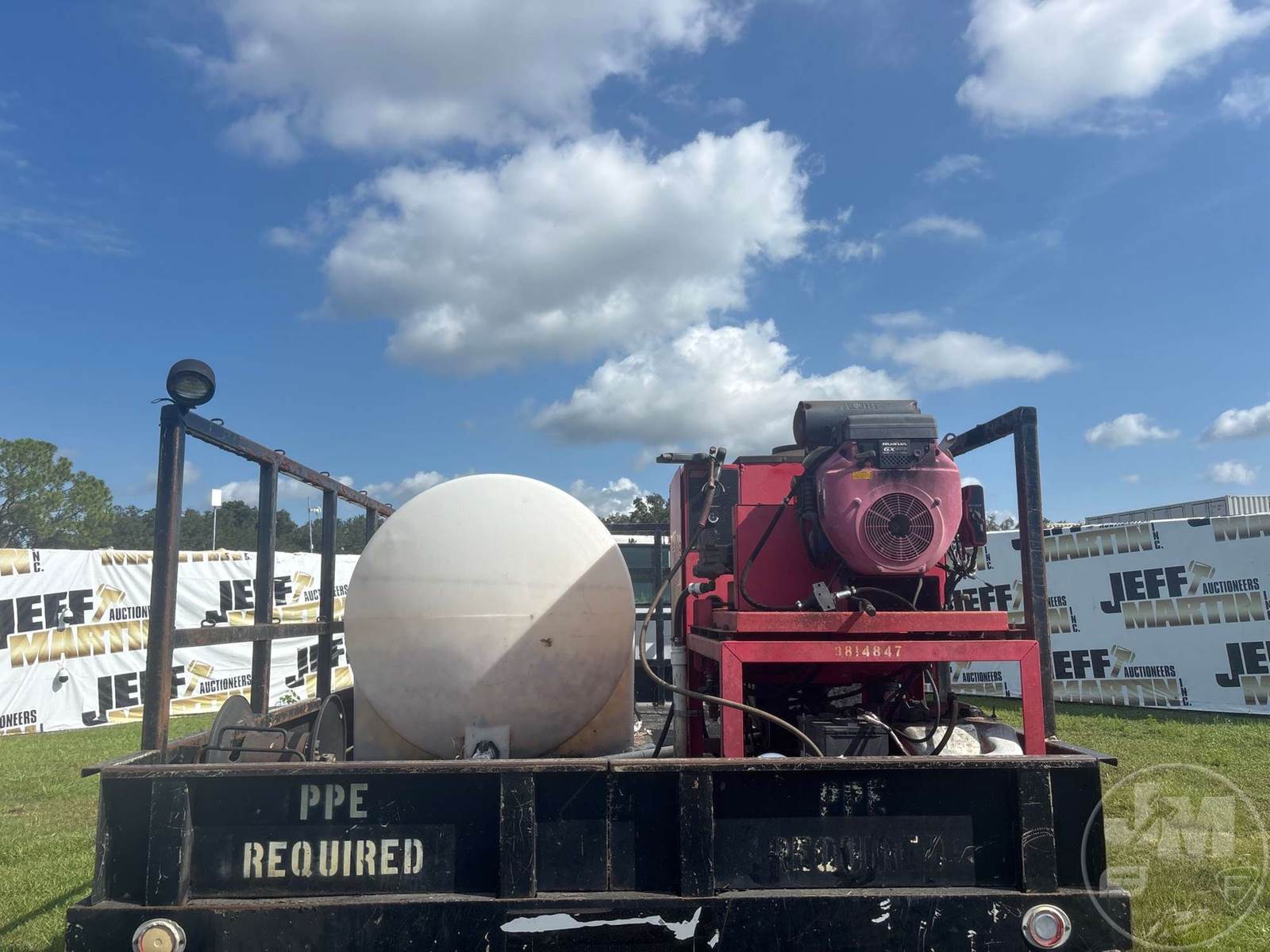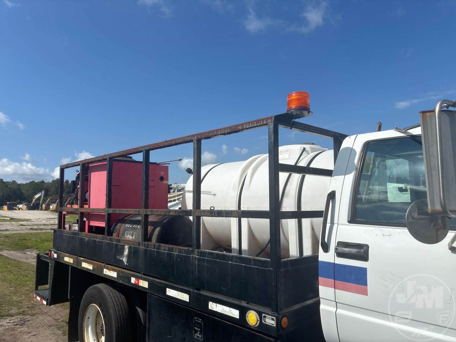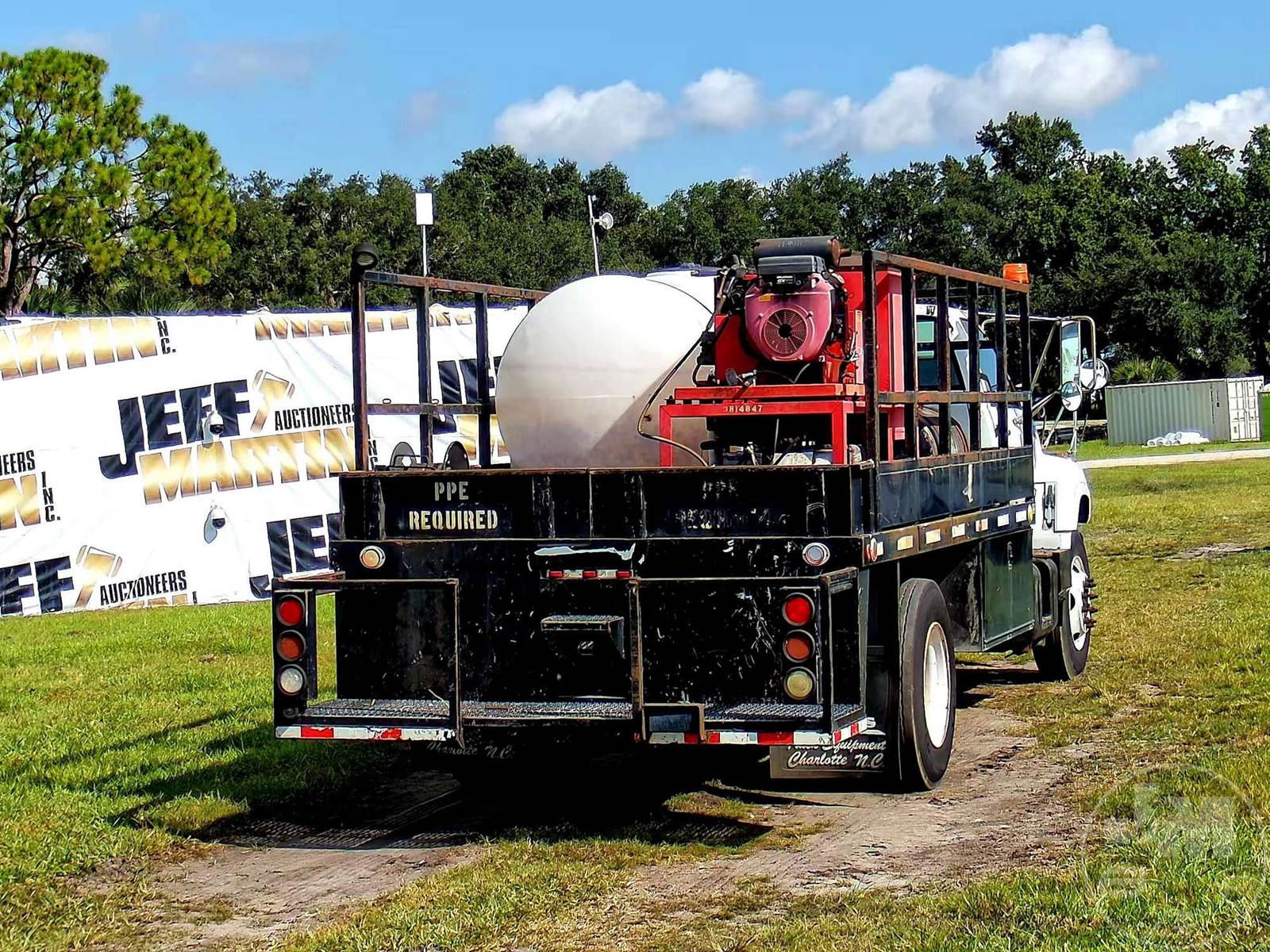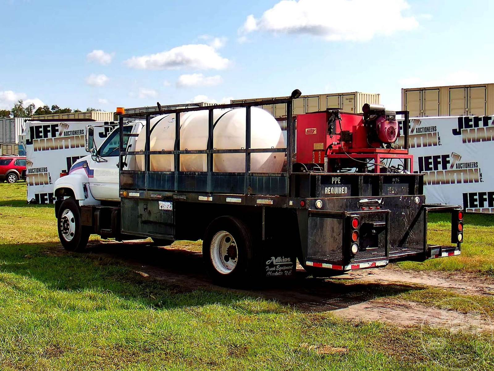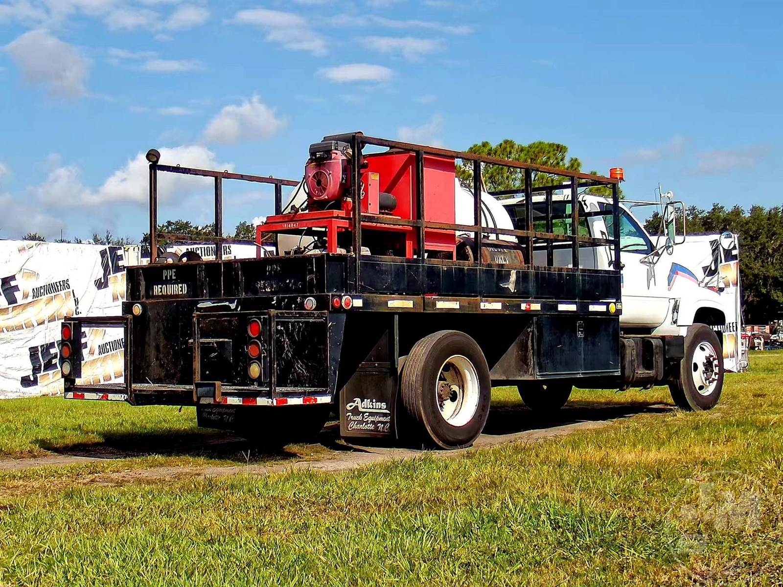 S/A HOT WATER PRESSURE WASHER TRUCK, CAT, C7, HP: 360, 6 SPEED, SPRING SUSP, WB 185", FRONTS 8100 LBS, REARS 17850 LBS, C/A: 110", SINGLE FRAME, WHEELS DISC WHEELS, 800 GAL POLY TANK, HONDA ENG, 16' ADKINS FLATBED BODYĆ , TIRES 10R22.5, ODOMETER READS: 91402