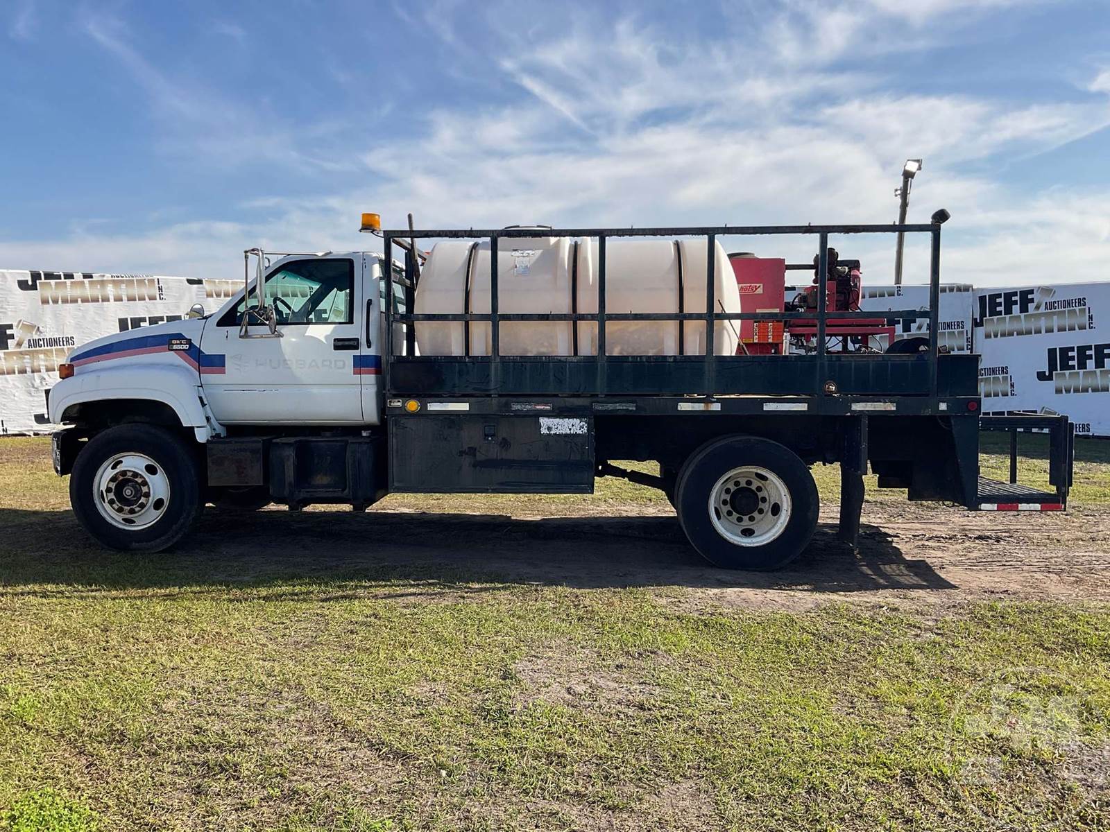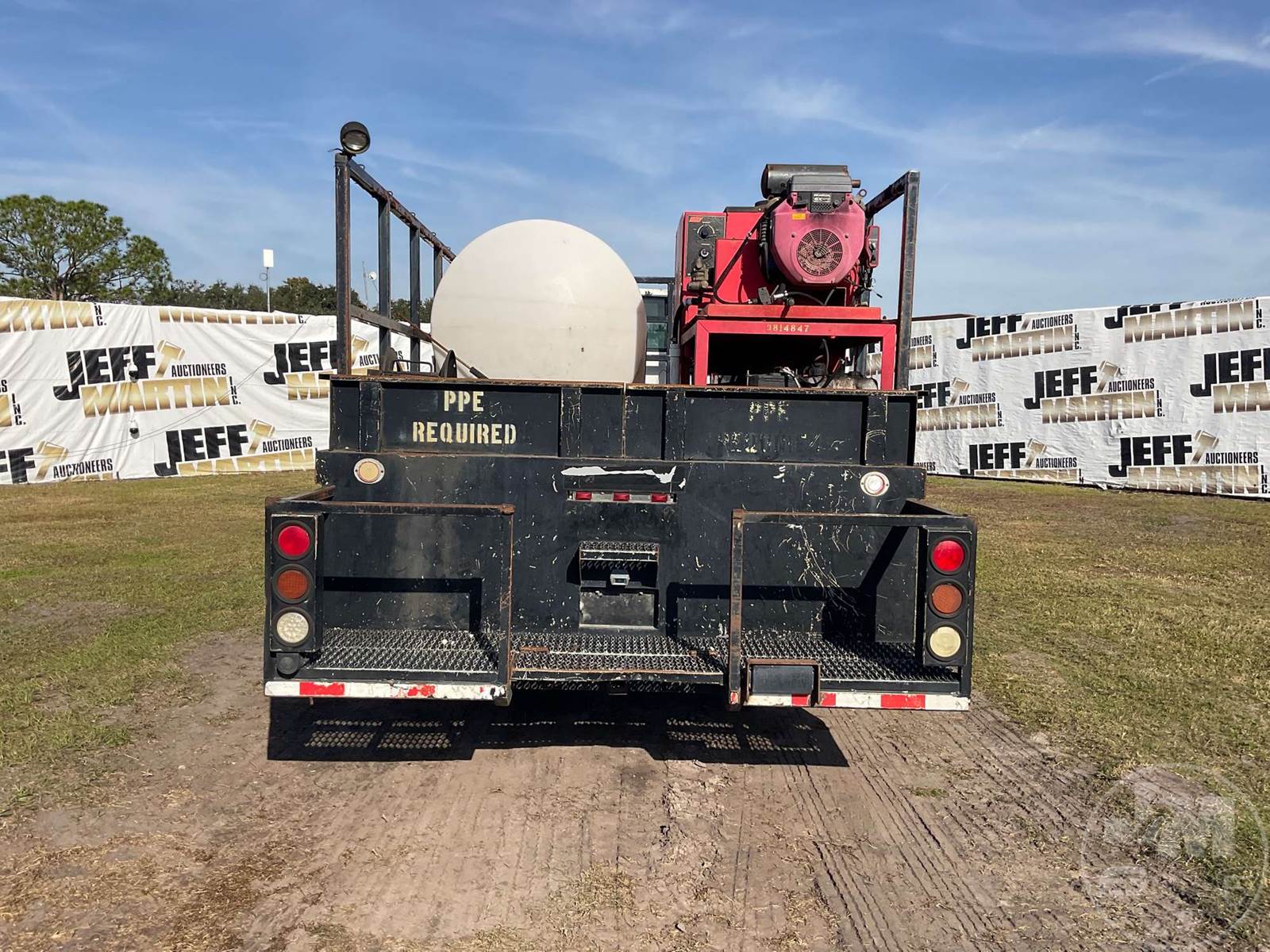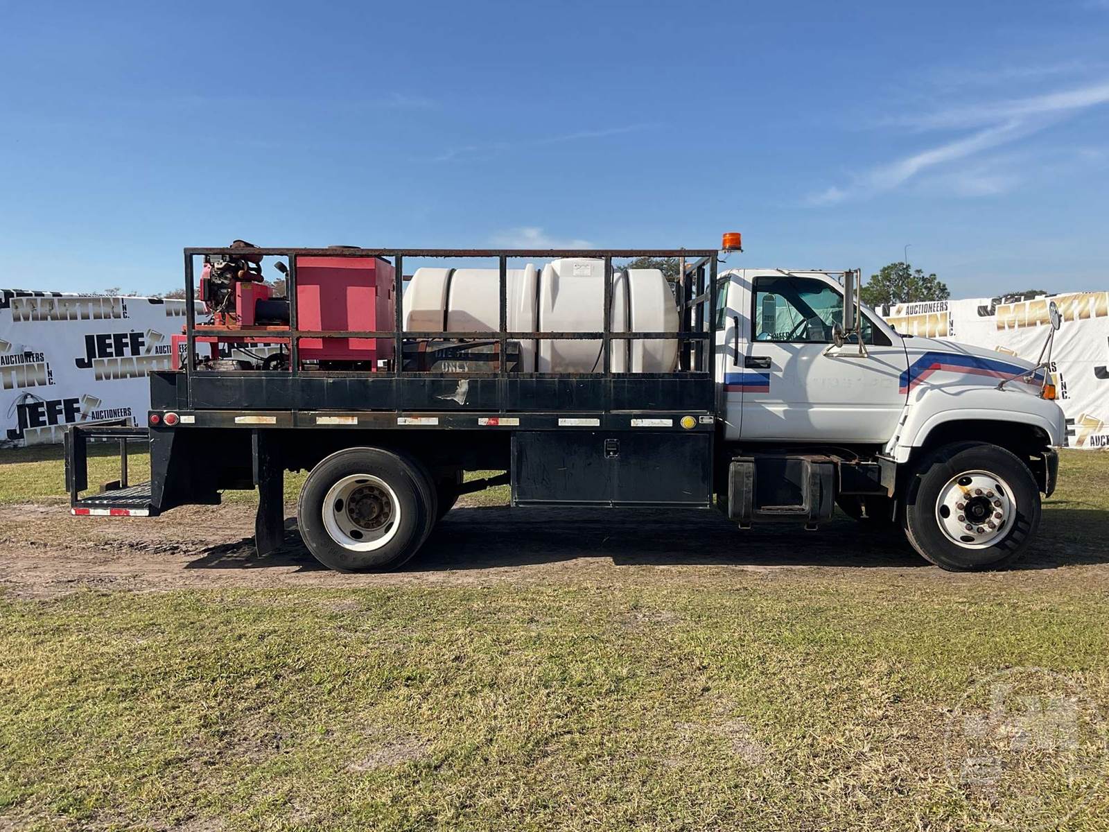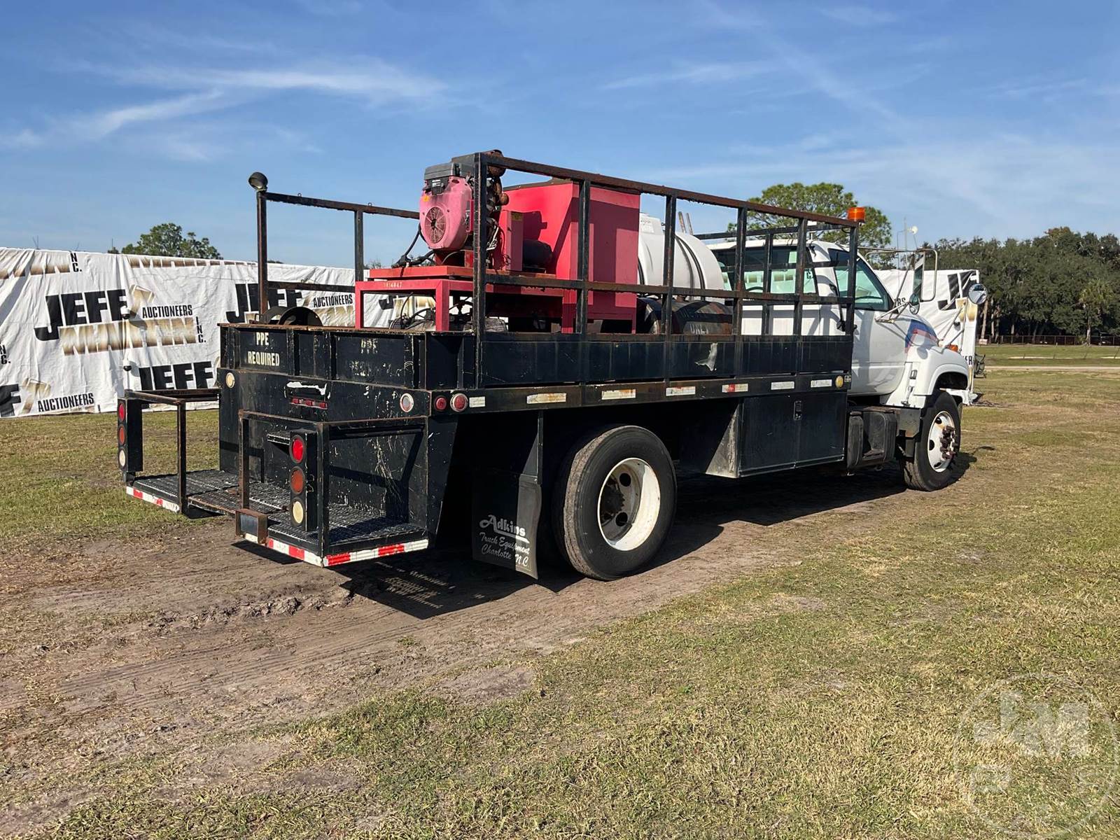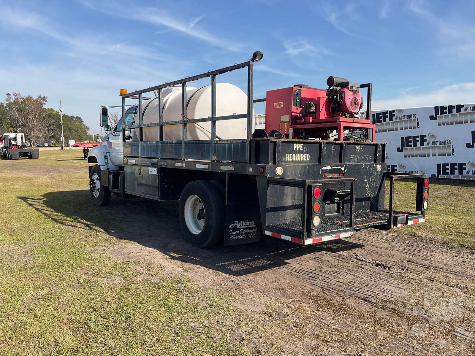 S/A HOT WATER PRESSURE WASHER TRUCK, CAT, C7, HP: 360, 6 SPEED, SPRING SUSP, WB 185", FRONTS 8100 LBS, REARS 17850 LBS, C/A: 110", SINGLE FRAME, WHEELS DISC WHEELS, 800 GAL POLY TANK, HONDA ENG, 16' ADKINS FLATBED BODYĆ , TIRES 10R22.5, ODOMETER READS: 91402